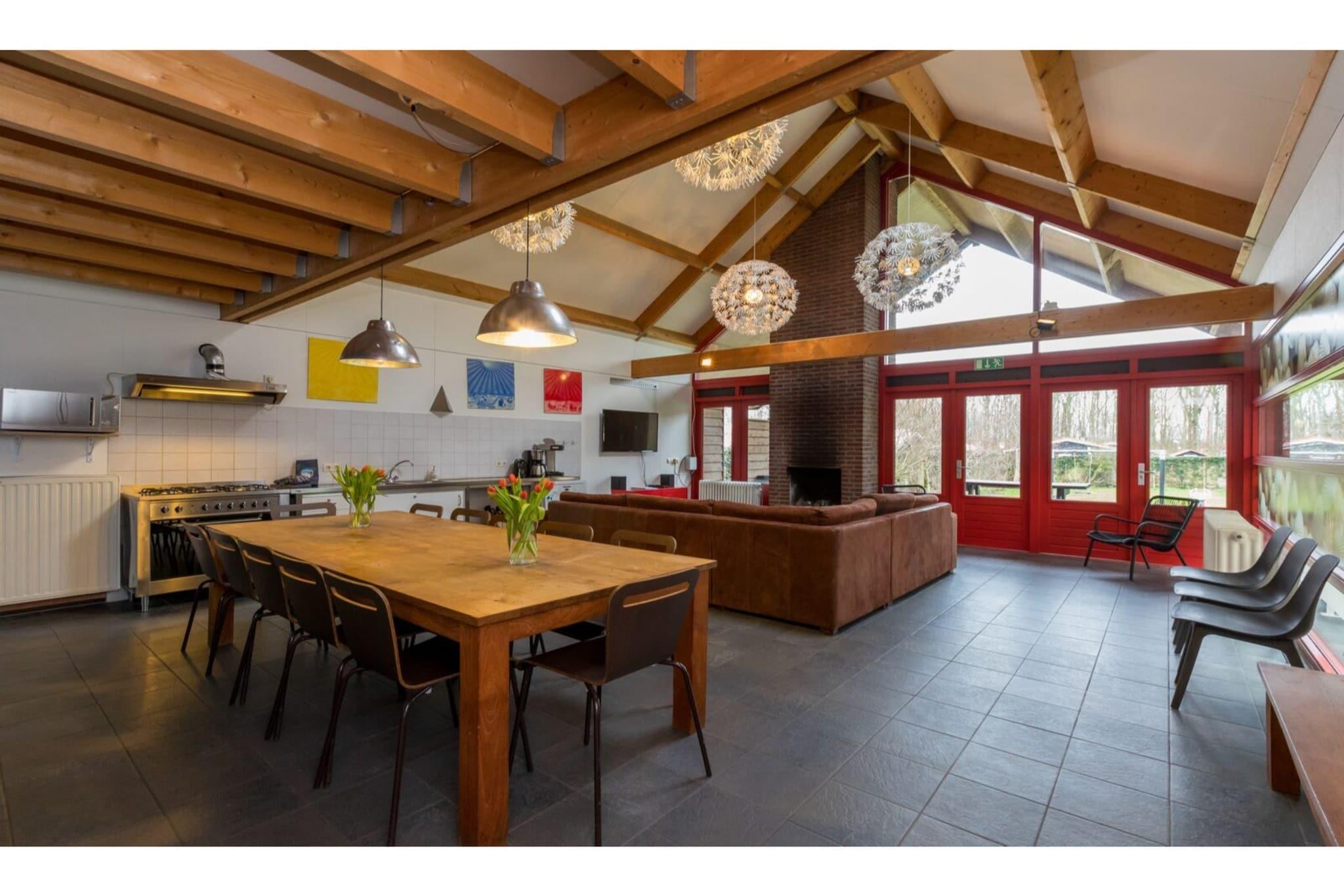 Stueetage: (Stue(Fjernsyn(fladskærm), pejs, sofahjørne), åbent køkken(spisebord, elkedel, kaffemaskine(kaffetragt), ovn, mikrobølgeovn, opvaskemaskine , køle-fryseskab), soveværelse(dobbeltseng), badeværelse(bruser, håndvask), badeværelse(bruser), pulterkammer(tørretumbler, vaskemaskine), toilet(tilpasset til handicappede), toilet) På 1. etage: (soveværelse(enkeltseng, enkeltseng, enkeltseng, enkeltseng, enkeltseng), soveværelse(2x enkeltseng), soveværelse(enkeltseng, enkeltseng, enkeltseng, enkeltseng, enkeltseng)) havedøre, have, havemøbler, parkering, legeredskaber