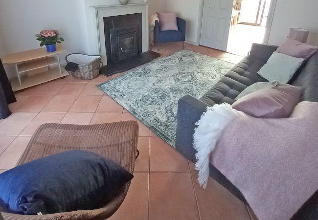 - Spacious living room with comfortable sofas, satellite television and wood burner stove.
