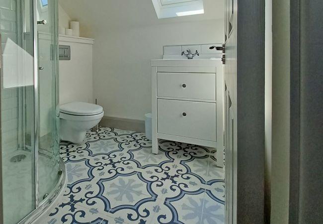 - Bathroom with shower cubicle, hand basin & toilet