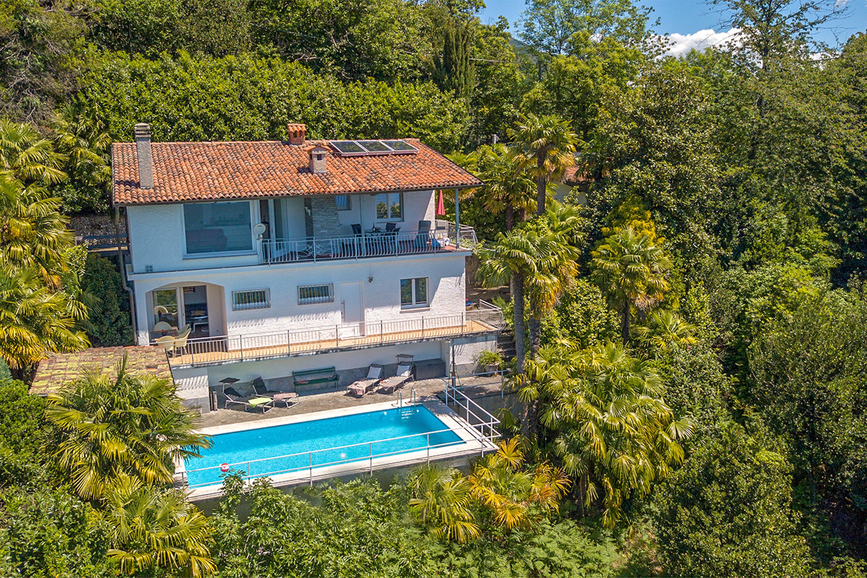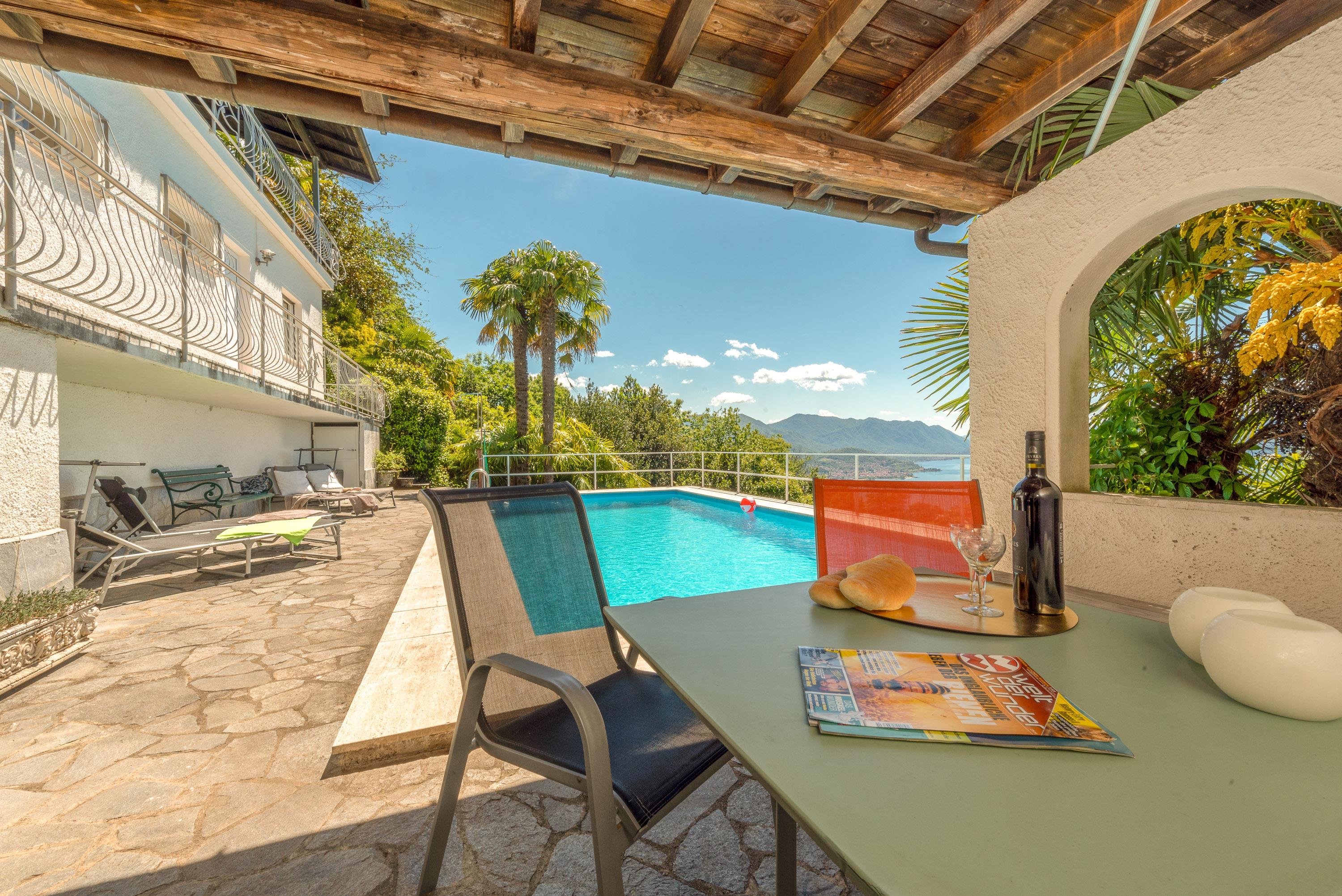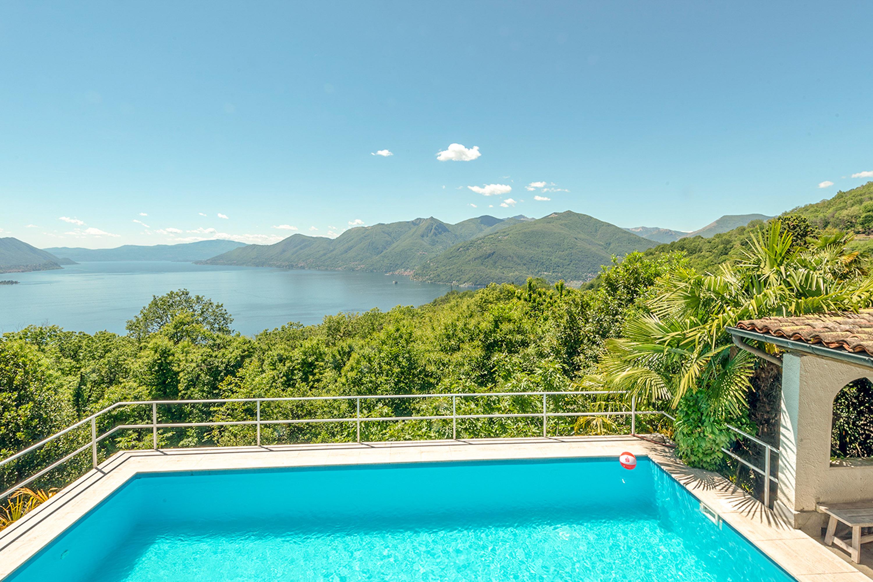 Thronen Sie über dem Lago Maggiore mit einer Aussicht, die sprachlos macht. Das ruhig gelegene Zweifamilienhaus liegt nach Süden und Westen ausgerichtet auf einem 1450 Quadratmeter sonnigen, terrassierten Grundstück mit vielen Palmen. Der Pool, der von Juni bis Ende September betrieben wird, ist 4x8 Meter groß und wird exklusiv von den beiden Wohnungen dieses Hauses genutzt. Die schattige Weinlaube direkt oberhalb des Pools lädt zum Verweilen ein. Nur 200 Meter vom Haus entfernt befindet sich ein reizender Bach in idyllischer Lage mit zahlreichen kleinen Wasserfällen.