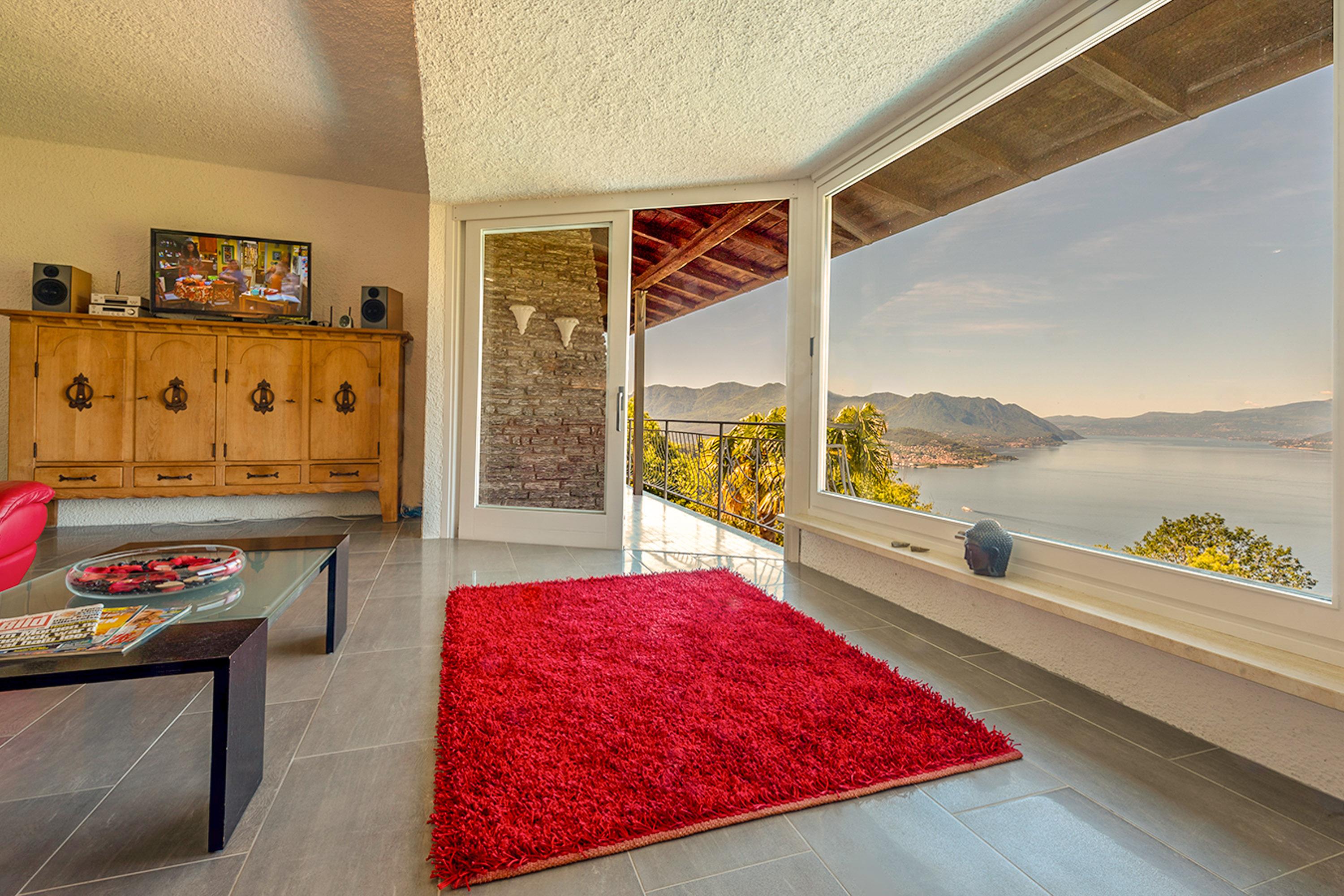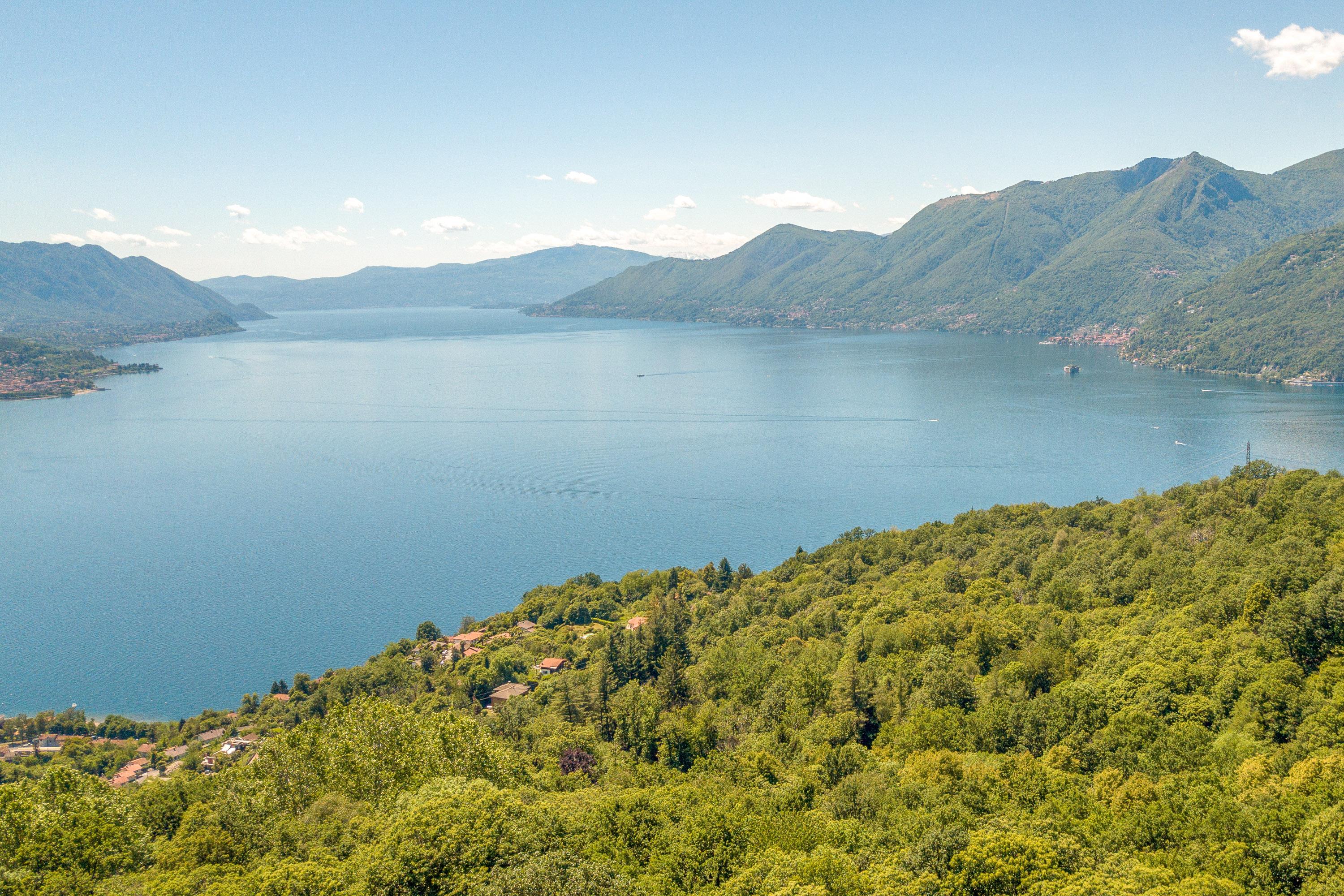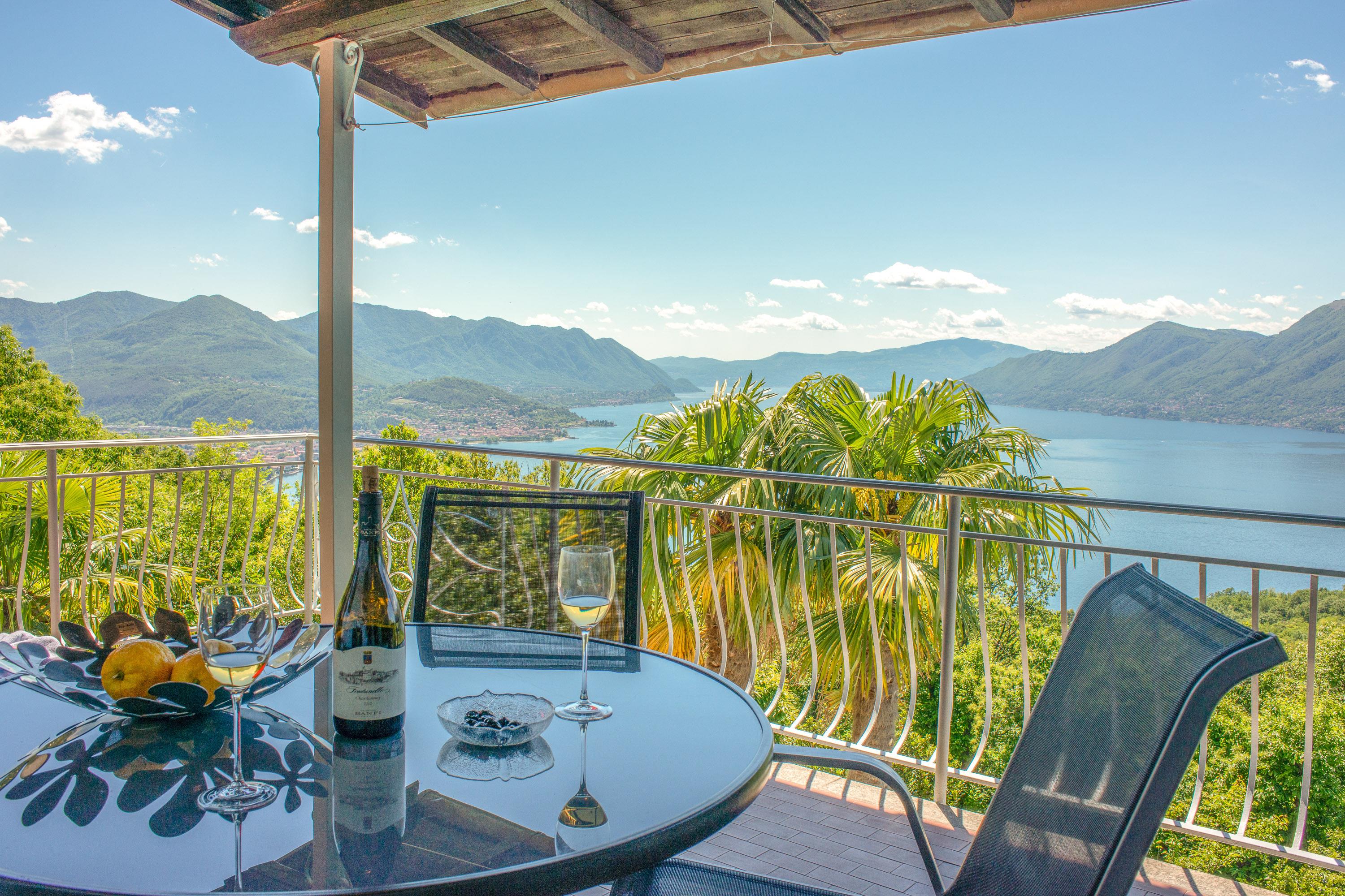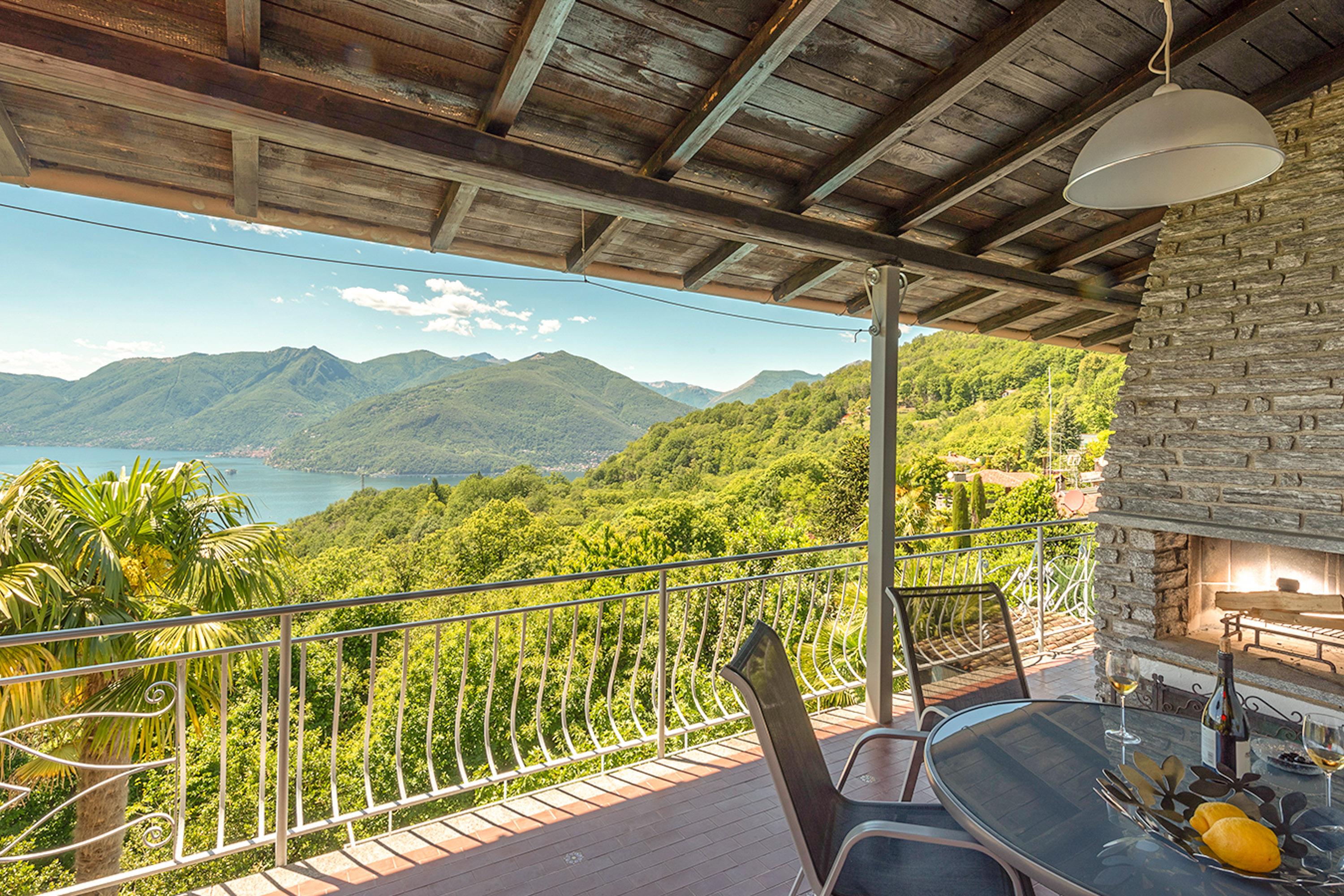 Thronen Sie über dem Lago Maggiore mit einer Aussicht, die sprachlos macht. Das ruhig gelegene Zweifamilienhaus liegt nach Süden und Westen ausgerichtet auf einem 1450 Quadratmeter sonnigen, terrassierten Grundstück mit vielen Palmen. Der Pool, der von Juni bis Ende September betrieben wird, ist 4x8 Meter groß und wird exklusiv von den beiden Wohnungen dieses Hauses genutzt. Die schattige Weinlaube direkt oberhalb des Pools lädt zum Verweilen ein. Nur 200 Meter vom Haus entfernt befindet sich ein reizender Bach in idyllischer Lage mit zahlreichen kleinen Wasserfällen.