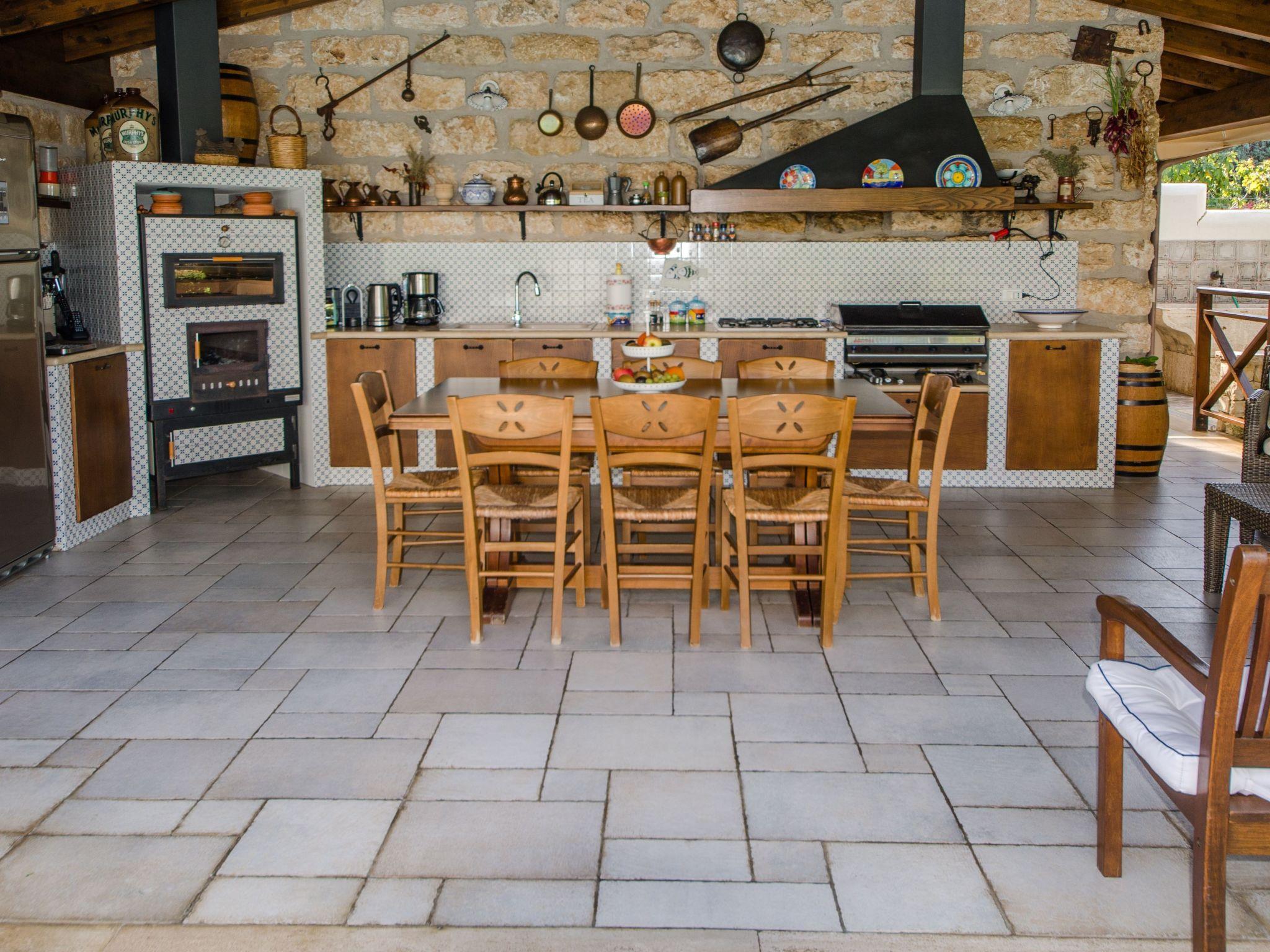 2 Kitchens (Indoor and Outdoor with BBQ), equipped with dishwasher, and many other appliances, TV, tables for 8 people extendable up to 14 people.