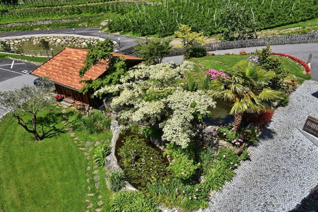Spend your holiday in our new, high-quality furnished holiday apartment with the latest Neff kitchen appliances, oven, 4-burner ceramic hob, dishwasher, refrigerator, and much more. Two bedrooms, two separate shower/WCs, an entrance hall, and a living room are located in one of the most beautiful landscapes in the Merano region, directly on hiking trails such as the Waalweg, Ochsentodweg, and Burgweg.