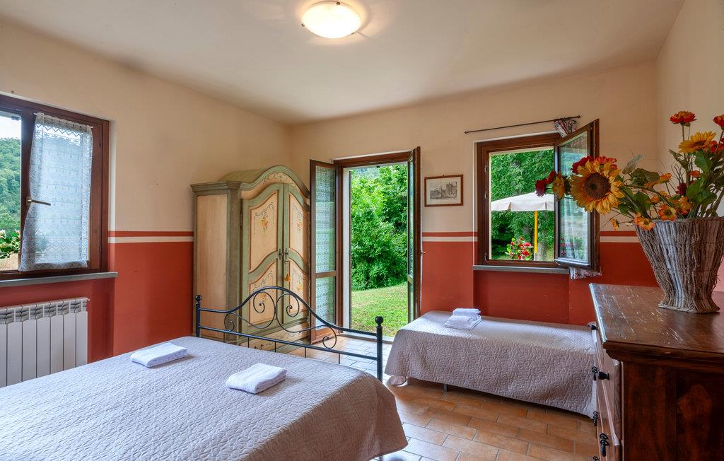 Denne ferielejlighed ligger på ejendommen Valguerriera, ca. 4 km fra Piobbico, i en dal i Apennin, det ideelle rejsemål til jer, hvis I ønsker jer en afslappende ferie i uberørt natur. Ejendommen består af herskabshuset og tre landhuse, de generøse udendørsområder og den dejlige, fælles pool på 17 x 10 m med undervandsmassage. I landhusene er der i alt 11 indbydende indrettede ferielejligheder. Lejligheden byder på en uafhængig indgang i eget udendørsområde med bord, stole og parasol, hvor I kan slappe af og spise jeres måltider i det fri. Grill og vaskemaskine til fælles brug. Parkering på grunden. En barneseng er til rådighed. Her bor I i Marche, ved grænsen til regionerne Toscana og Umbrien, i nærheden af Piobbico (Pesaro og Urbino), i en rolig dal ved navn Candigliano, en af de dejligste og mest oprindelige dale i baglandet af Pesaro, der byder på mildt klima og hvorfra I nyder en vidunderlig udsigt til Apennin. I omgivelserne venter der kunst- og renæssancebyer som Urbino, UNESCO-verdenskulturarv, fortryllende middelalderlandsbyer som Piobbico, Apecchio, Sant’Angelo in Vado og Acqualagna, kendt for trøflerne, samt Urbania, Cagli, San Marino, Gradara og San Leo. Ejendommens beliggenhed er også fordelagtig til lidt længere dagsture som til Gubbio, Assisi, Perugia, Città di Castello, Arezzo, San Sepolcro, Loreto, Florenz og Siena, der alle rummer stort kunsthistorisk relevans, eller til San Marino, til borgen af Gradara, grotterne af Frasassi eller til Furlopasset. Afstande: 4 km Piobbico (dagligvarer og andre indkøb, bank, apotek, læge), 30 km Urbino, 55 km Fano og strandene langs Adriaterhavet, som I når på omkring en times kørsel. 6 km til wellnesscenter og 10 km til ridebane. Mulighed for guidede ture.