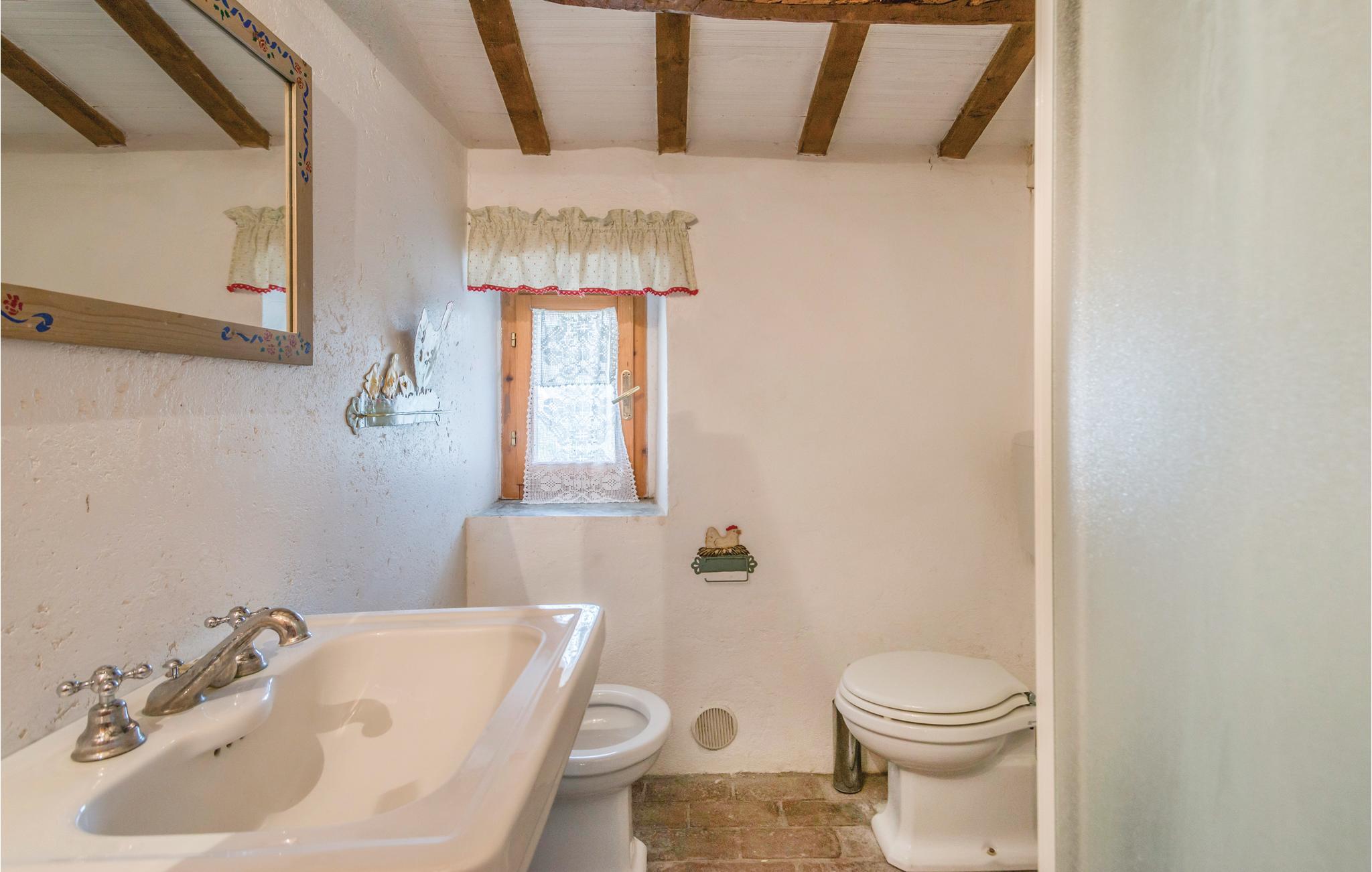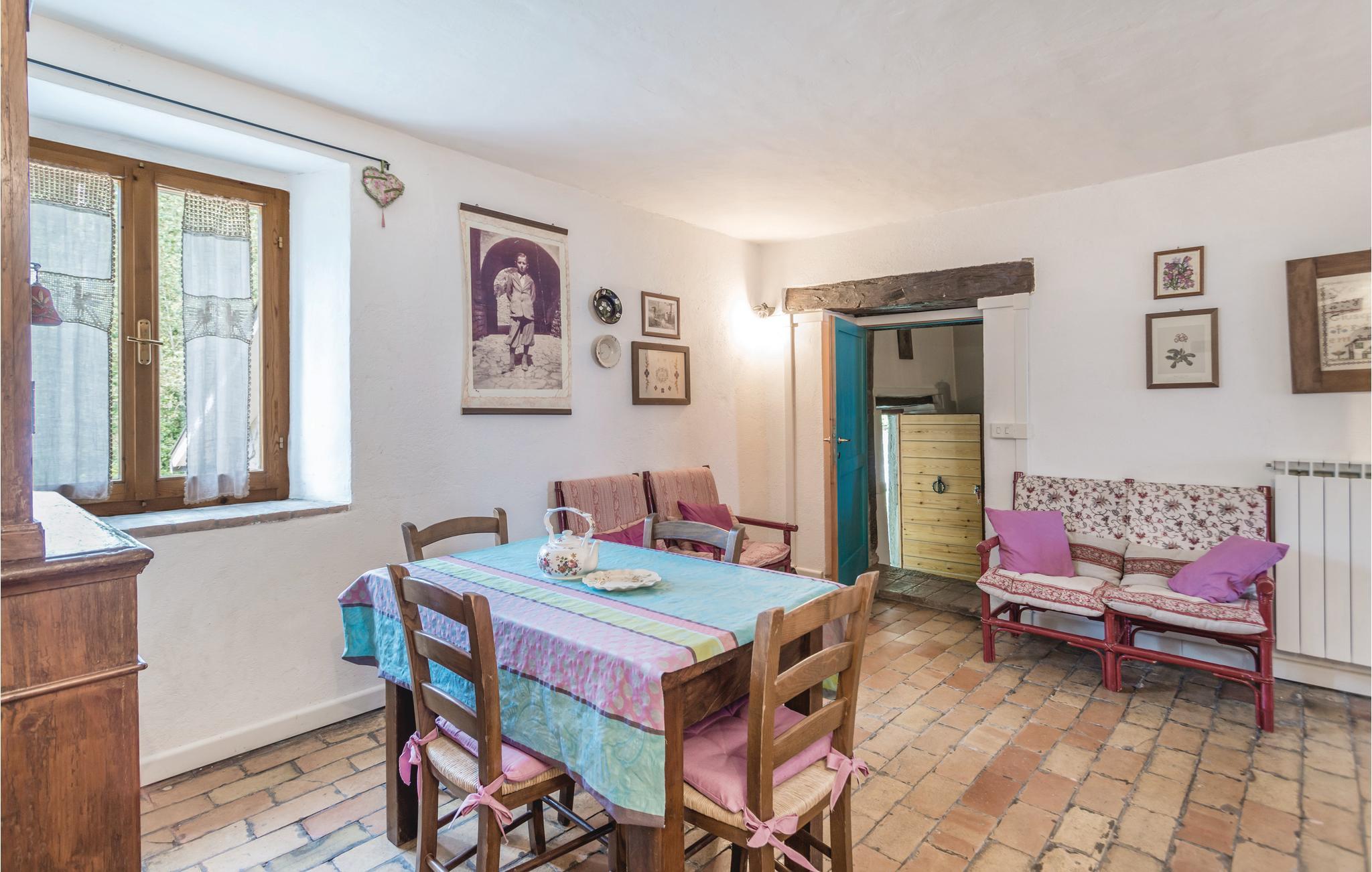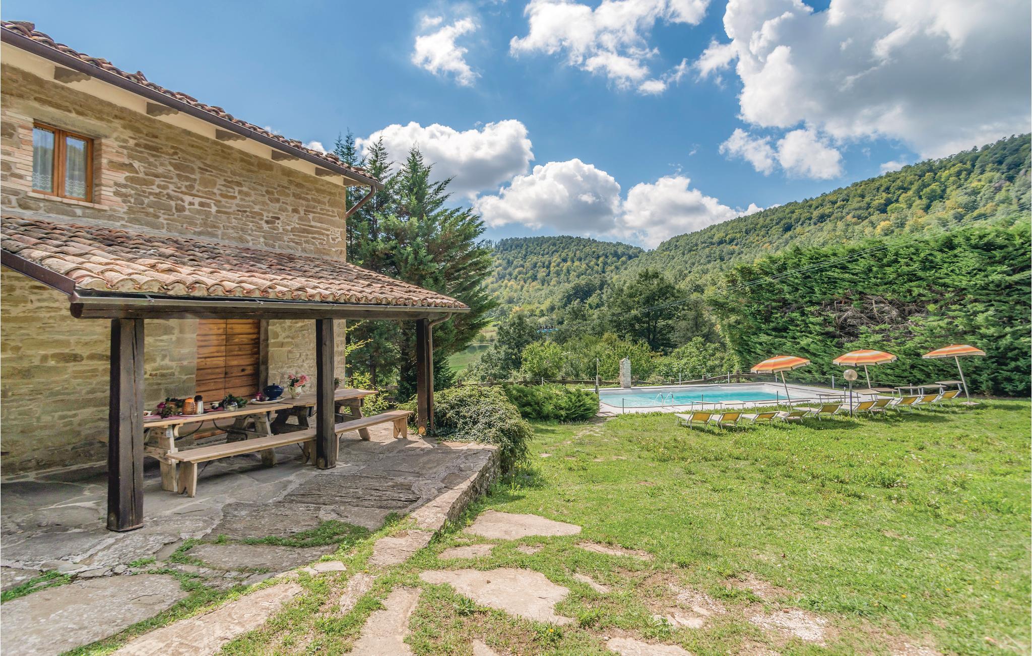 Denne store bondegård er bygget i egnstypisk stil, som blevet bevaret under renoveringen. Den ligger midt i det bjergrige umbriske område Appenninerne (700 m over havets overflade). Der er en fantastisk panoramaudsigt over det omkringliggende landskab, der er prydet af bjerge. På gårdens store grund er der en stort møbleret udendørs-areal, og en lille skov, man kan gå ture i. Ved siden af huset ligger der en swimmingpool. Huset egner sig især for børnefamilier eller mindre grupper, der gerne vil holde ferie sammen, tæt på naturen. De gæstfrie ejere ejer et rekreationscenter (spa, swimmingpool, fitness), der ligger ca. 20 km væk. Huset er på flere etager, og har flere indgange. I stueplan er der to stuer en suite, det ene med pejs fra det 15. århundrede, og det andet med tv. Adgang til en lille terrasse der er oplagt at spise morgenmad på, spisestue (adgang udefra), ved siden af rummeligt køkken (stort køleskab, ovn, gasgrill, fryser og opvaskemaskine). 2 soveværelser med dobbeltsenge (det ene med udgang til overdækket terrasse), 1 soveværelse med to enkeltsenge, 2 soveværelser med etagesenge, 1 badeværelser med brusebad, samt et wc der ligger ved siden af poolen. Høj stue (parterre) med adgang udefra: 1 soveværelse med dobbeltseng, 1 badeværelse med brusebad, 4 trin op, under et skråtag: gennemgangsrum med sofa og bord, 1 soveværelser med dobbeltseng (loftshøjde 2, 2,5 m). wc, to badeværelser med brusebad. I lille tårn: skønt soveværelse med dobbeltseng samt med enkeltseng (godt til unge mennesker). Enkel men godt gennemtænkt indrettet. Barneseng og stol på forespørgsel. Afstande: ca. 45 km universitetsbyen Urbino, en af mest interessante byer i Marken, samt samme afstand til Gubbio som regnes som den skønneste by i Umbrien. Andre afstande: Città di Castello 27 km, Arezzo 60 km, adriaterhavskystens skønneste sandstrande (Fano) 70 km (gode forbindelser). Forretninger af alle slags, tennisbane og supermarked 2 km, i 5 km omkreds mange pizzeriaer og forretninger.
