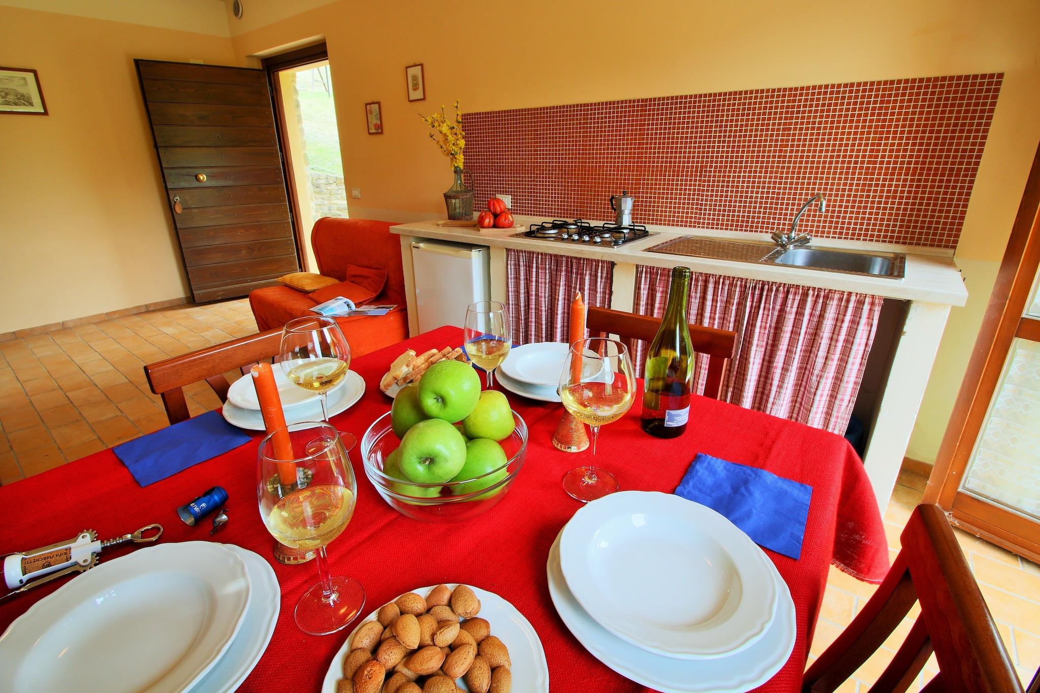 På denne ejendom er der 3 renoverede huse med 11 lejligheder. Hver lejlighed har sin egen terrasse med havemøbler. Husene ligger langt fra hinanden, og derfor er der meget privatliv. Lejlighed Il Grano ligger ved siden af swimmingpoolen og er velegnet til 5 personer. Ejendommen ligger på grænsen mellem Umbrien og Marche i Candigliano-dalen, mellem byerne Piobbico, Apecchio, Urbania og Sant"Angelo i Vado. Du kan nemt besøge Urbino, Gubbio, Assisi og Perugia. Derudover kan du tage til mountainbike eller vandreture i områdets bjerge. Apartment il Grano ligger i det rustikke hus ved siden af swimmingpoolen. Det er hyggeligt og hjemligt indrettet. Det har 1 separat soveværelse og en dobbelt sovesofa i stuen. Ved ankomsten modtager du en flaske vin. Om sommeren arrangeres en gratis smagning hver uge i hovedhuset. Ejendommen kan nås via en grusvej på ca. 4 km.