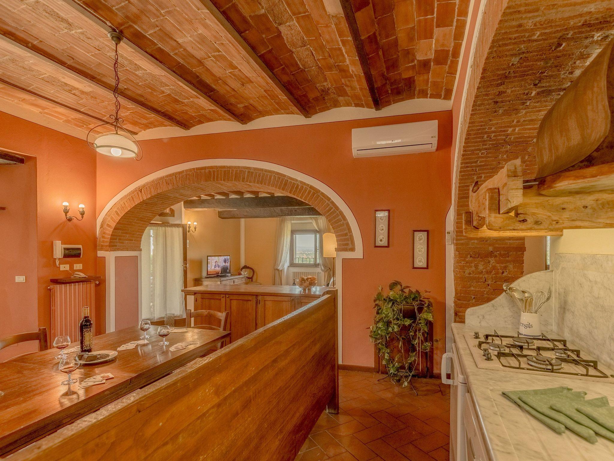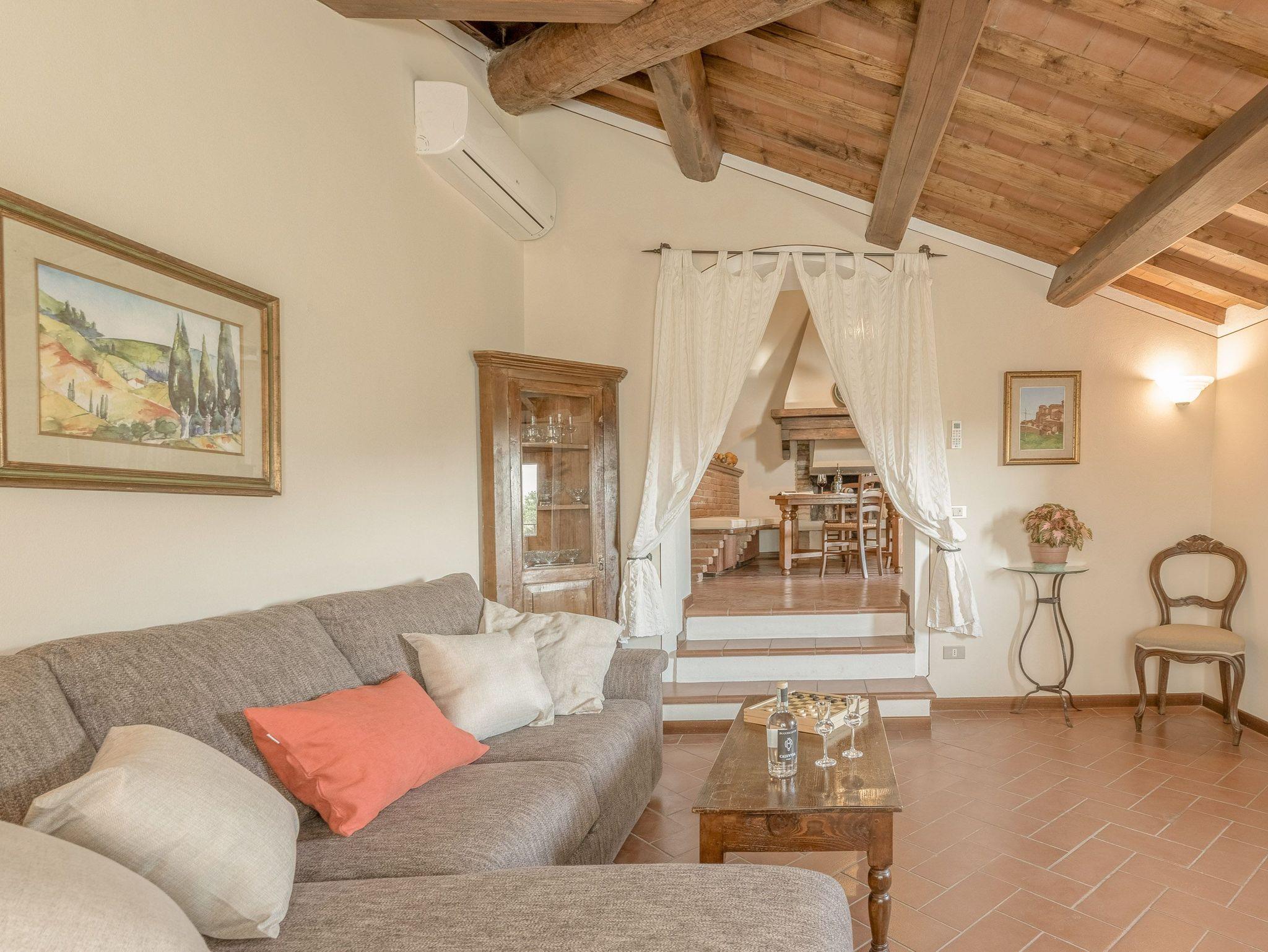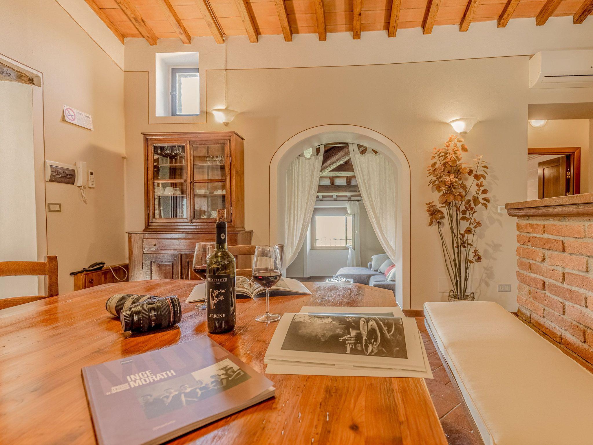 Im ersten Stock gelegen, bietet diese Wohneinheit ebenfalls 95 Quadratmeter Wohnfläche. Sie besteht aus einem Wohnzimmer mit Schlafsofa für zwei Personen, einem Fernseher, WLAN-Verbindung und einer gut ausgestatteten Küche mit Elektroherd, Kühlschrank und Geschirrspüler. Der Essbereich bietet Platz für 8 Personen und verfügt über einen Kamin. Ein Doppelzimmer mit eigenem Bad mit Badewanne, ein Zweibettzimmer, ein weiteres Badezimmer mit Badewanne und eine Waschküche mit Waschmaschine sind ebenfalls vorhanden. Die Wohnung verfügt über eine unabhängige Zentralheizung und Klimaanlage. Der Zugang erfolgt über eine hübsche Loggia mit Essbereich für 6 bis 8 Personen, die die Möglichkeit bietet, beim Frühstück das wunderschöne Panorama und die intensiven Düfte der toskanischen Landschaft zu genießen.