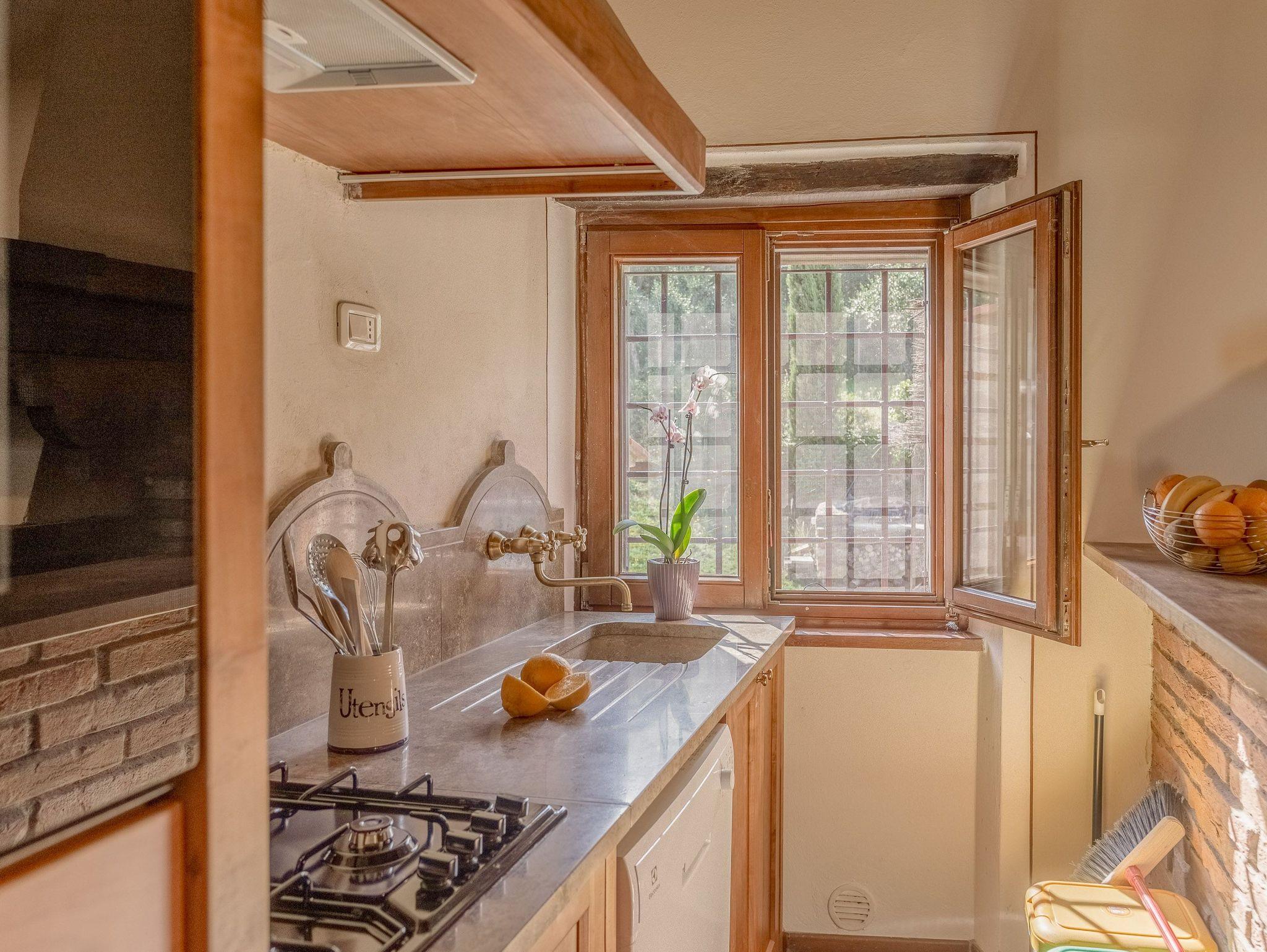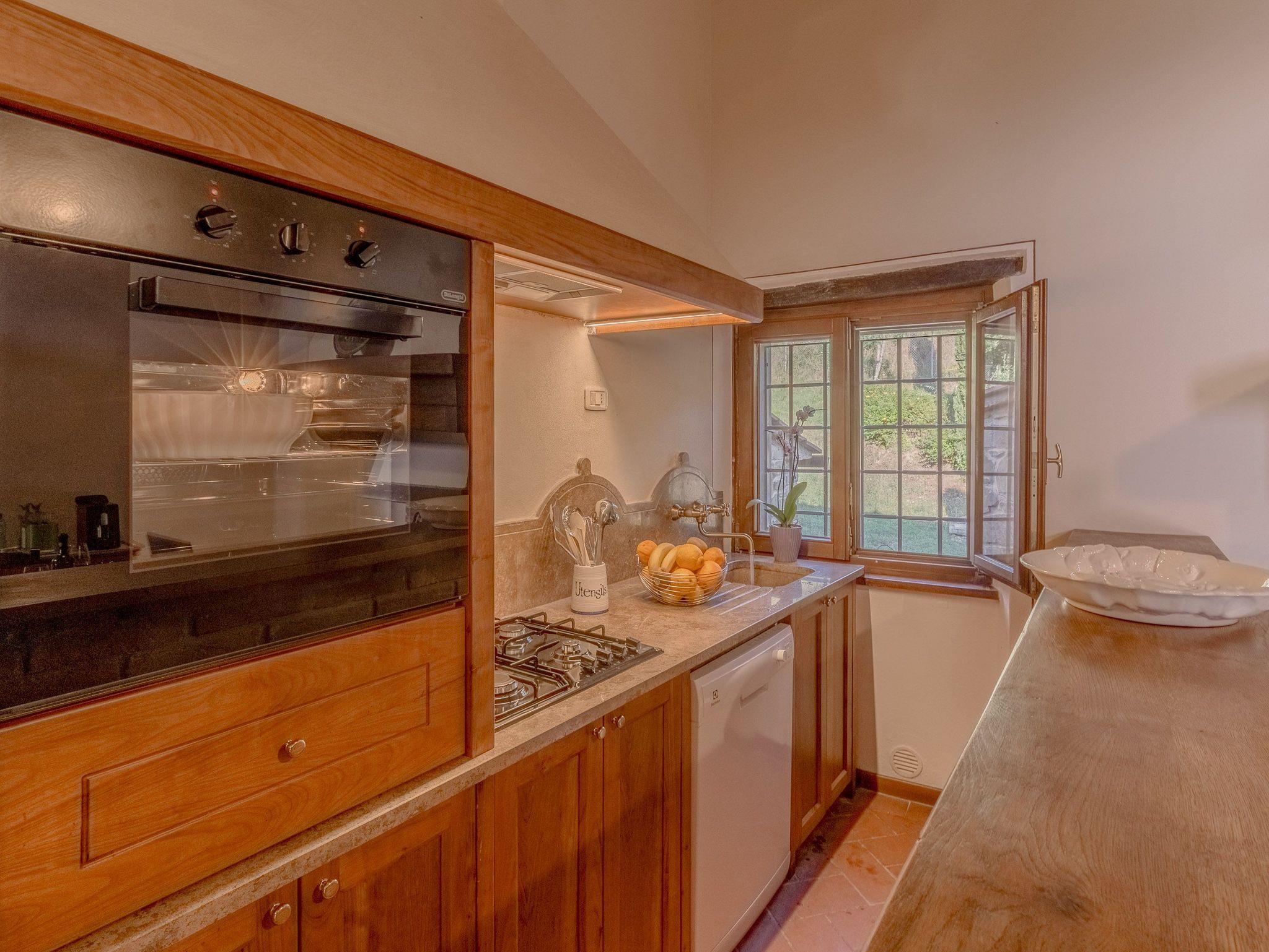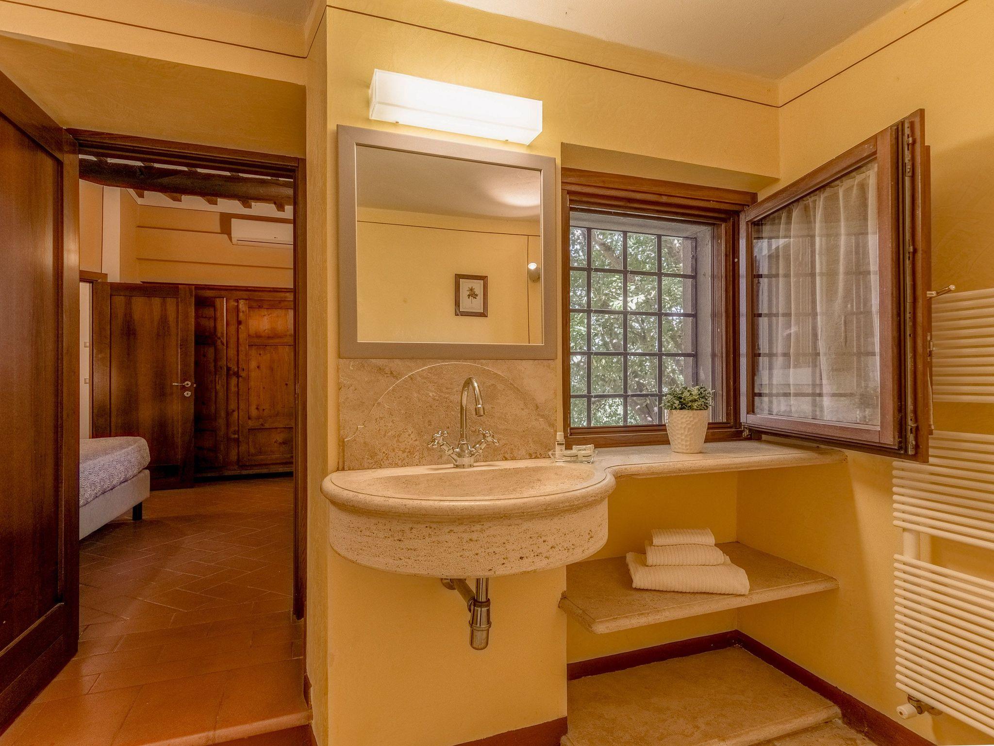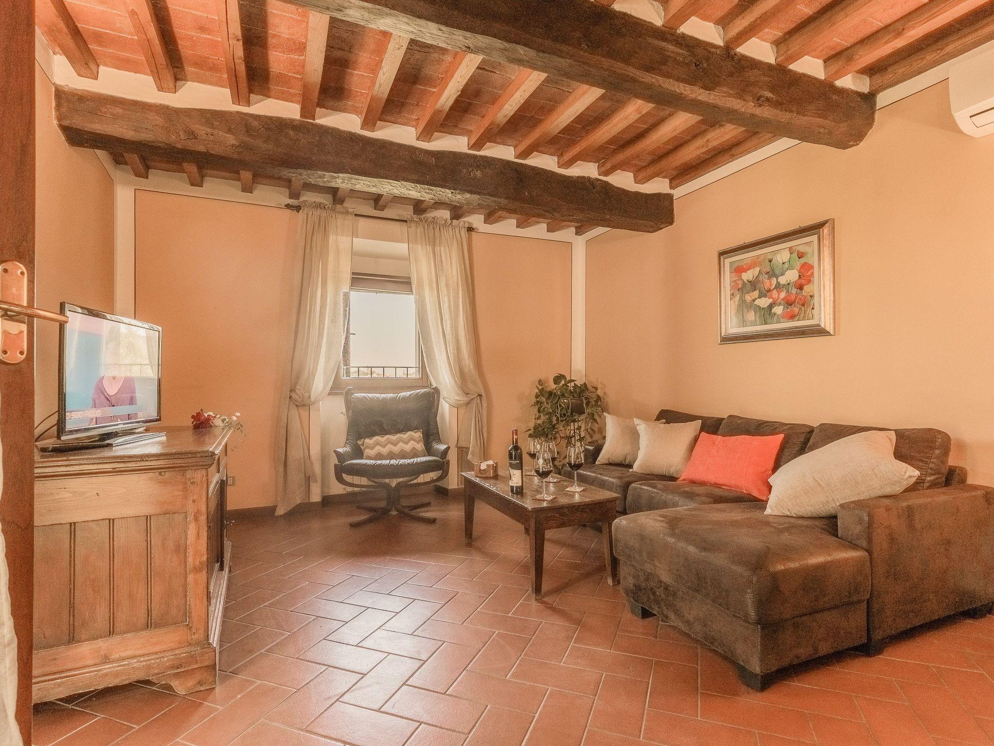 Im ersten Stock gelegen, bietet diese Wohneinheit ebenfalls 95 Quadratmeter Wohnfläche. Sie besteht aus einem Wohnzimmer mit Schlafsofa für zwei Personen, einem Fernseher, WLAN-Verbindung und einer gut ausgestatteten Küche mit Elektroherd, Kühlschrank und Geschirrspüler. Der Essbereich bietet Platz für 8 Personen und verfügt über einen Kamin. Ein Doppelzimmer mit eigenem Bad mit Badewanne, ein Zweibettzimmer, ein weiteres Badezimmer mit Badewanne und eine Waschküche mit Waschmaschine sind ebenfalls vorhanden. Die Wohnung verfügt über eine unabhängige Zentralheizung und Klimaanlage. Der Zugang erfolgt über eine hübsche Loggia mit Essbereich für 6 bis 8 Personen, die die Möglichkeit bietet, beim Frühstück das wunderschöne Panorama und die intensiven Düfte der toskanischen Landschaft zu genießen.