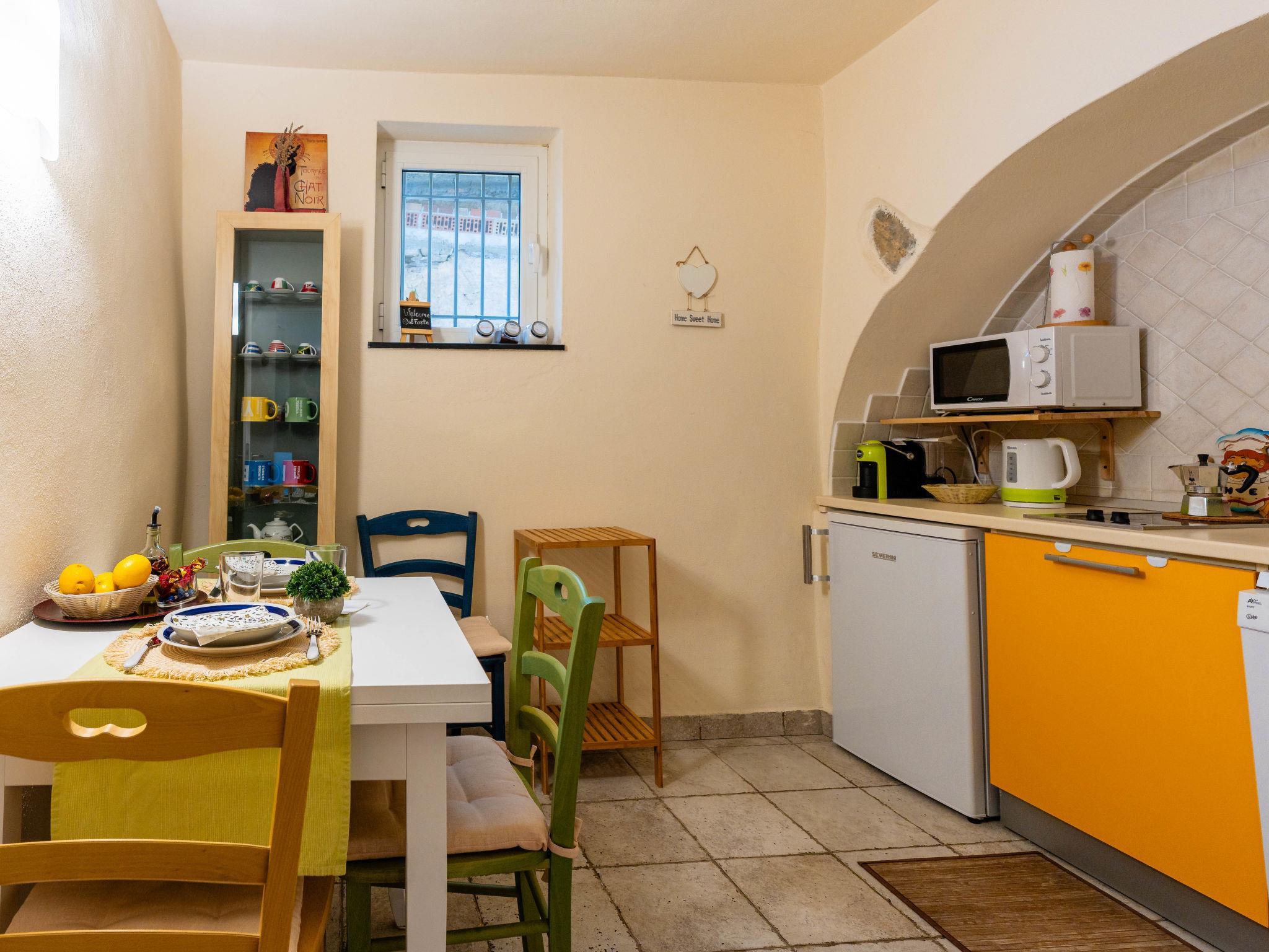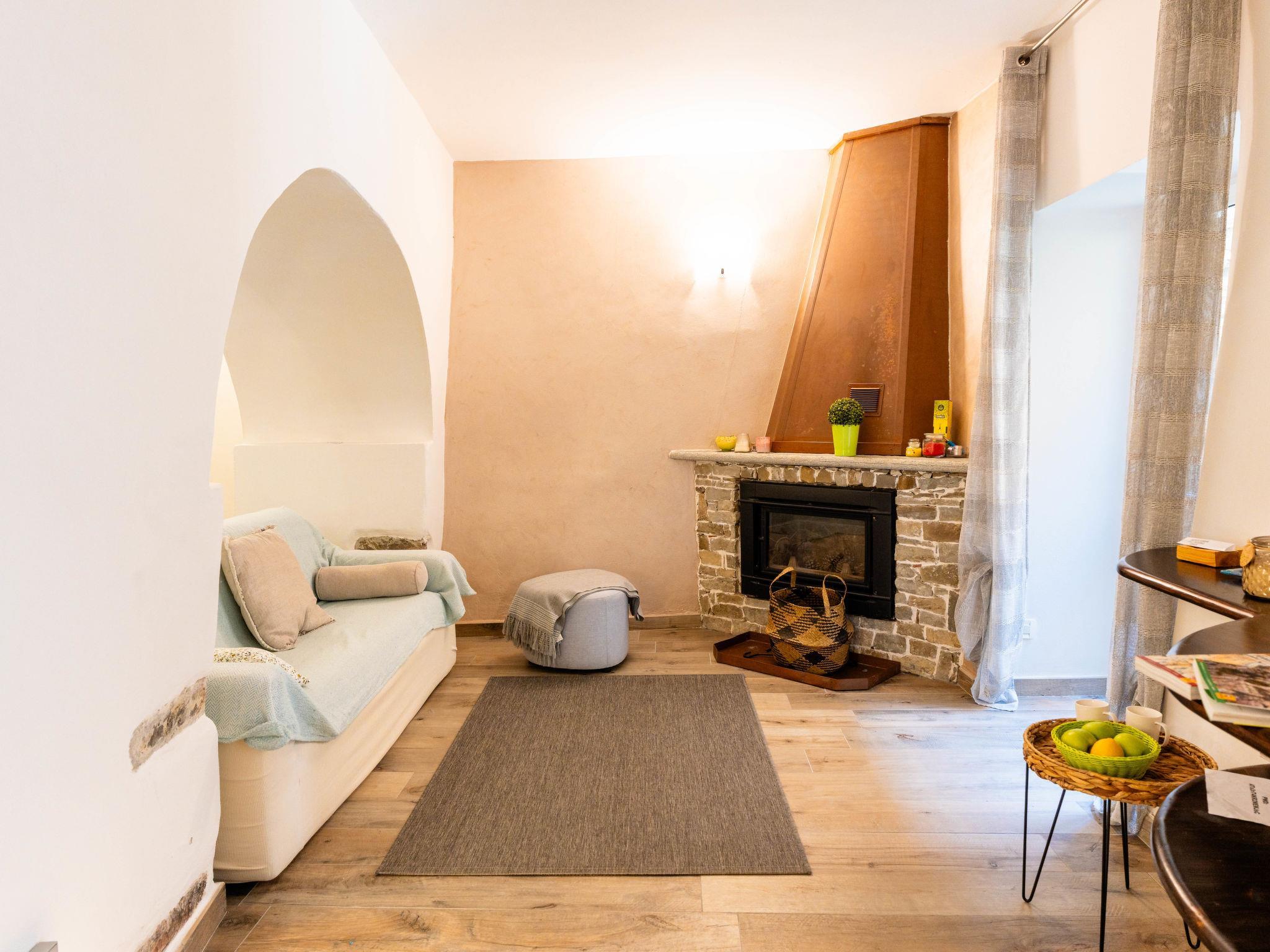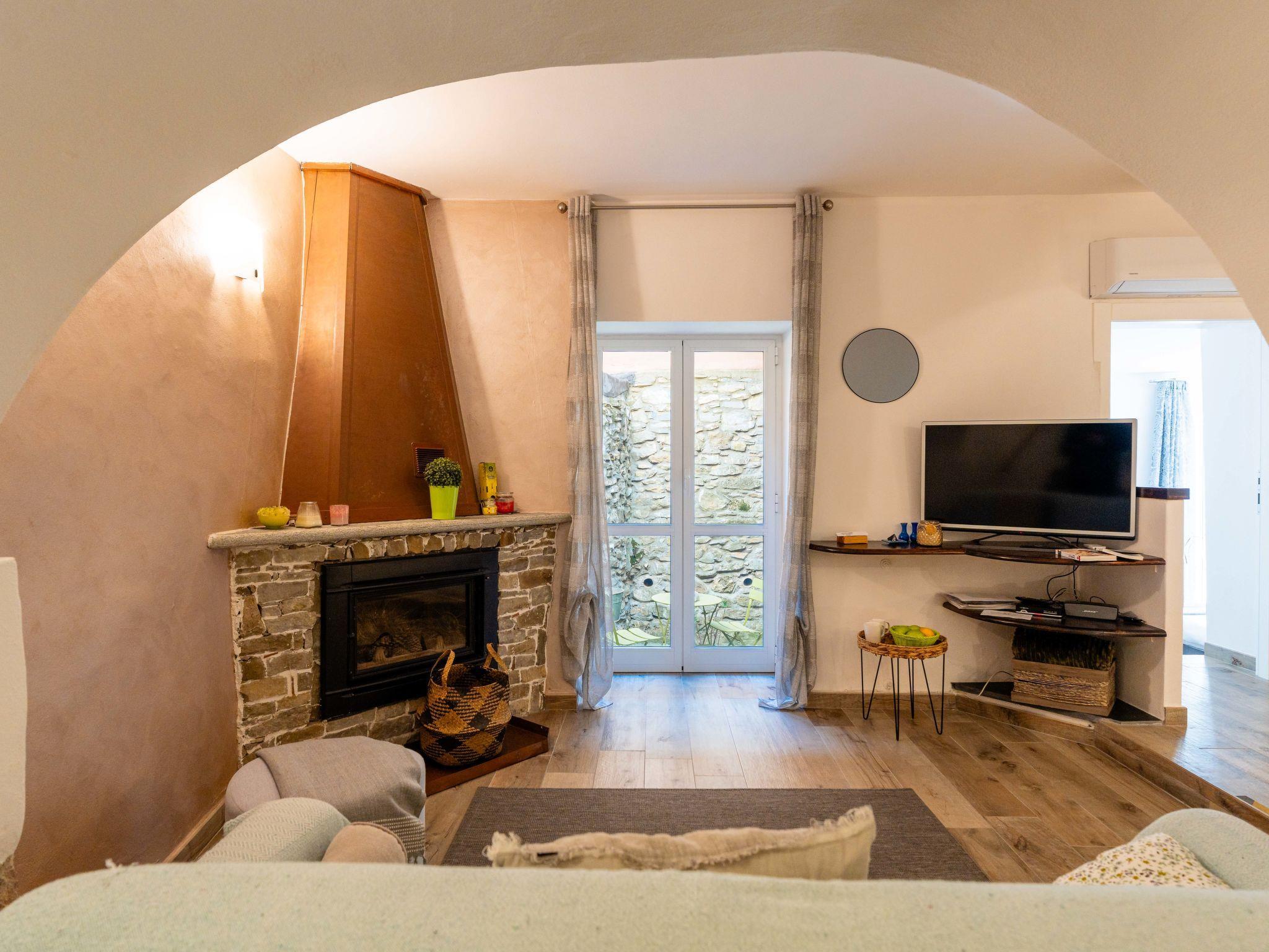 "Al Forte", 2-room apartment on the ground floor. Comfortable and rustic furnishings: living room, window onto the courtyard with 1 double sofabed and open-hearth fireplace (only for decoration), TV and air conditioning. Exit to the patio. 1 double bedroom. Exit to the terrace. Kitchen (oven, dishwasher, 2 induction hot plates, kettle, microwave, electric coffee machine) with dining table. Shower/bidet/WC. Gas heating (extra), air-conditioning, forced-air heating. Heating available only from 15.10. to 15.04. Natural stone floors. Terrace. Terrace furniture. Panoramic view of the sea and the mountains. Facilities: baby cot, hair dryer. Internet (WiFi, free). Please note: smoke alarm, fire extinguisher. IT009007C2YLLS6MGY