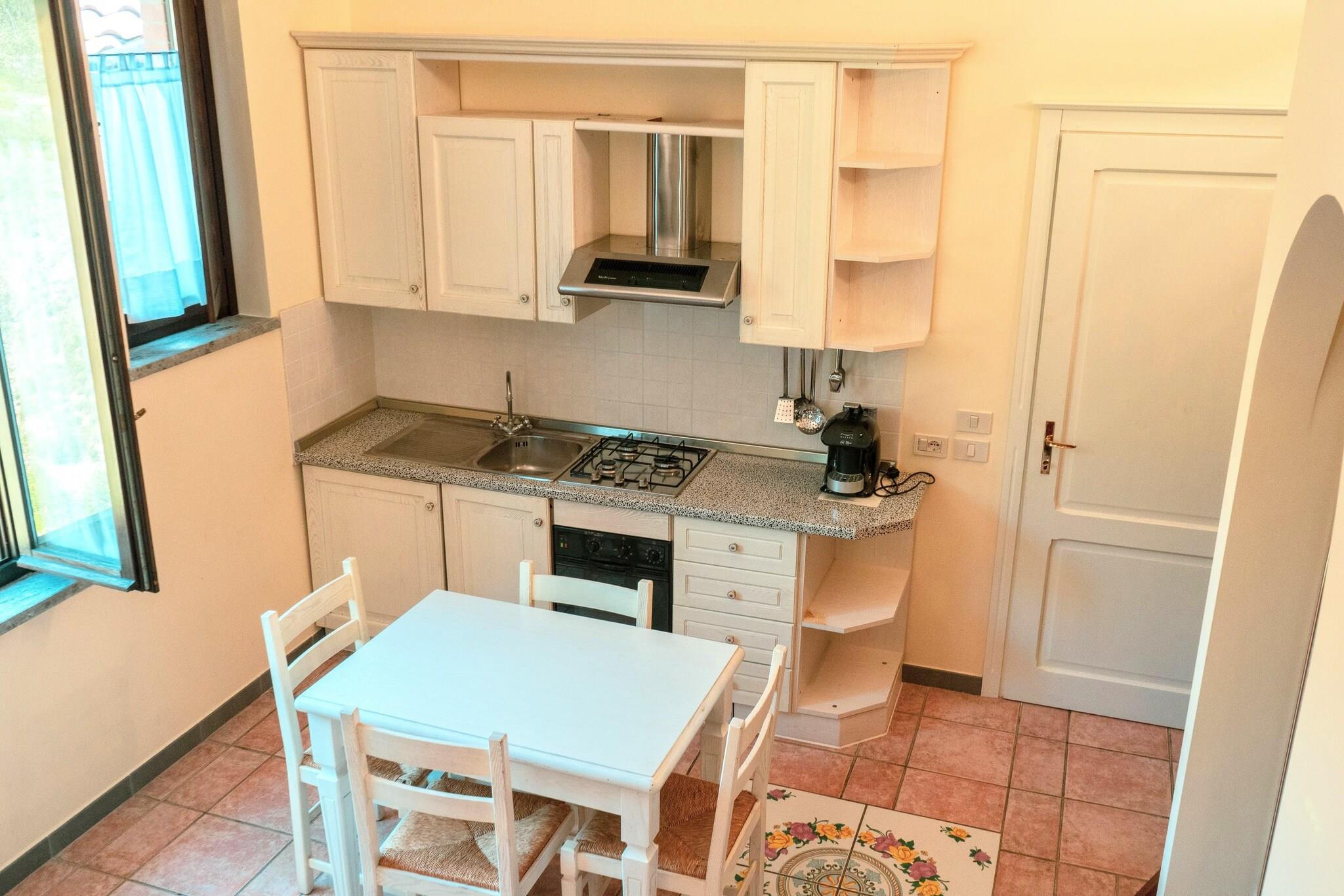 Åbent køkken(kogeplade, espressomaskine, ovn, køleskab, ), Stue/soveværelse(dobbeltsovesofa, Fjernsyn), soveværelse(dobbeltseng), badeværelse(bruser, håndvask, toilet, ), klimaanlæg, have, havemøbler, swimmingpool(deles med andre gæster), strygebræt, strygejern
