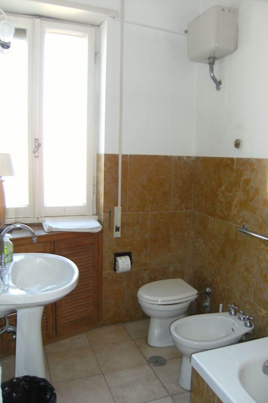 The quiet and light-flooded flat (approx. 75 sqm) with windows on 3 sides is located on the 4th floor (a new lift has been available since 2011!) of a small apartment building and is attractively furnished: large living/dining room with access to the terrace, large satelliteTV, dvd player, ceiling fan, new double sofa bed, another 3-seater couch and 2 armchairs, large bedroom with ceiling fan, kitchen (***) with dishwasher and washing machine, view of S. Pietro and exit to terrace, bathroom (with bathtub, hairdryer). The furnishings are good and very well maintained, beautiful parquet floors, central heating (gas).