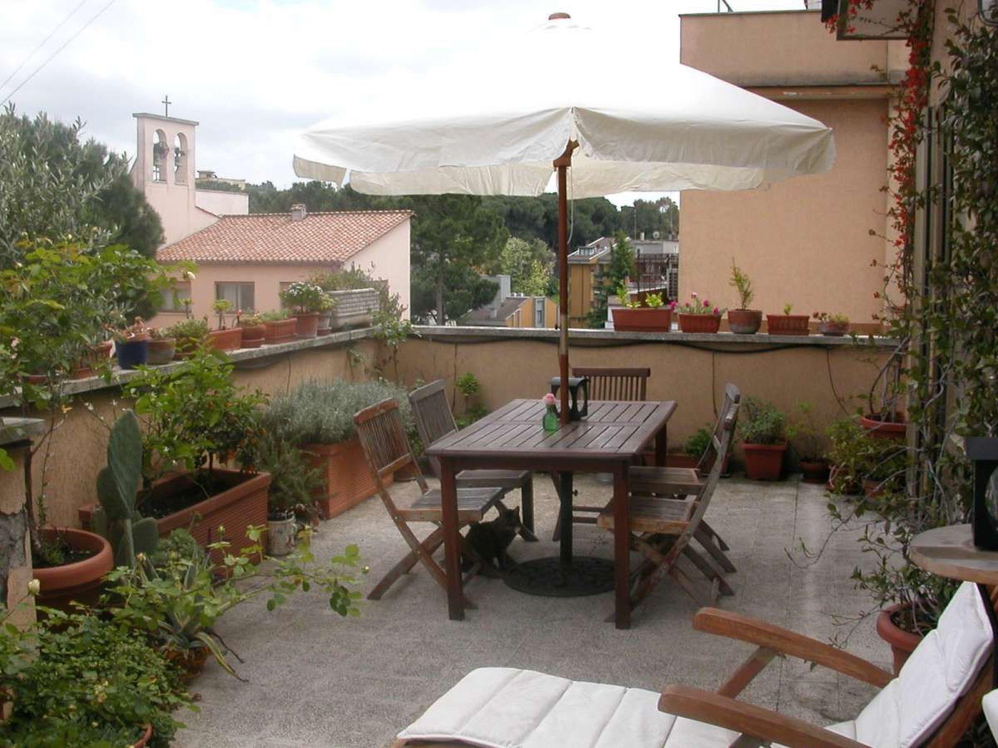 The holiday flat - an attic with a large roof terrace - is located in a very good and relatively quiet residential area with a stunning view of Rome's main church, San Pietro.