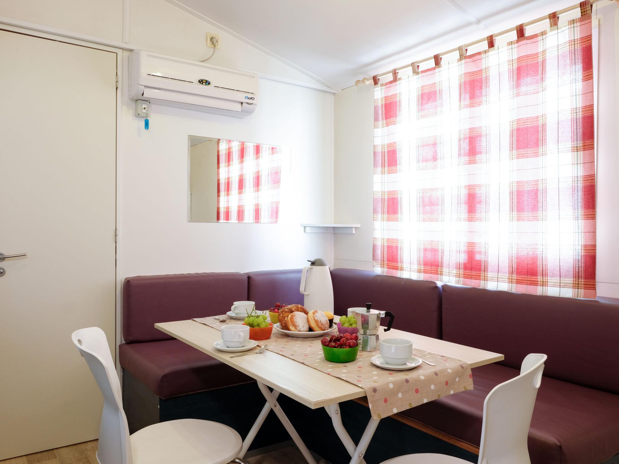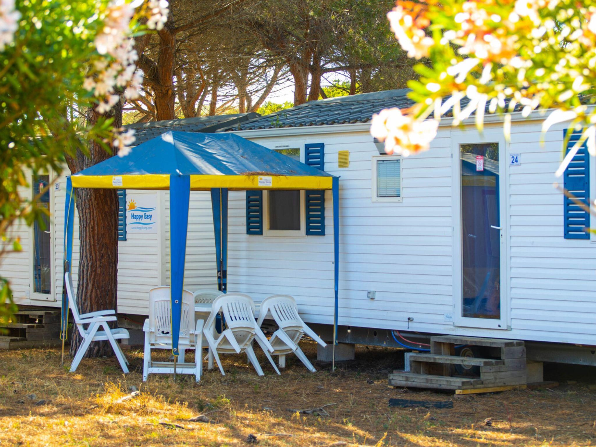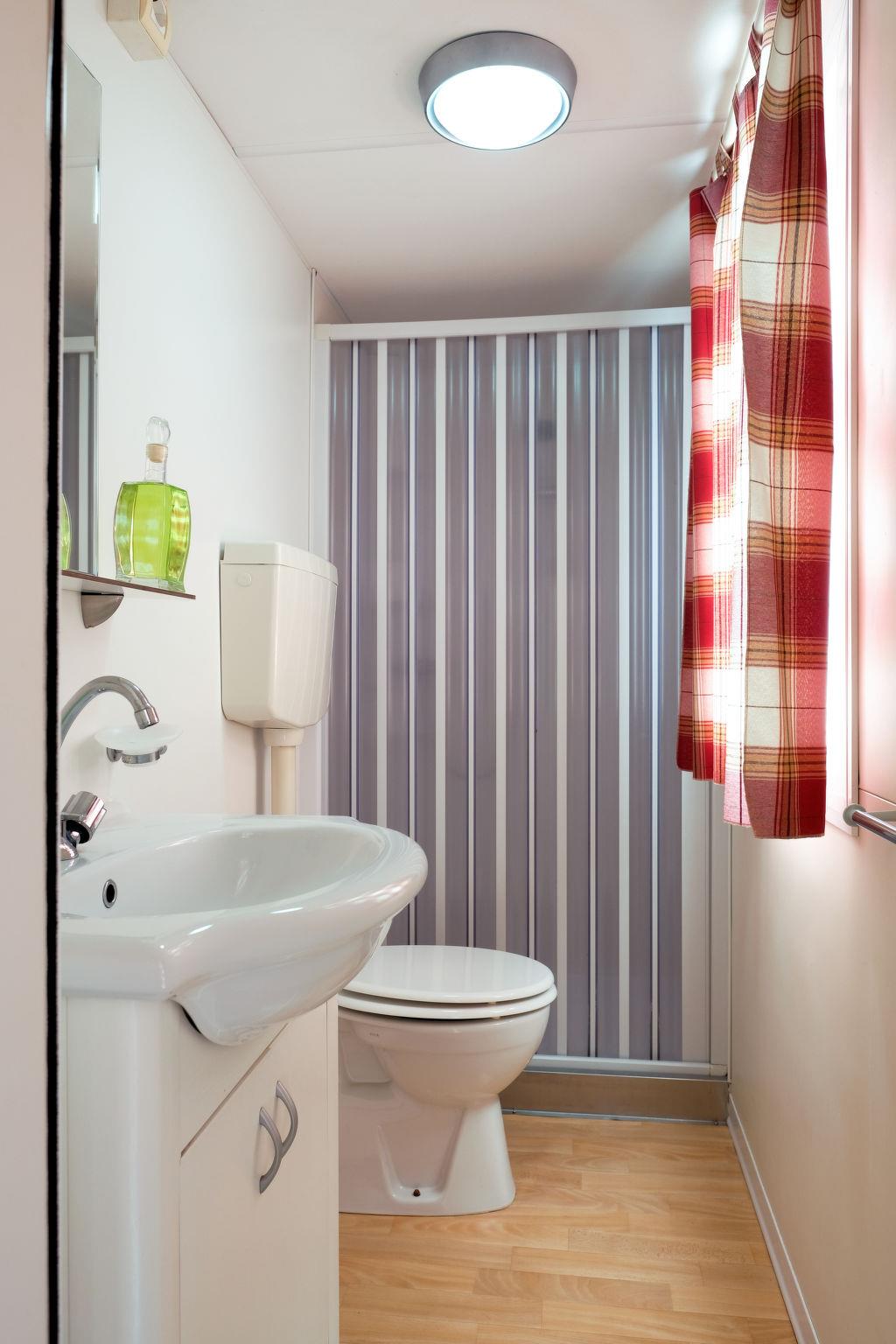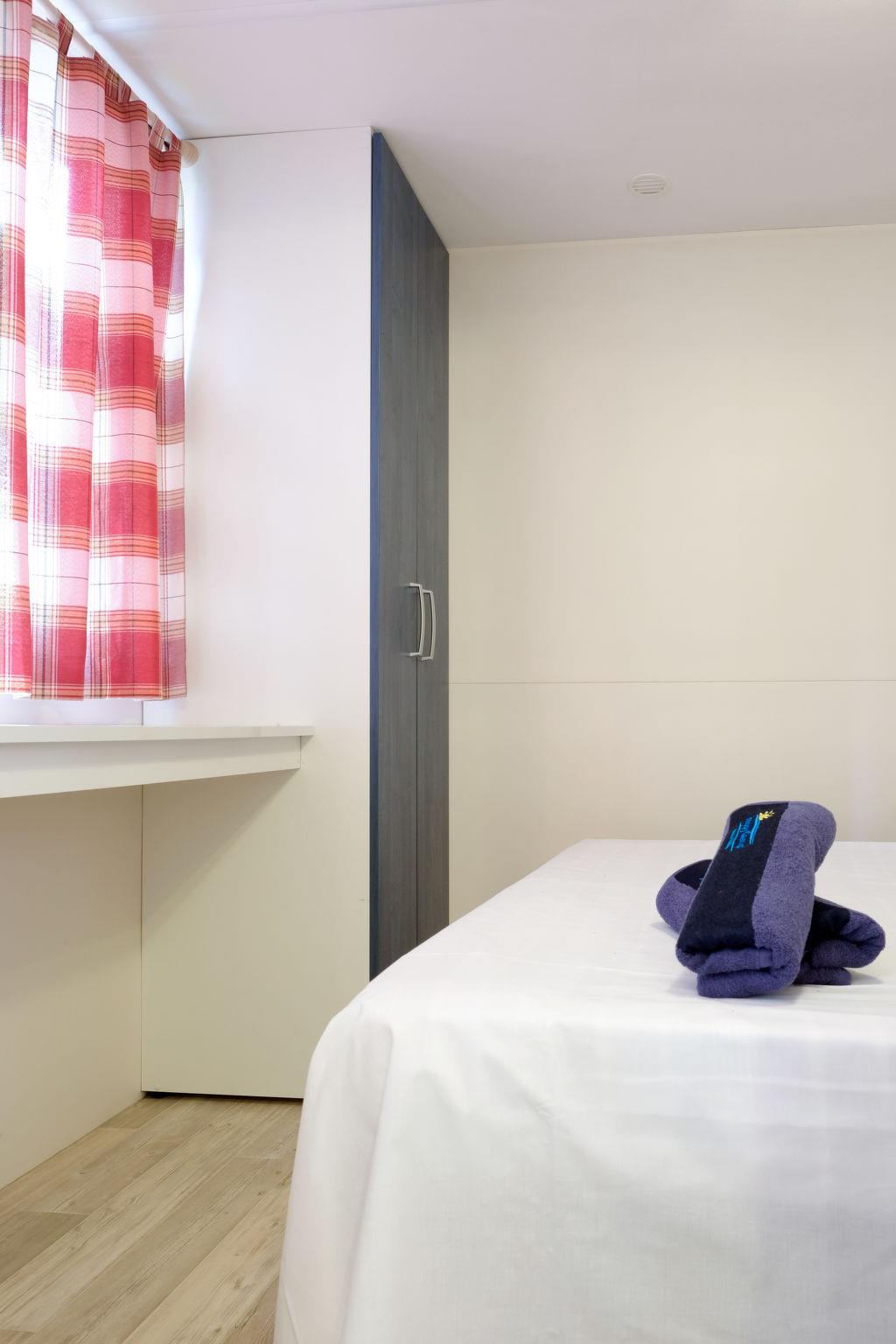 "Happy Easy", 3-room mobile home 25 m2. Object suitable for 4 adults + 1 child. Practical furnishings: living/sleeping room with 1 sleeping facility, dining table, electric heating and air conditioning. 1 room with 1 french bed (140 cm, length 190 cm). 1 room with 2 beds (70 cm, length 190 cm), 1 x 1 bunk beds (65 cm, length 179 cm). Open kitchen (4 hot plates). Shower/WC. Air-conditioning (extra). Terrace partly roofed. Terrace furniture, electric barbecue (portable), deck chairs (2). Facilities: mosquito net. Parking (1 car). Please note: non-smokers only. Maximum 1 small pet/ dog allowed. IT090081B1000F3600