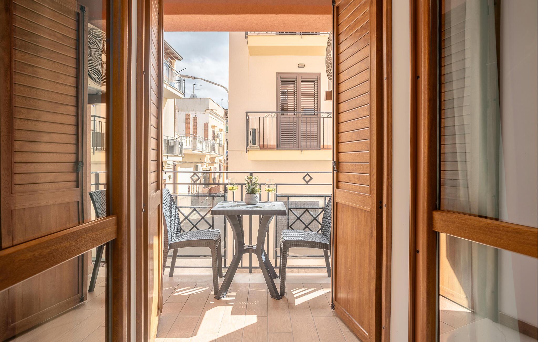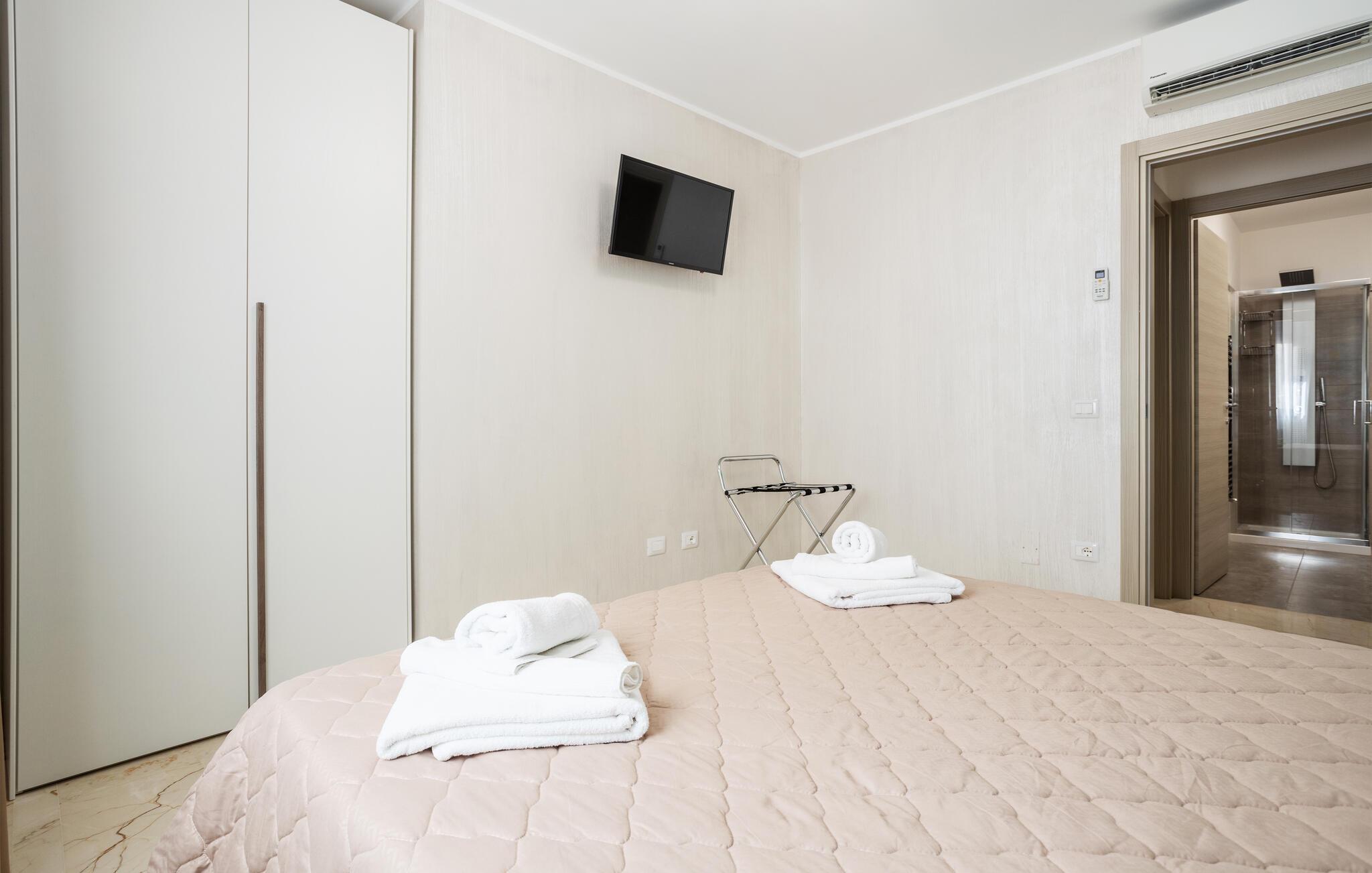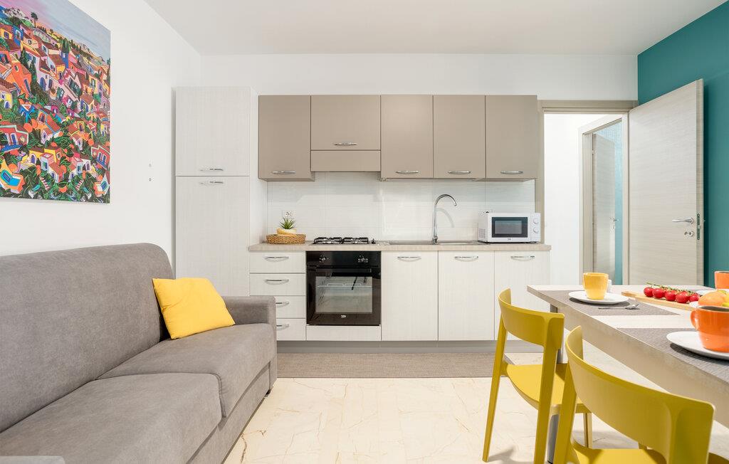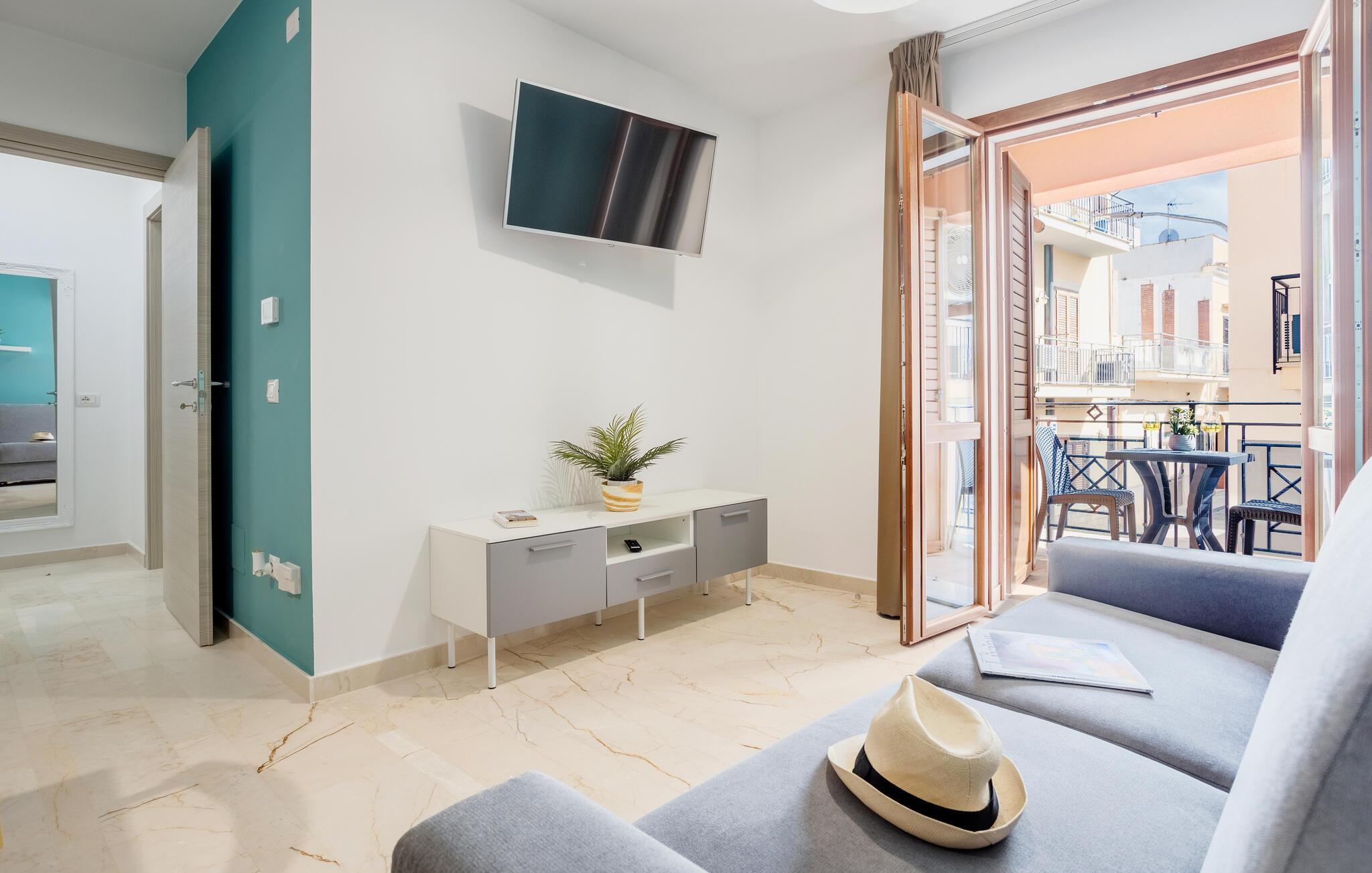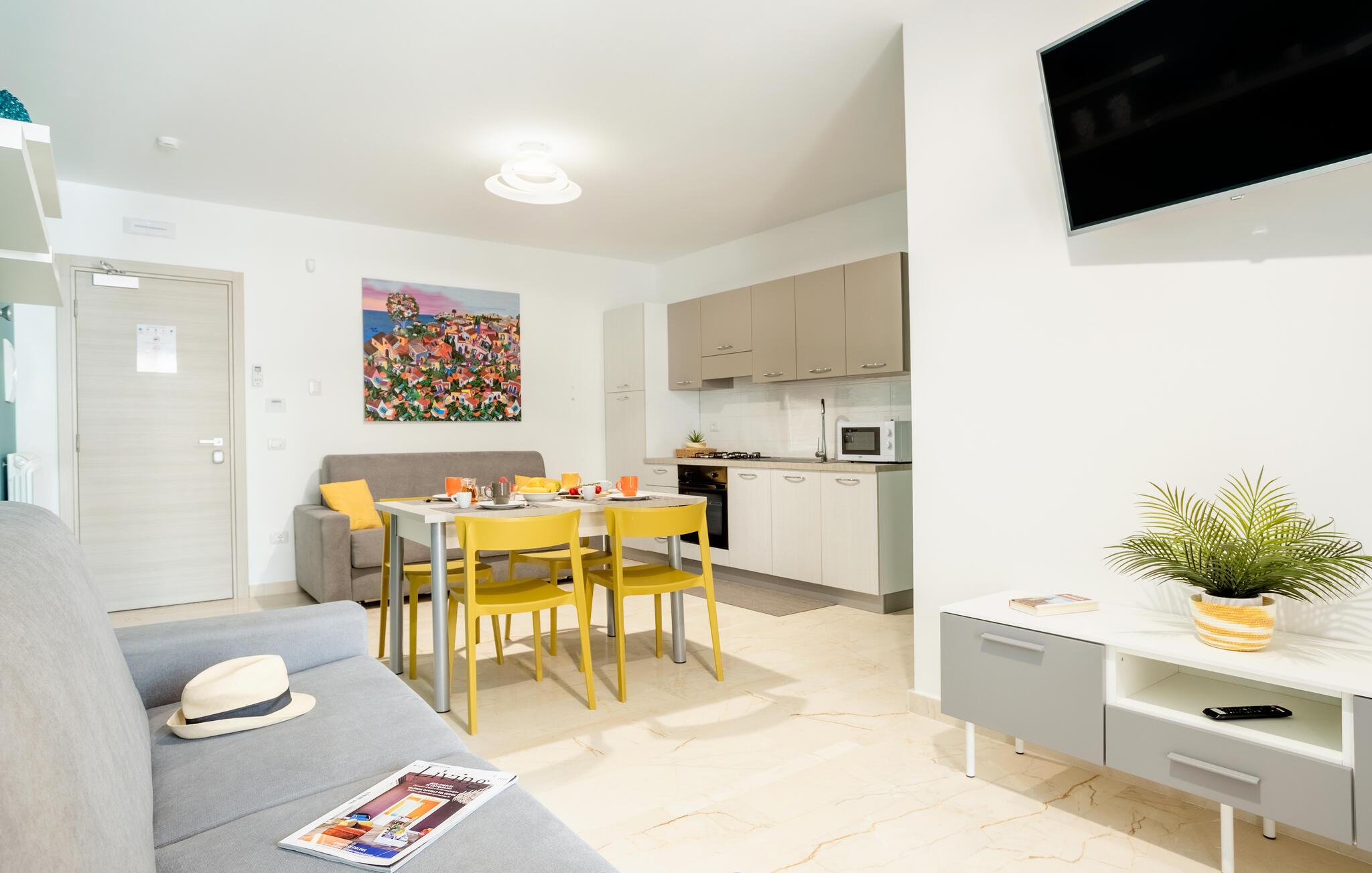 Et lyst og stilfuldt miljø byder jer velkommen i denne elegante lejlighed nær kysten. Tilbered lækre pastaretter i det åbne køkken, planlæg jeres udflugter ved det indbydende spisebord, og slap af på den hyggelige sofa efter en oplevelsesrig dag.
