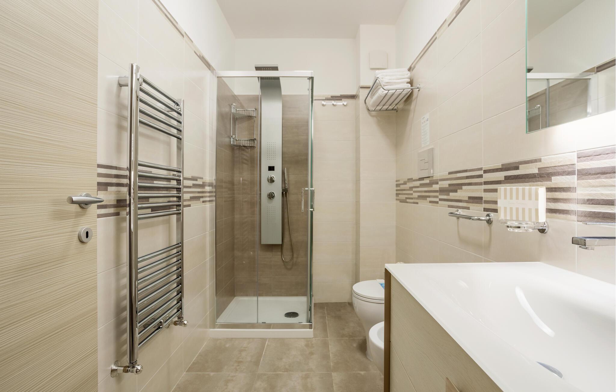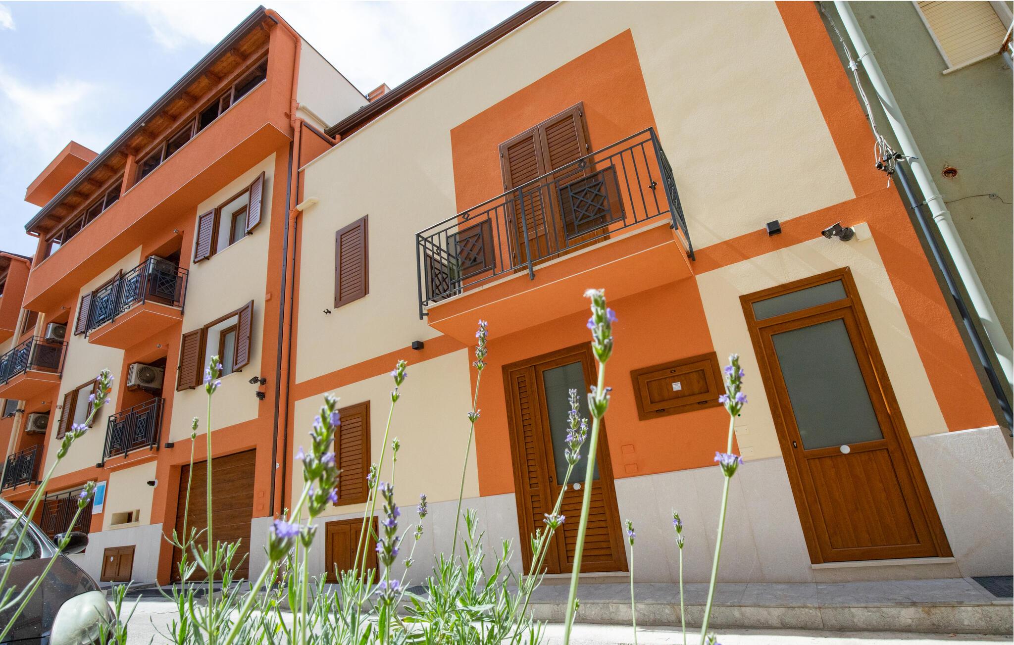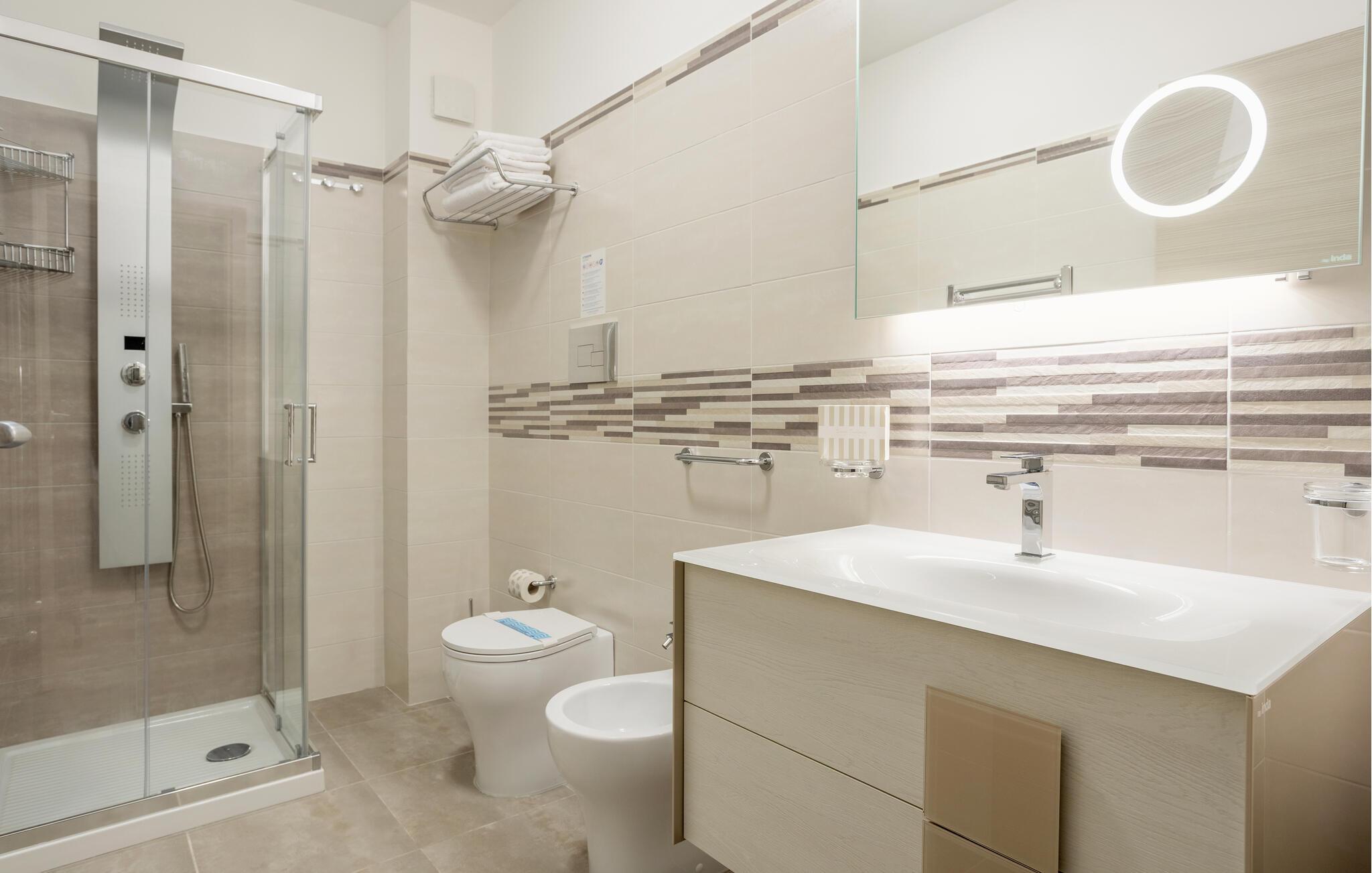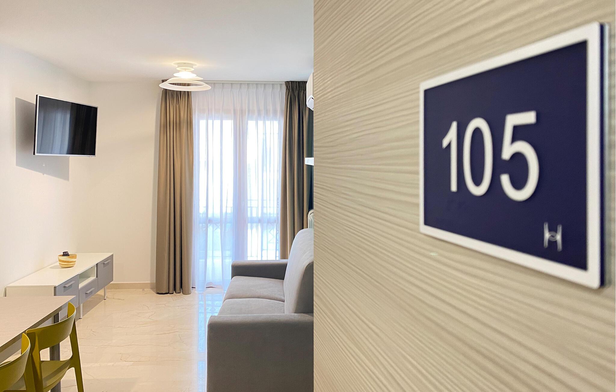 Et lyst og stilfuldt miljø byder jer velkommen i denne elegante lejlighed nær kysten. Tilbered lækre pastaretter i det åbne køkken, planlæg jeres udflugter ved det indbydende spisebord, og slap af på den hyggelige sofa efter en oplevelsesrig dag.