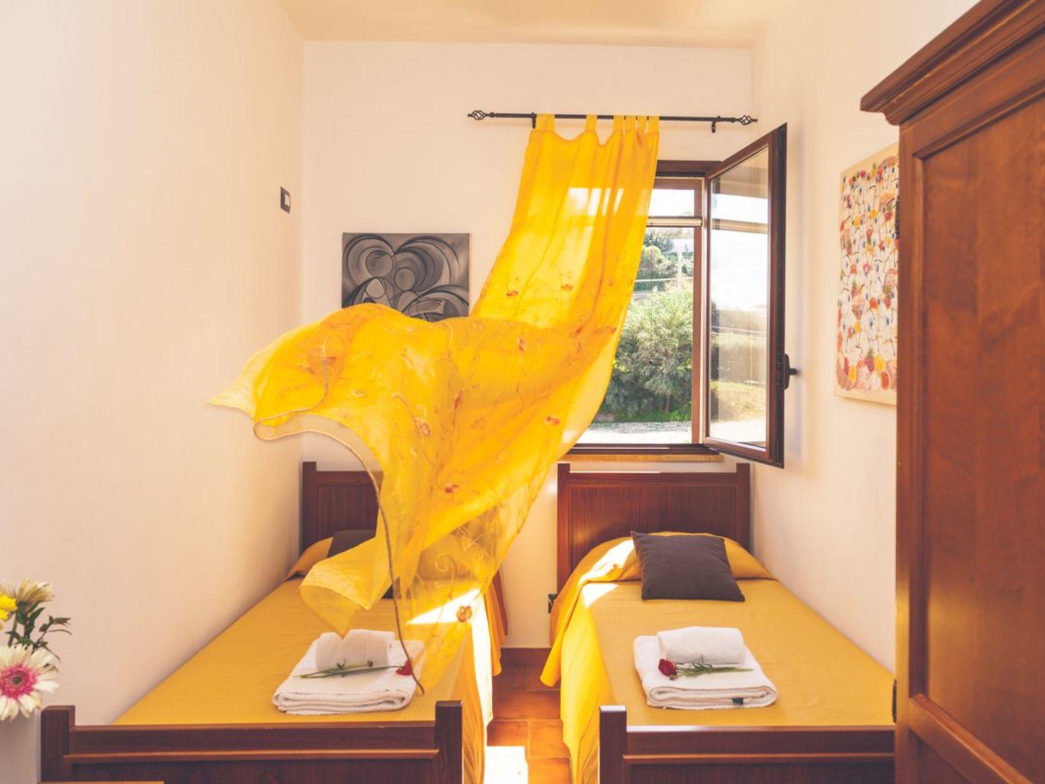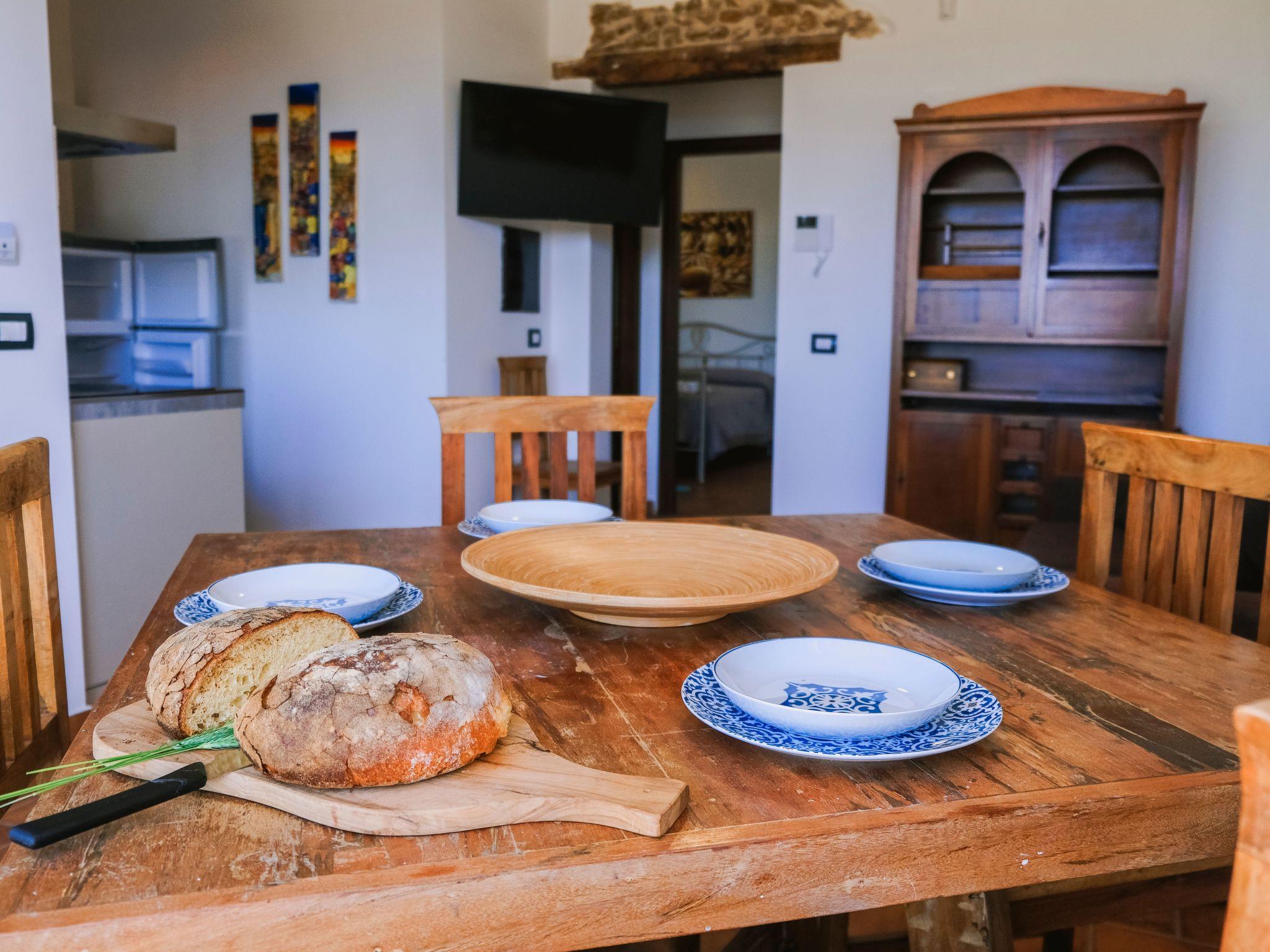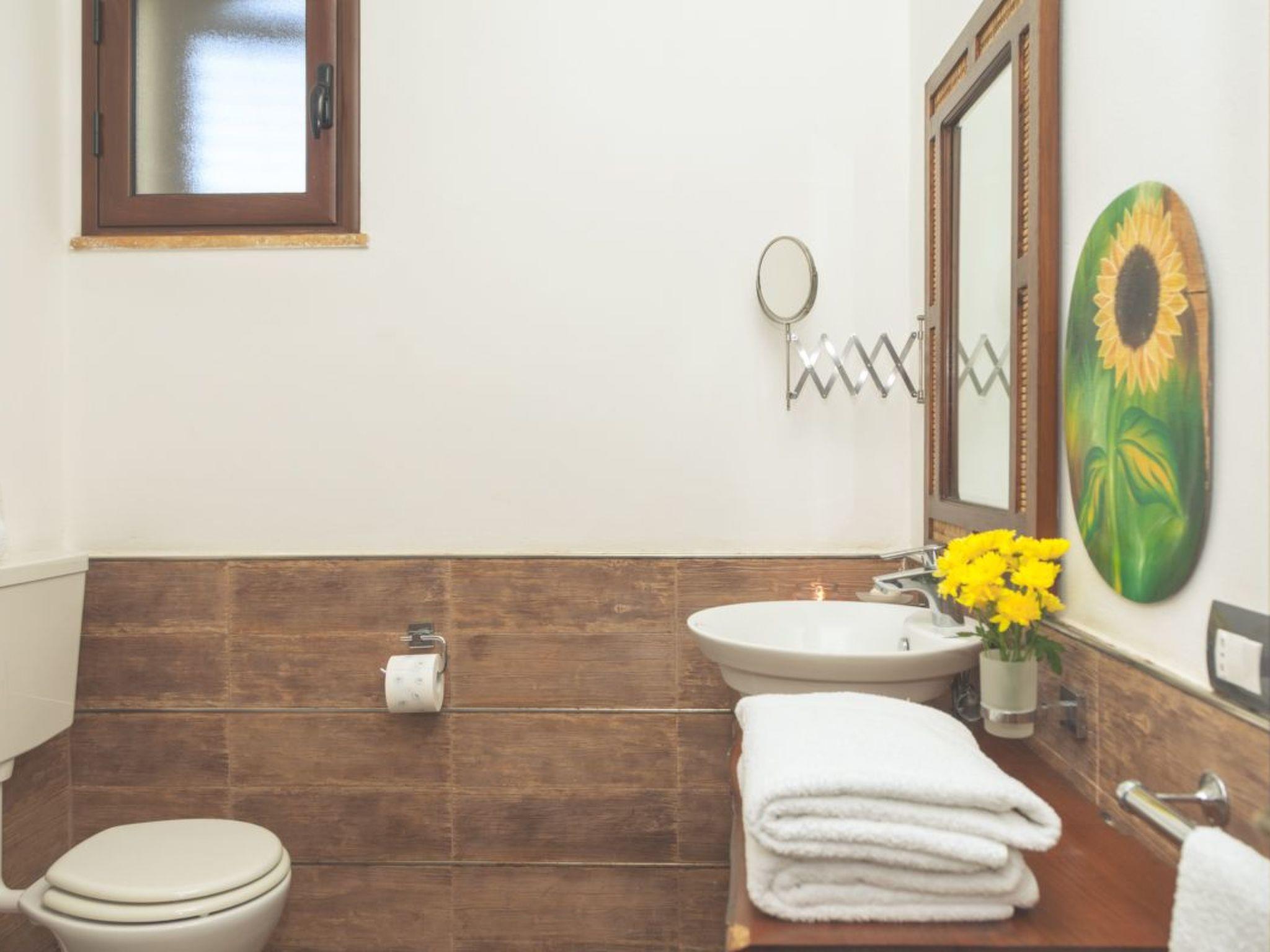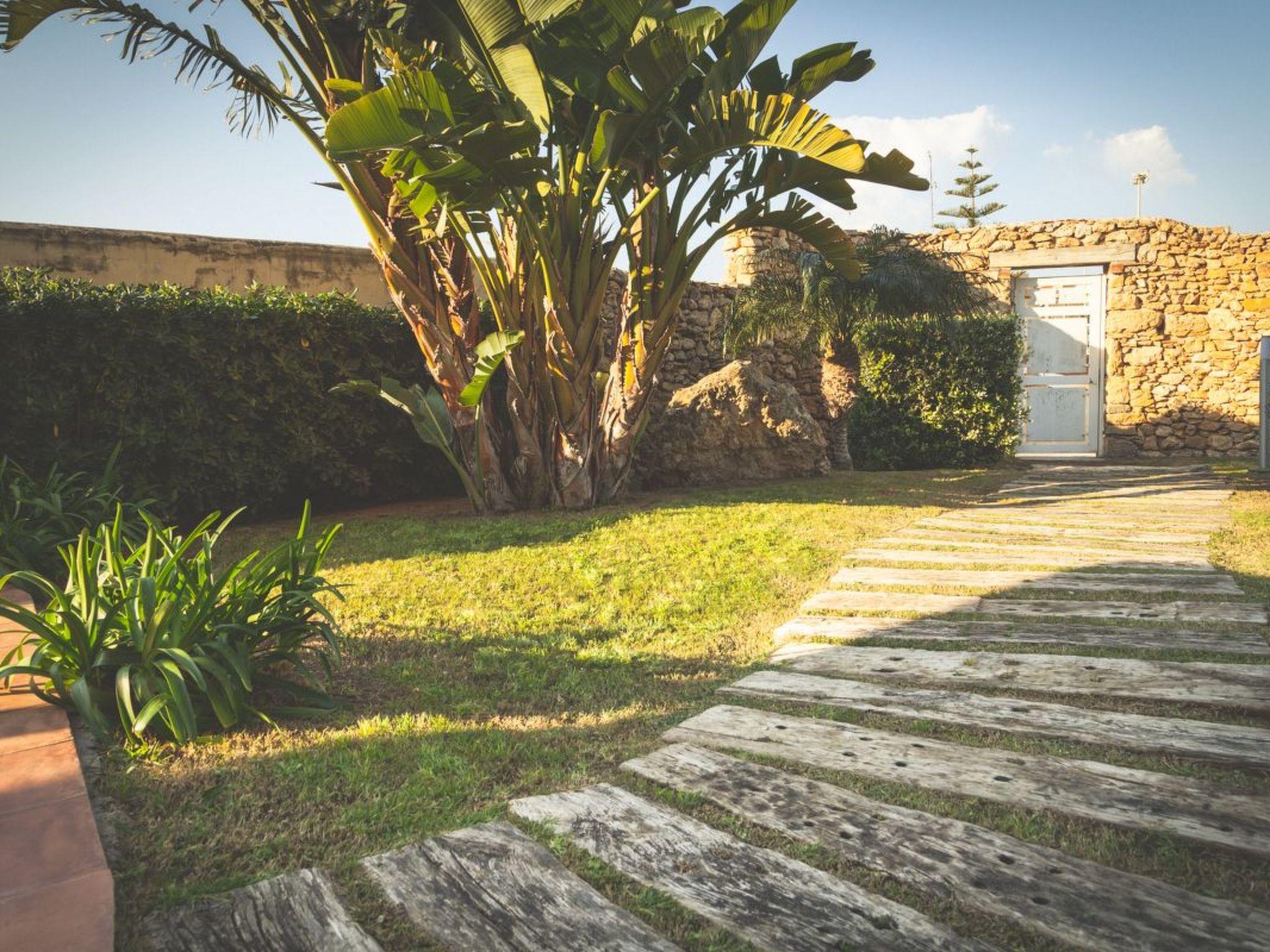 The interior of the flat is elegant and functional, comprising two bedrooms - a double with large windows overlooking the garden and a twin, which can be converted into two singles or a second double as required. The characteristic en-suite bathroom has a shower, stone walls and a solid wood and steel sink, complemented by a small window that adds a touch of brightness. The kitchen opens onto a cosy living room adorned with 19th-century Sicilian majolica tiles and a local stone wall, which together create a tranquil and inviting atmosphere.