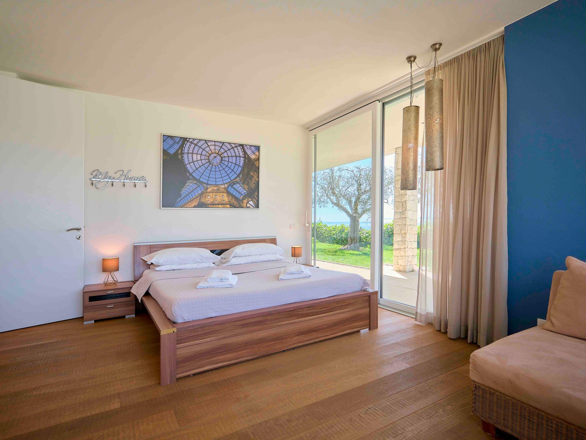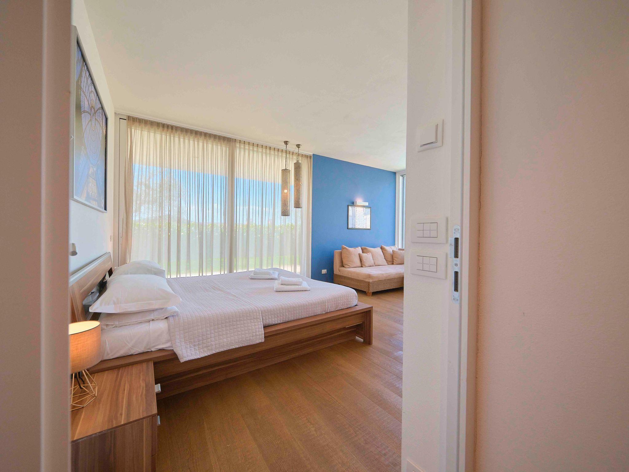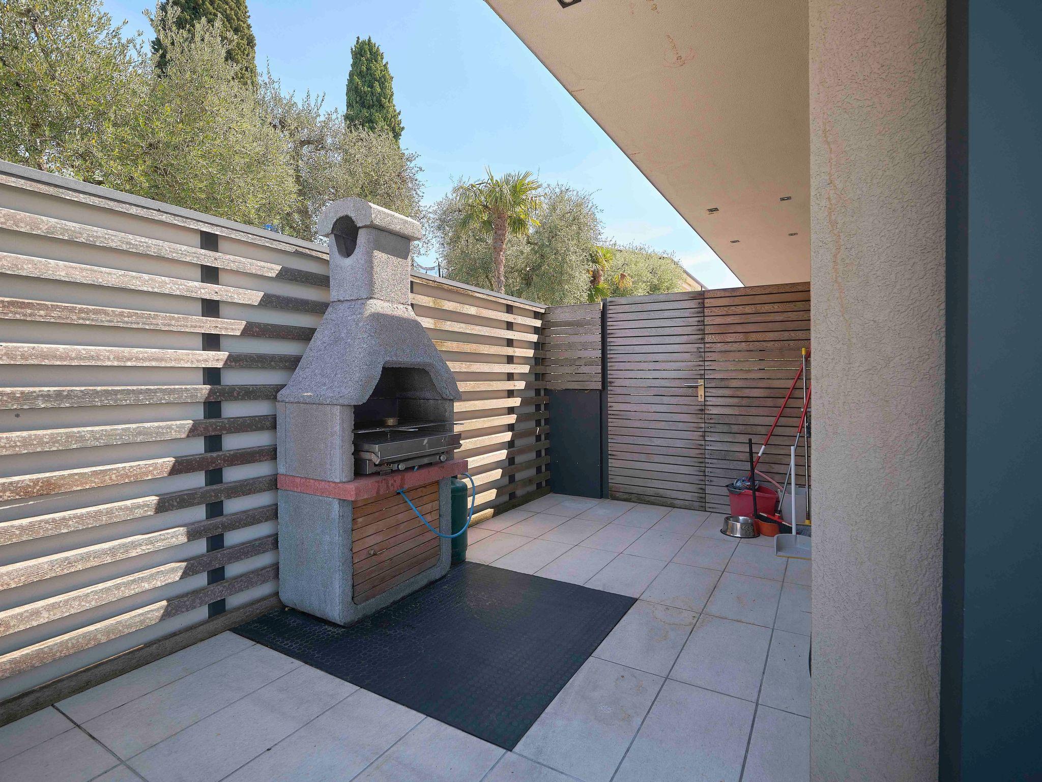 The villa is divided vertically into 2 properties. We rent the property overlooking the swimming pool (3.5 x 10 metres) which can accommodate a maximum of 8 persons. The entrance is on the upper floor and consists of a living room with sofa (convertible into a sofa bed 160 x 200 cm), dining area with kitchenette and a bathroom. On the ground floor, accessible via a convenient staircase, there are 3 bedrooms, two of which have a double bed 180 x 200 cm, while the third bedroom has 2 single beds and a further 2 foldaway beds underneath. Also on the same floor are 2 large bathrooms, both with shower. The kitchen is brand new, equipped with dishwasher, induction hob, oven, refrigerator and freezer. The property is equipped with air conditioning, satellite TV, Wi-Fi, electric shutters, electric awnings on the terrace and barbecue.