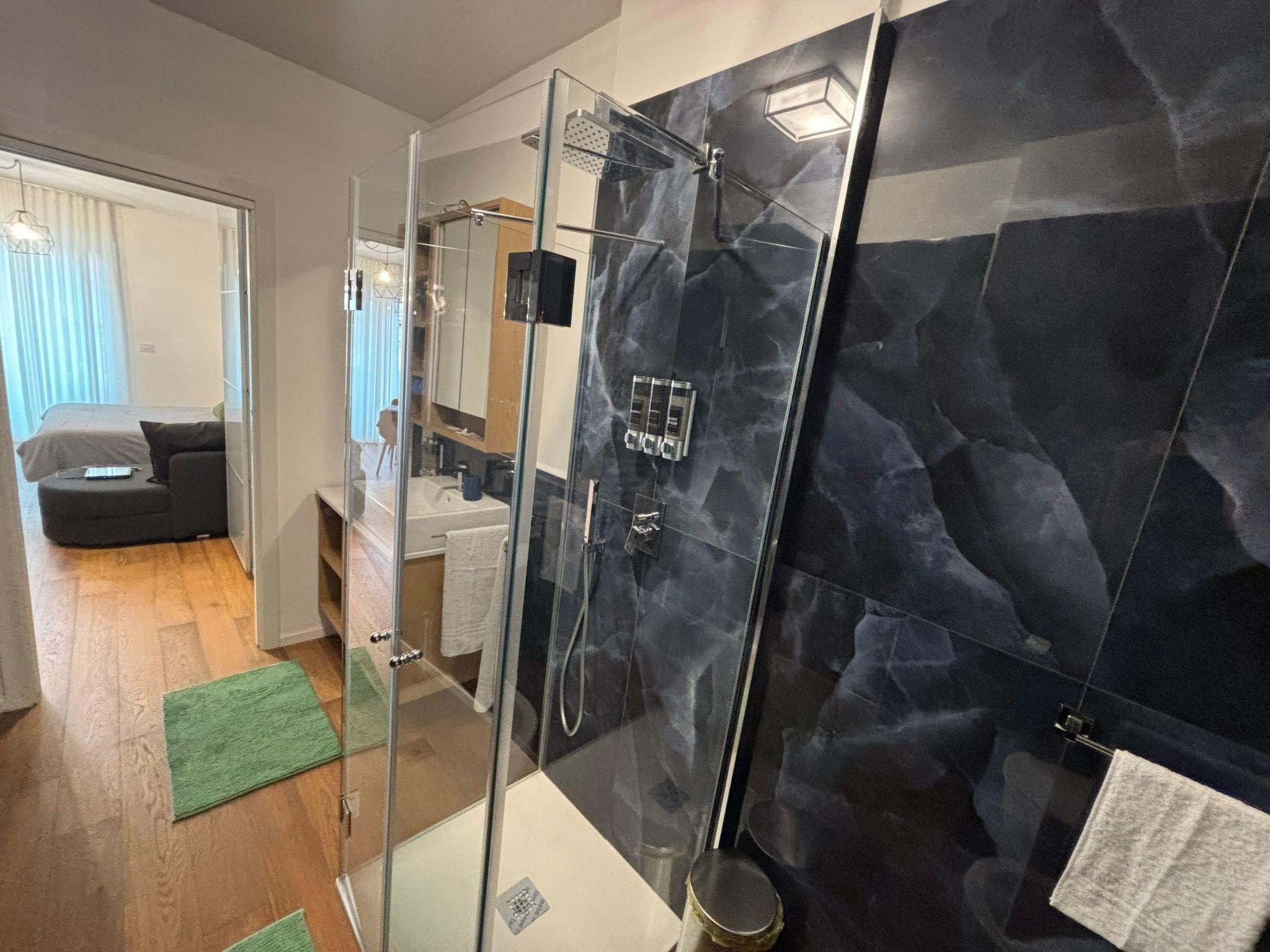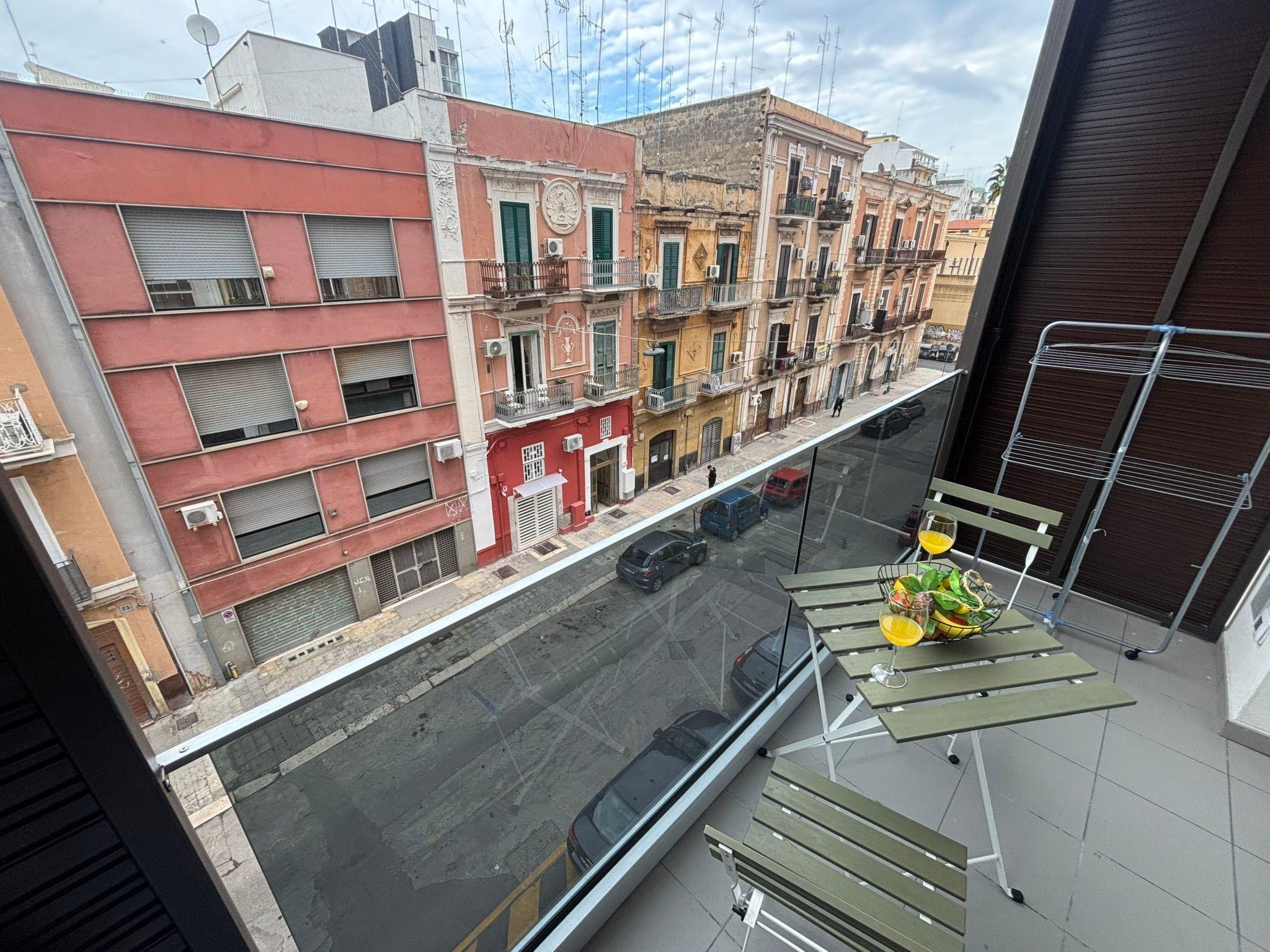 The bathroom, made of quality materials and elegant tiles, offers a walk-in shower, shower chair, bidet and an extra set of towels designed for longer stays. The apartment also has a practical washing machine with a washer-dryer function. Outside, a balcony furnished with a table and chairs provides a private space to relax and enjoy the view. The location of the BnB is one of its great strengths: situated in the heart of Bari, it allows you to reach Bari Vecchia, the Basilica of San Nicola, the Norman-Swabian Castle and the Petruzzelli Theatre in just a few minutes, as well as the Pane e Pomodoro beach, perfect for a beach break.