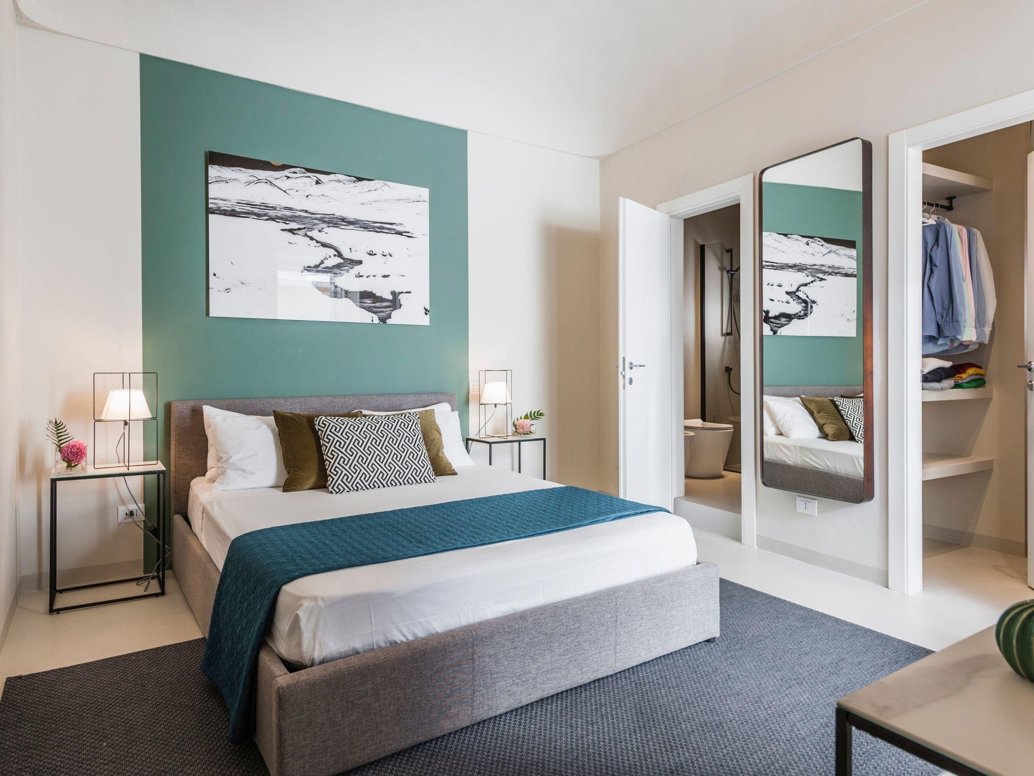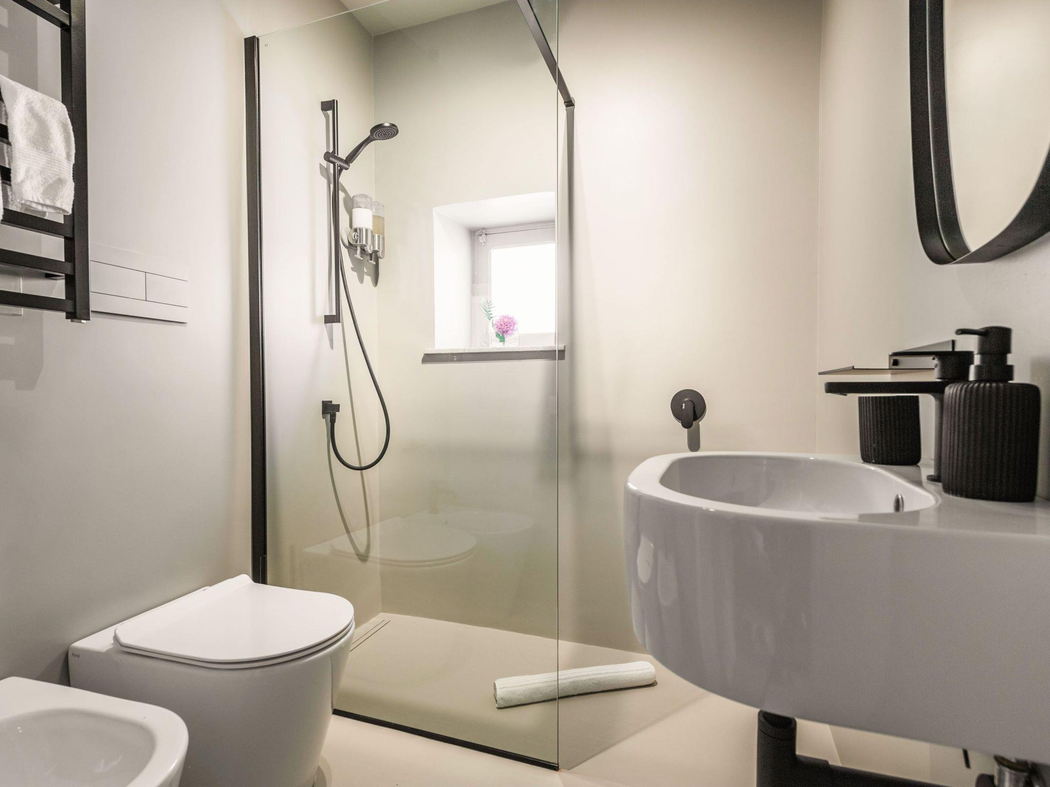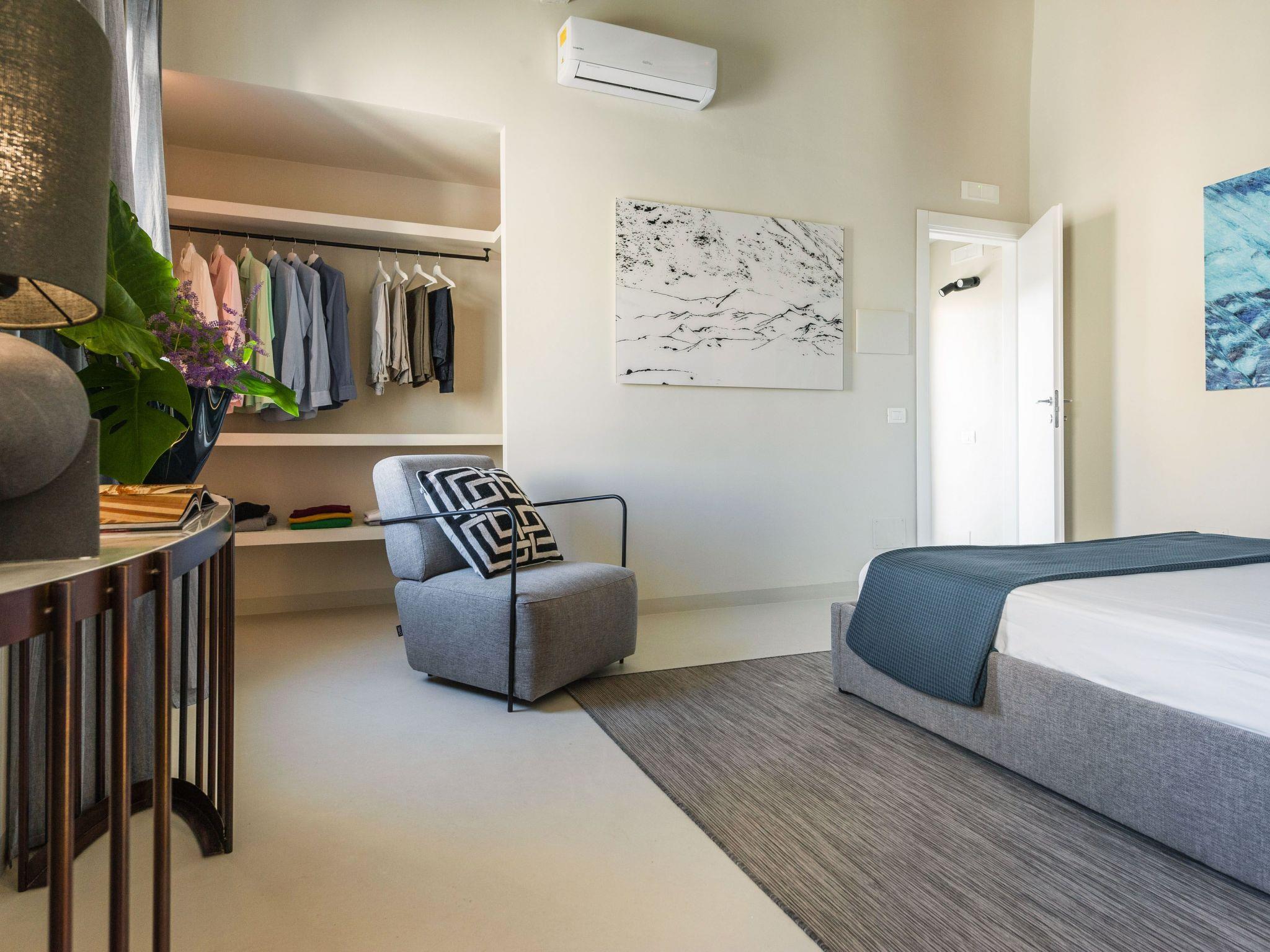 - on the first floor the kitchen equipped with everything you need to cook and eat in comfort; then the large and bright living area with a double sofa bed and bathroom; finally the "Green Room", a bedroom characterised by a soft minimal style, enriched by a bathroom and a walk-in wardrobe that also serves as a convenient laundry room complete with tumble dryer and iron;-