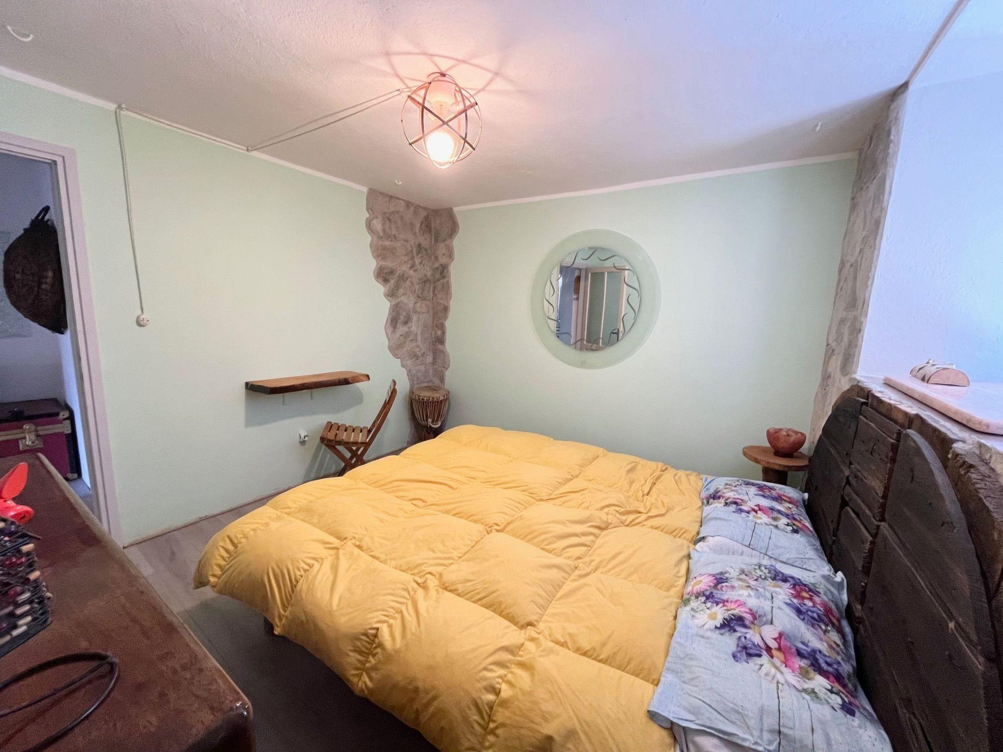 The kitchen is fully equipped, including a wood stove that adds a distinctive touch. Stone-adorned walls add a sense of authenticity, while the fireplace creates a cozy, relaxing atmosphere.