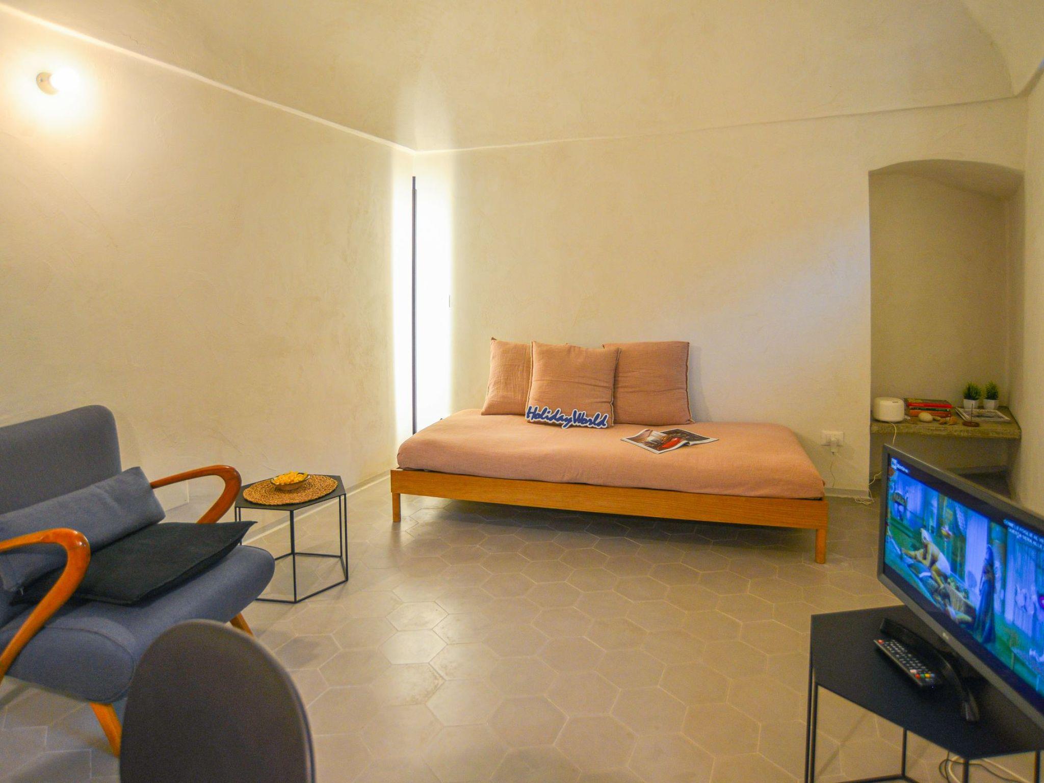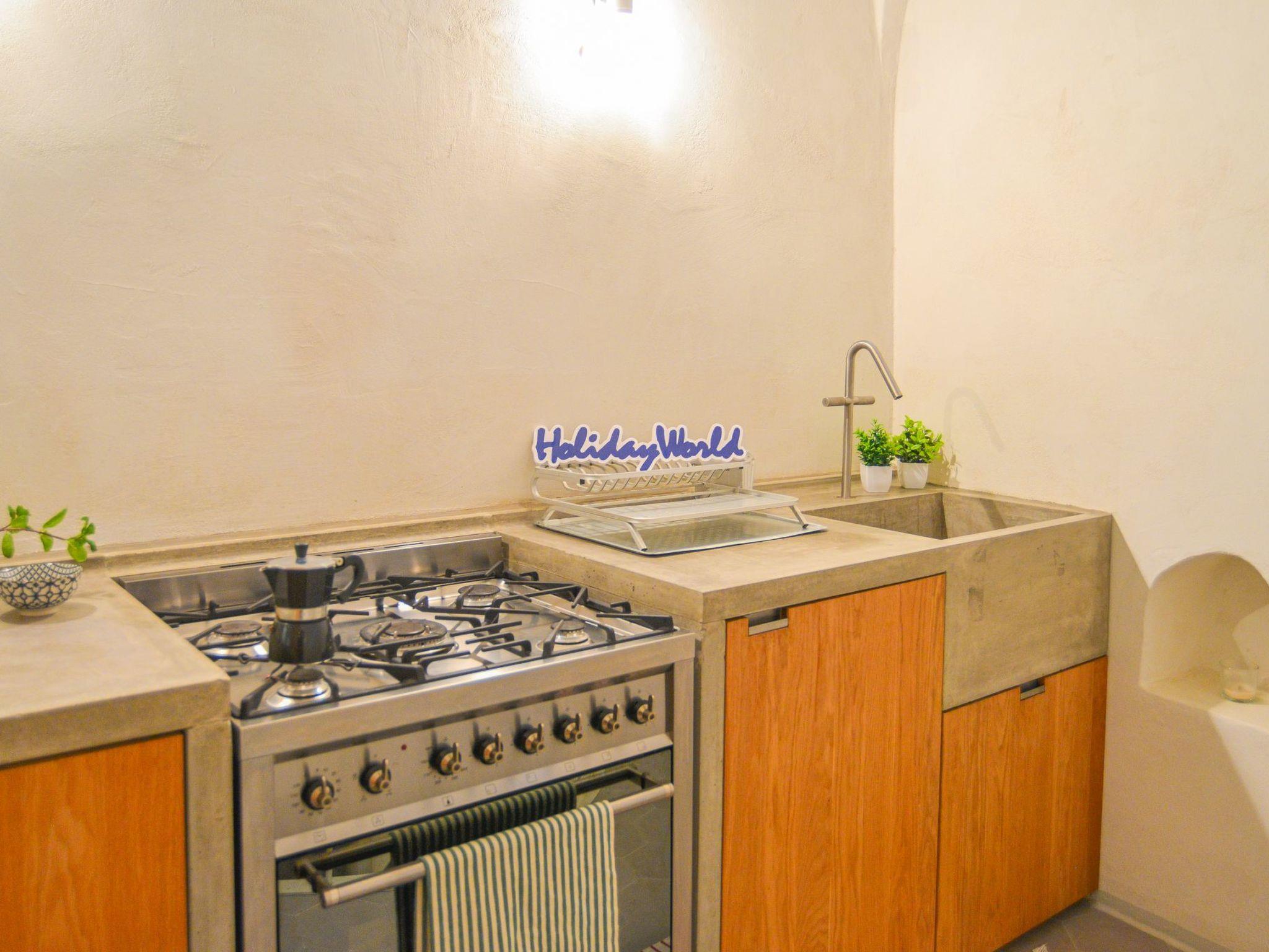 A stone staircase leads to the living area with a concrete kitchenette and oak furniture, where every detail recalls simplicity. A scenic white iron spiral staircase connects the two levels of the house, both characterised by vaulted ceilings that lend an authentic atmosphere. On the ground floor is the bedroom, with two single beds that can be joined or kept separate as required. The brick bathroom is particularly characteristic, with a brick shower that recalls the rustic style of the hamlet. Given the