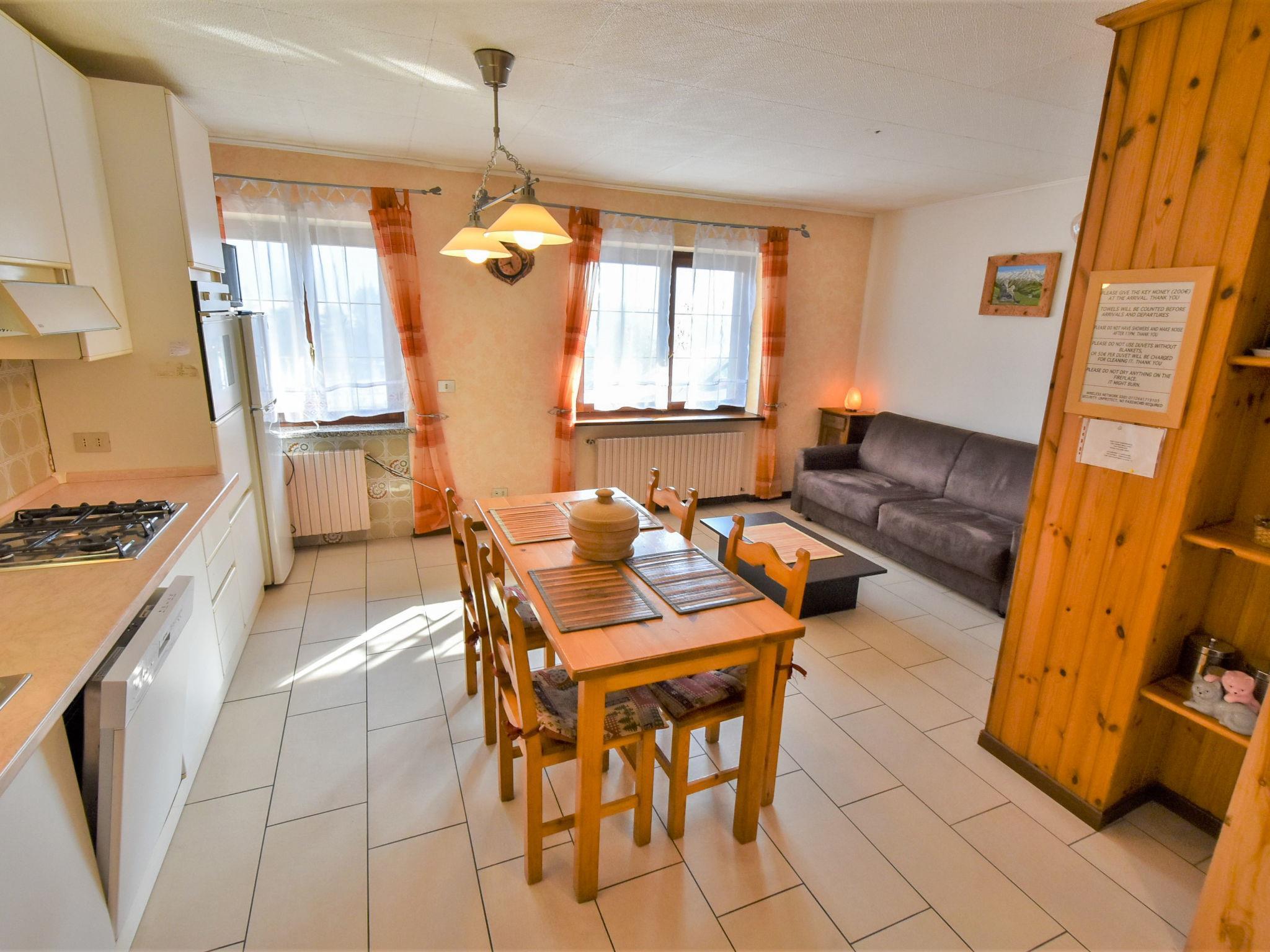 2-room apartment 40 m2, on the ground floor. Practical and comfortable furnishings: large living/dining room with 1 double sofabed, dining table, TV and tiled stove. 1 room with 1 french bed. Kitchenette (4 hot plates, oven, dishwasher, freezer). Shower/bidet/WC. Beautiful panoramic view of the mountains and the valley. Facilities: washing machine. Internet (WiFi, free). IT014072C25XIV4VEX