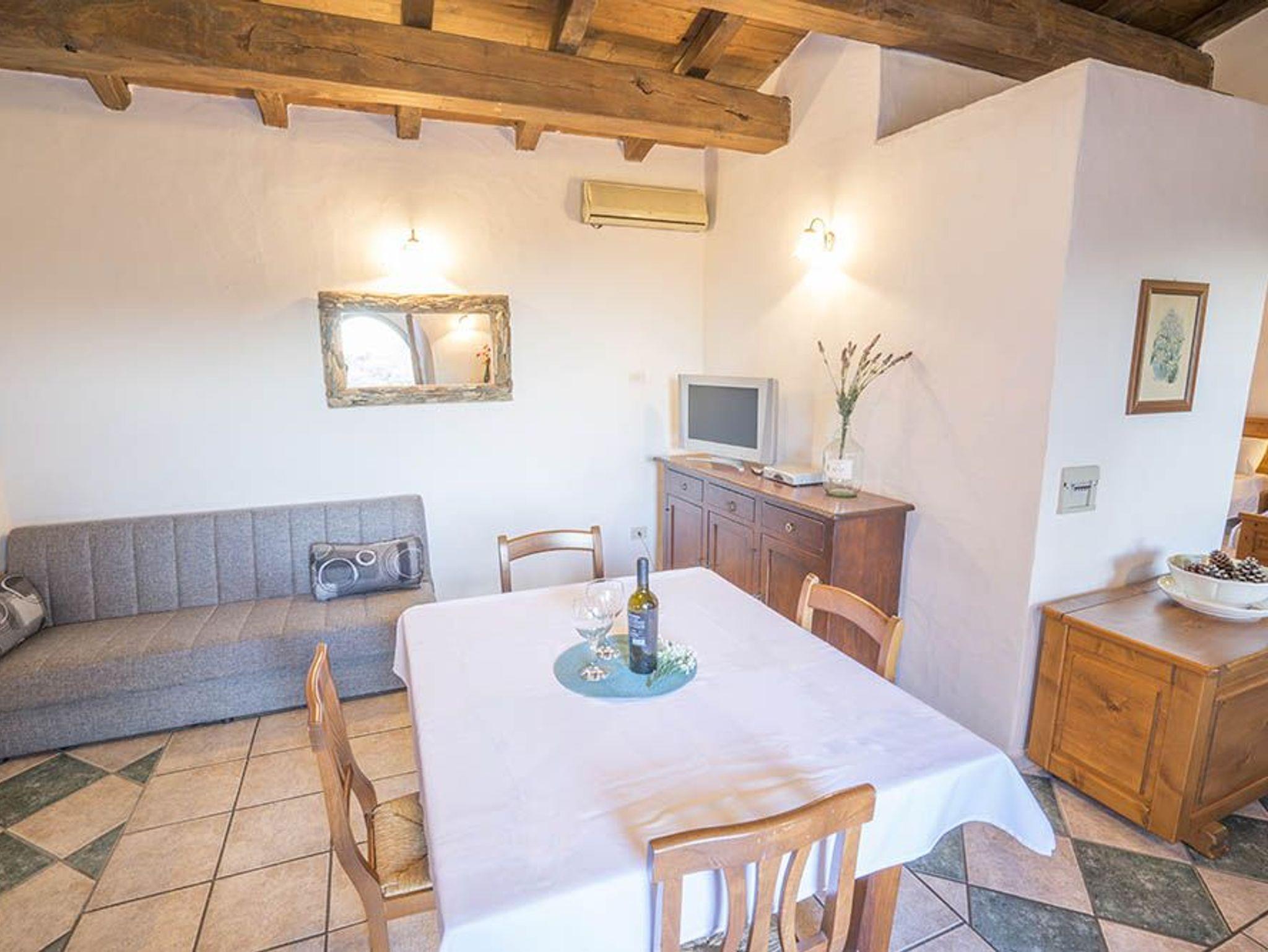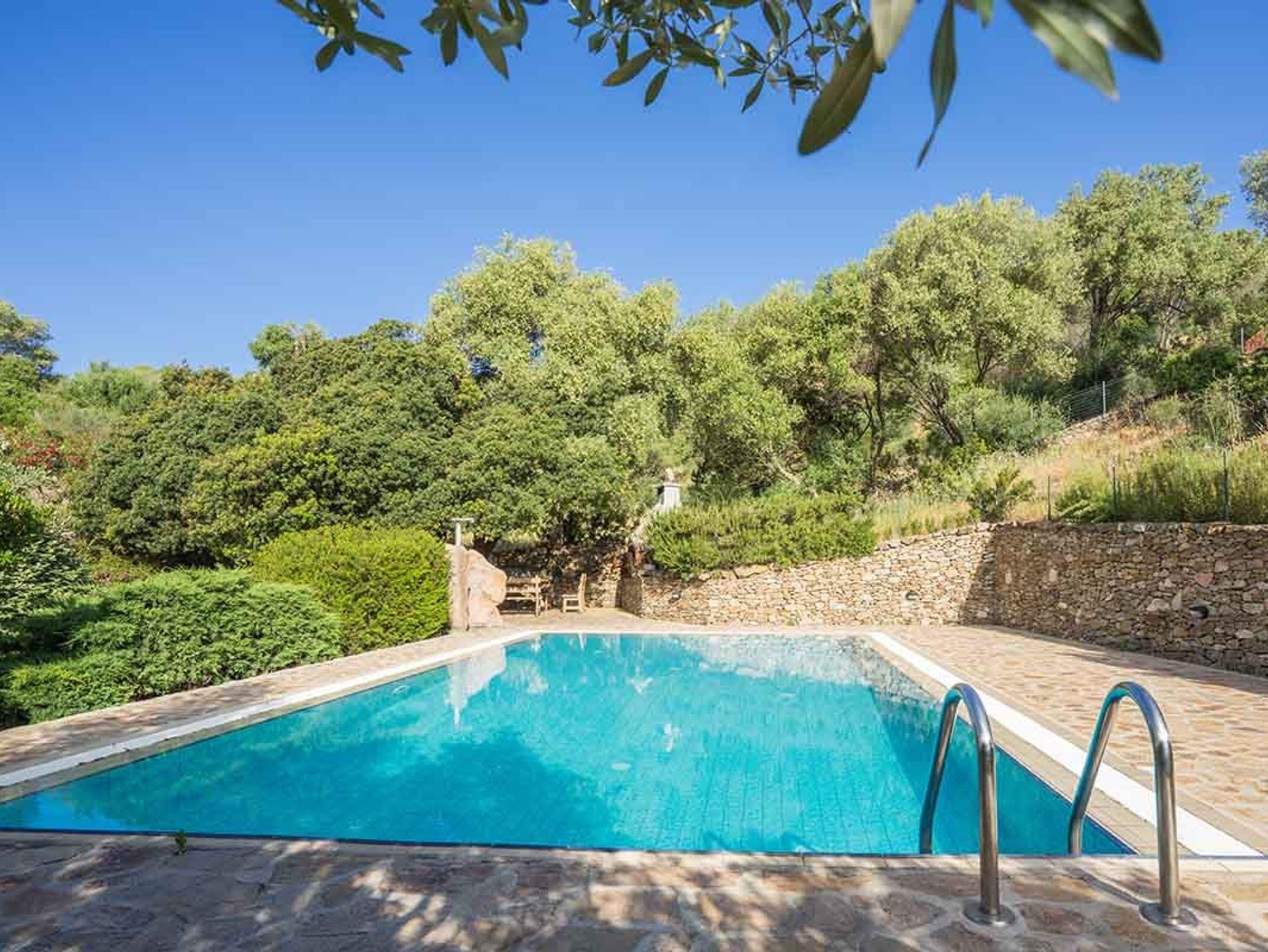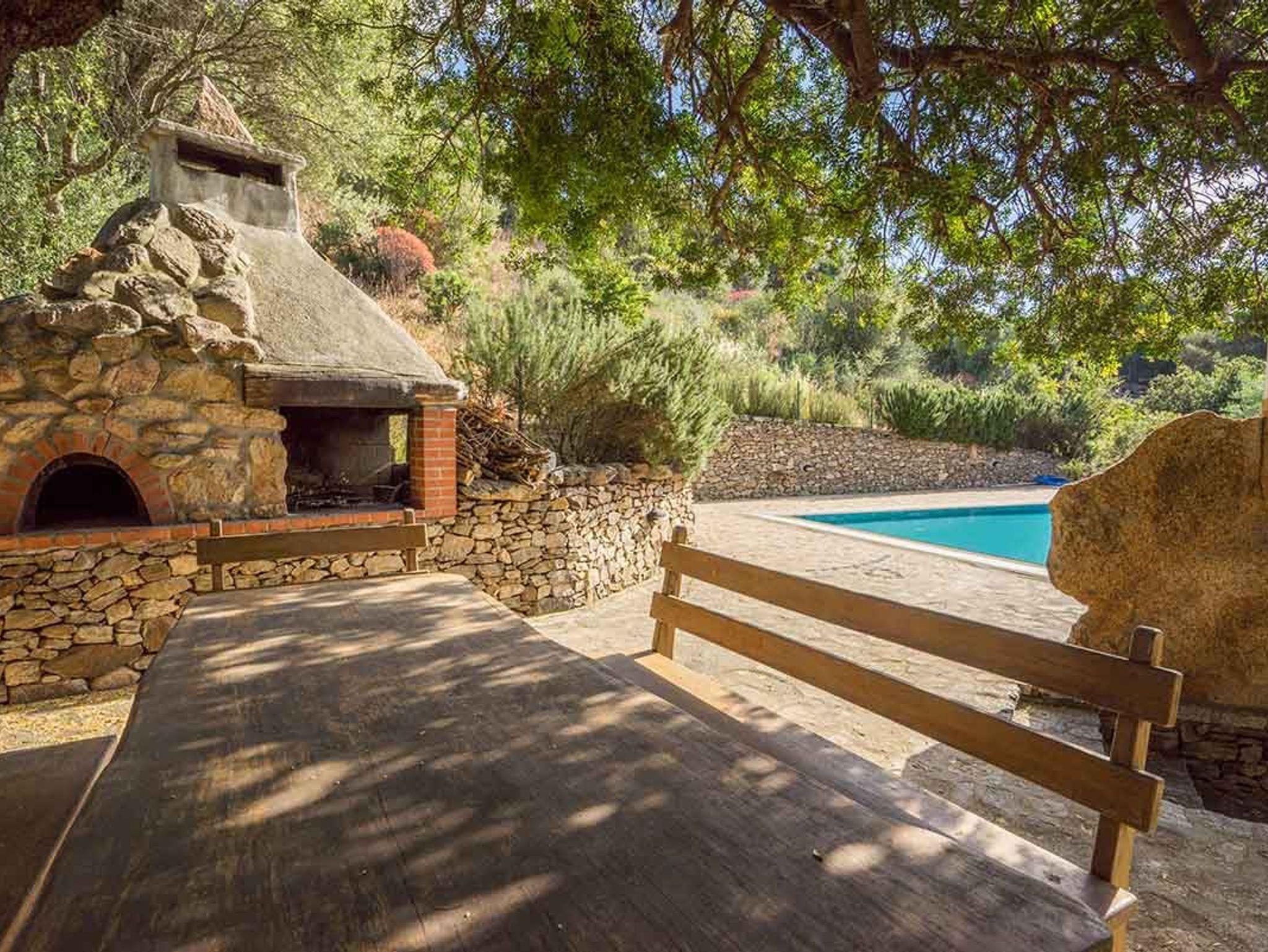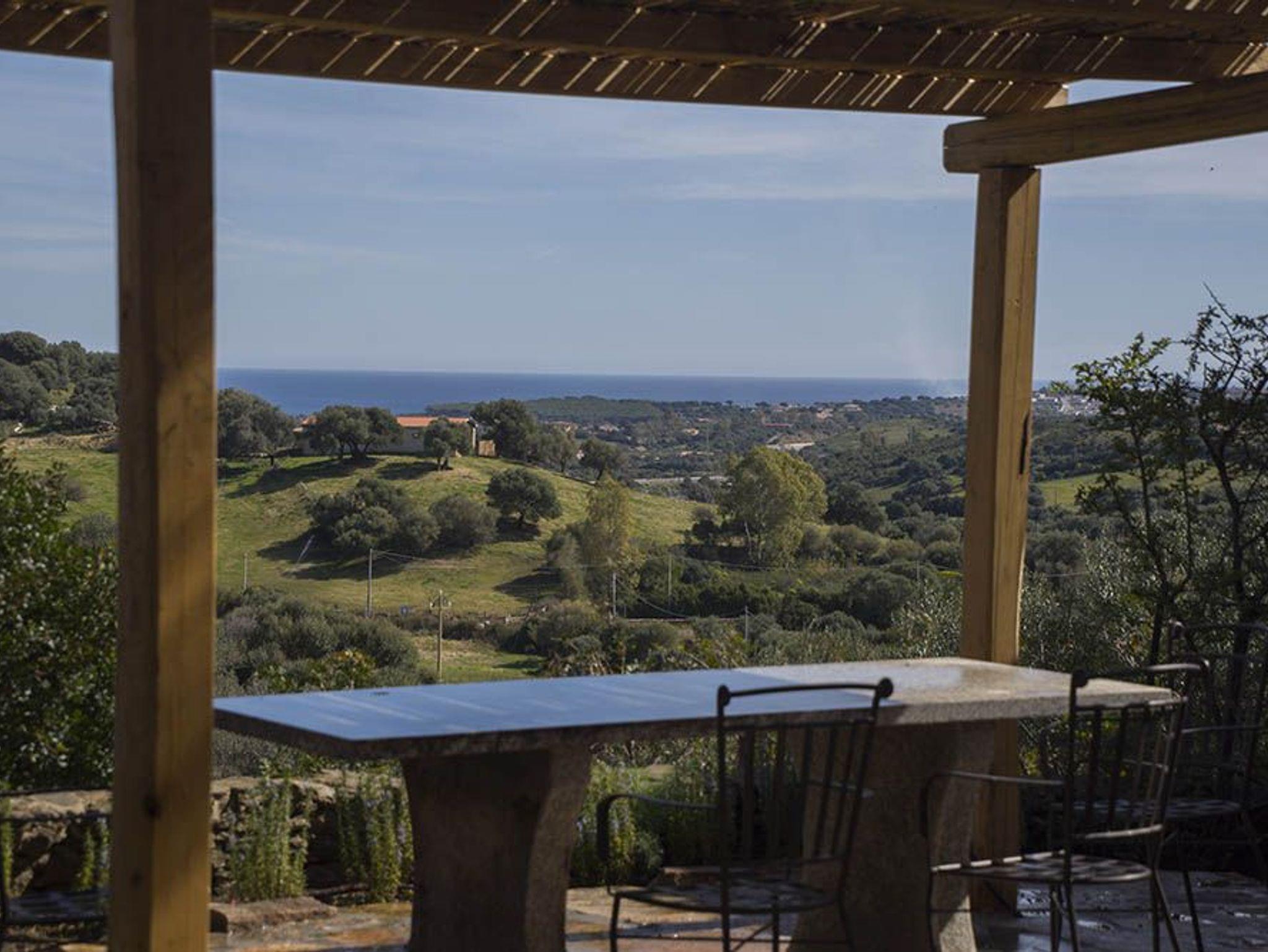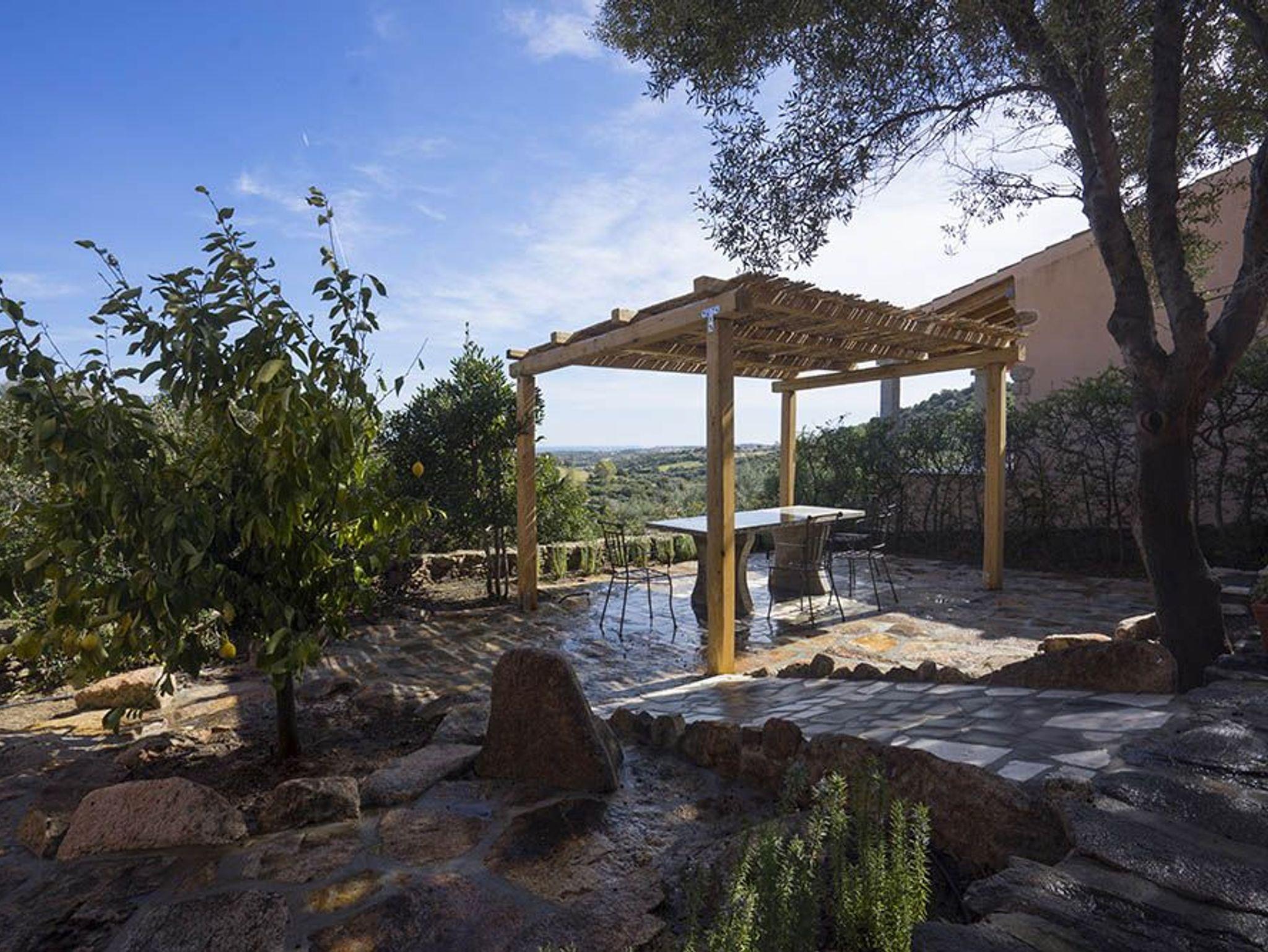 In Richtung Meer gleitet der Blick nur über Natur, und schon dieser Ausblick sucht an Schönheit seinesgleichen! Im Tal, etwa 50 Meter unterhalb der Häuser, befindet sich ein unter Bäumen versteckter Grillplatz und ein Pool, exklusiv für die 115. Dorthin führt ein wunderschöner Weg in Granitsteinen, vorbei an einem rechts der Straße liegenden Gärtchen mit allerlei Bäumen, darunter Kiwi, Zitrus- und Feigenbäume. Rechts davon gedeihen Melonen und anderes Gemüse. Der Vorteil dieses Pools ist, dass er seitlich von den Häusern liegt und darum deren beschauliche Athmosphäre nicht tangiert.