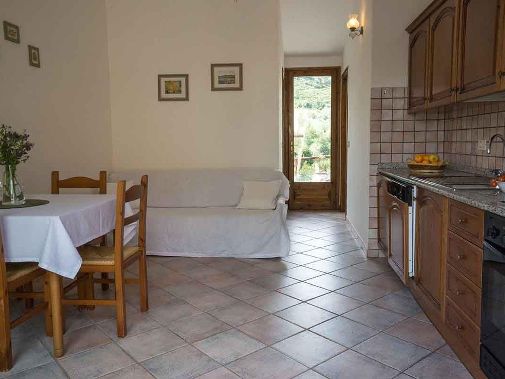 Hinter der großen Glasfront erwartet Sie der Wohn- Ess- Kochbereich der Villa Olivia. Gemütlich und funktionell sitzt man hier zusammen am Esstisch, oder auf dem Schlafsofa, um mit deutschem Fernsehen den Tag zu beenden. Durch den Gang nach hinten, betreten Sie das Bad, die BBQ-Terrasse und das gemütlich, ruhige Schlafzimmer mit Klimaanlage.