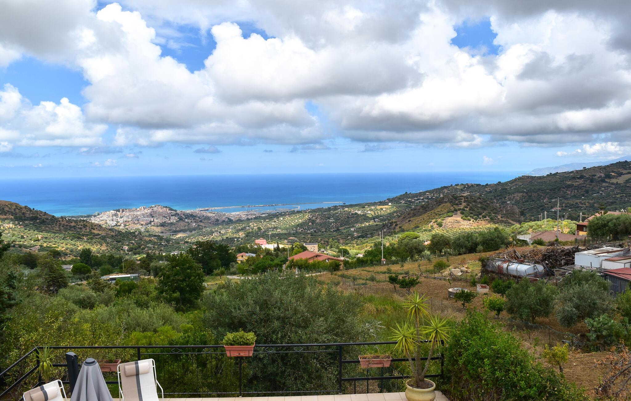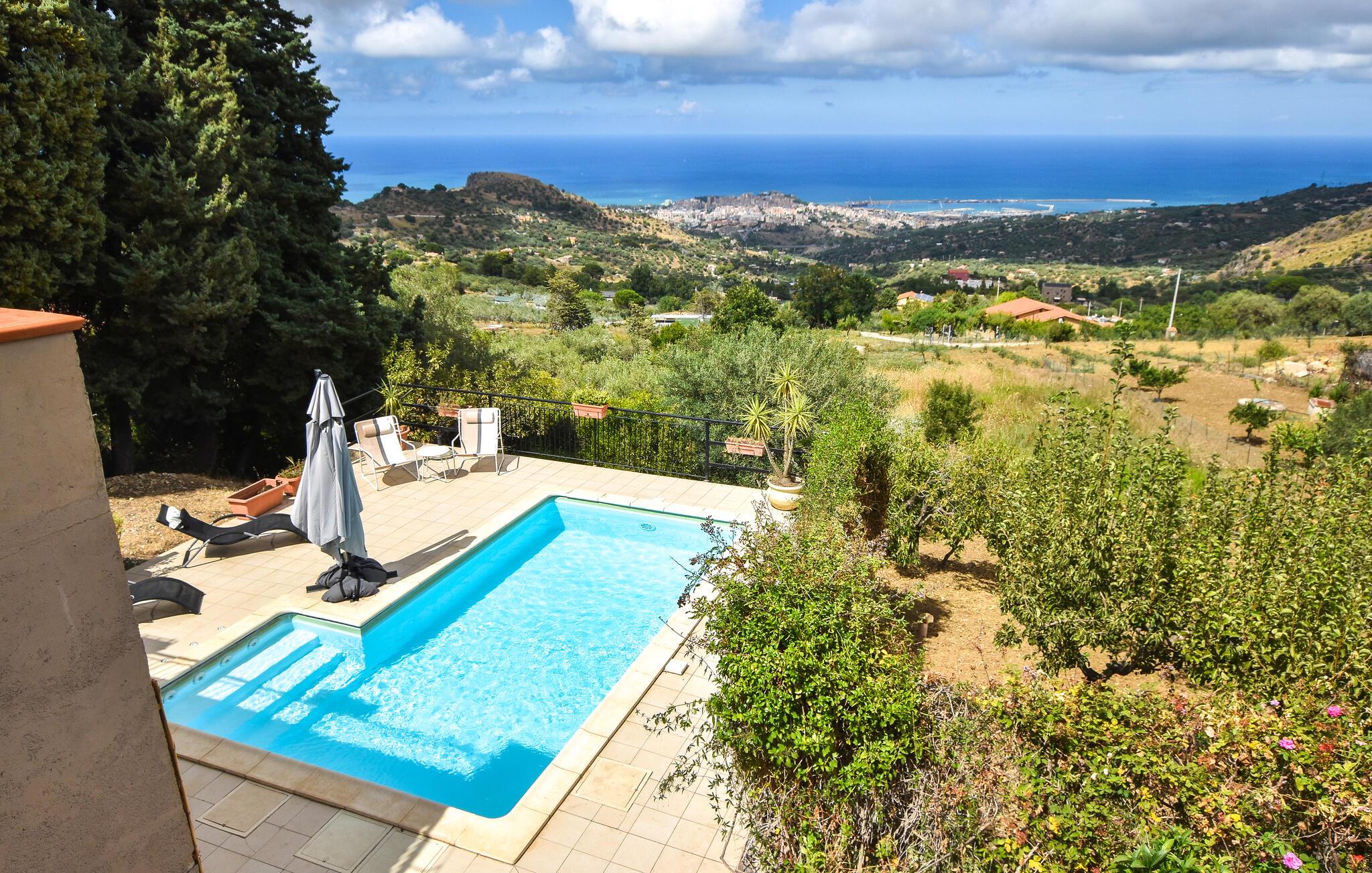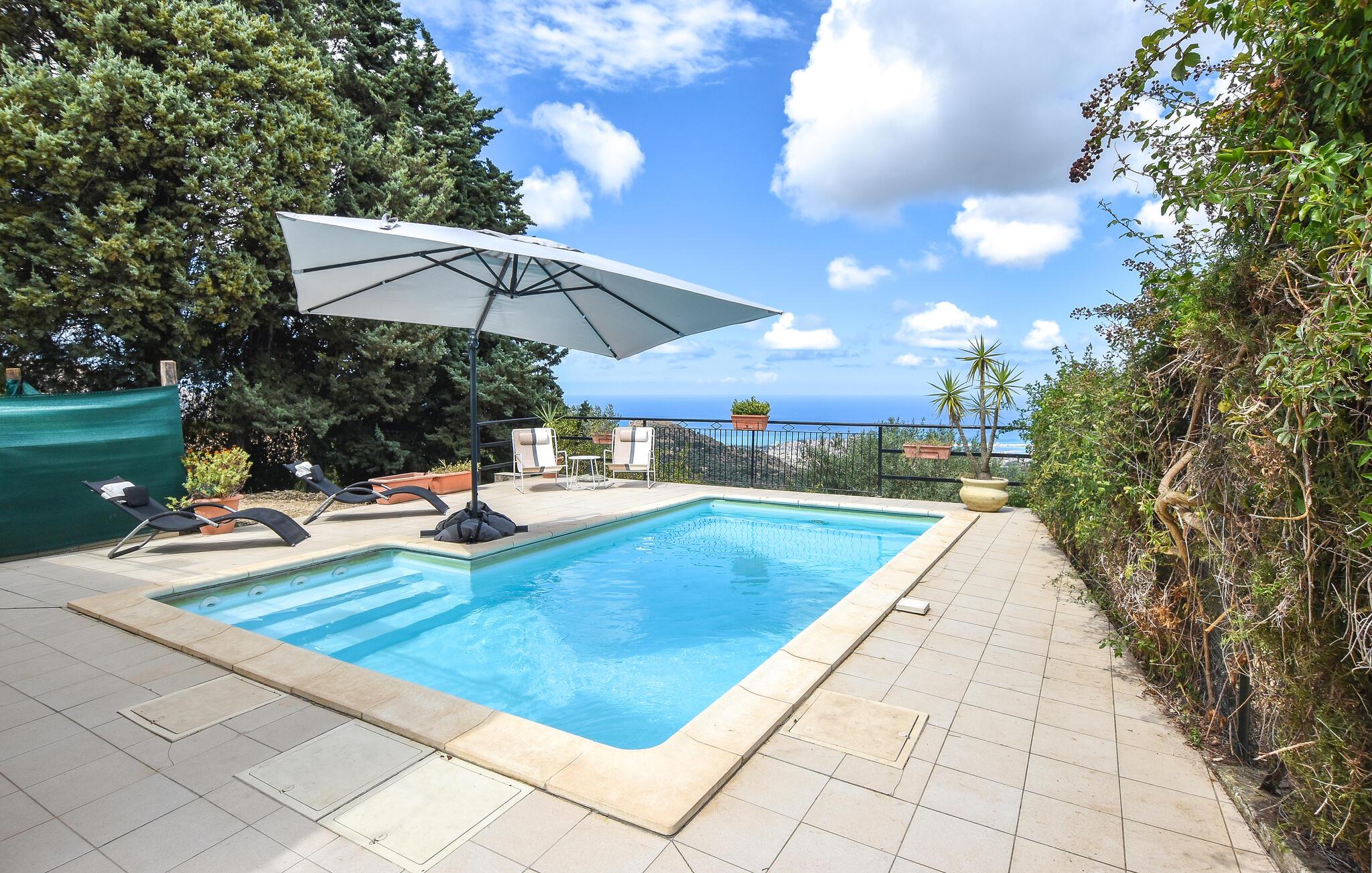 Nyd en smuk panoramaudsigt helt ned til havet i dette komfortable feriehus med pool.