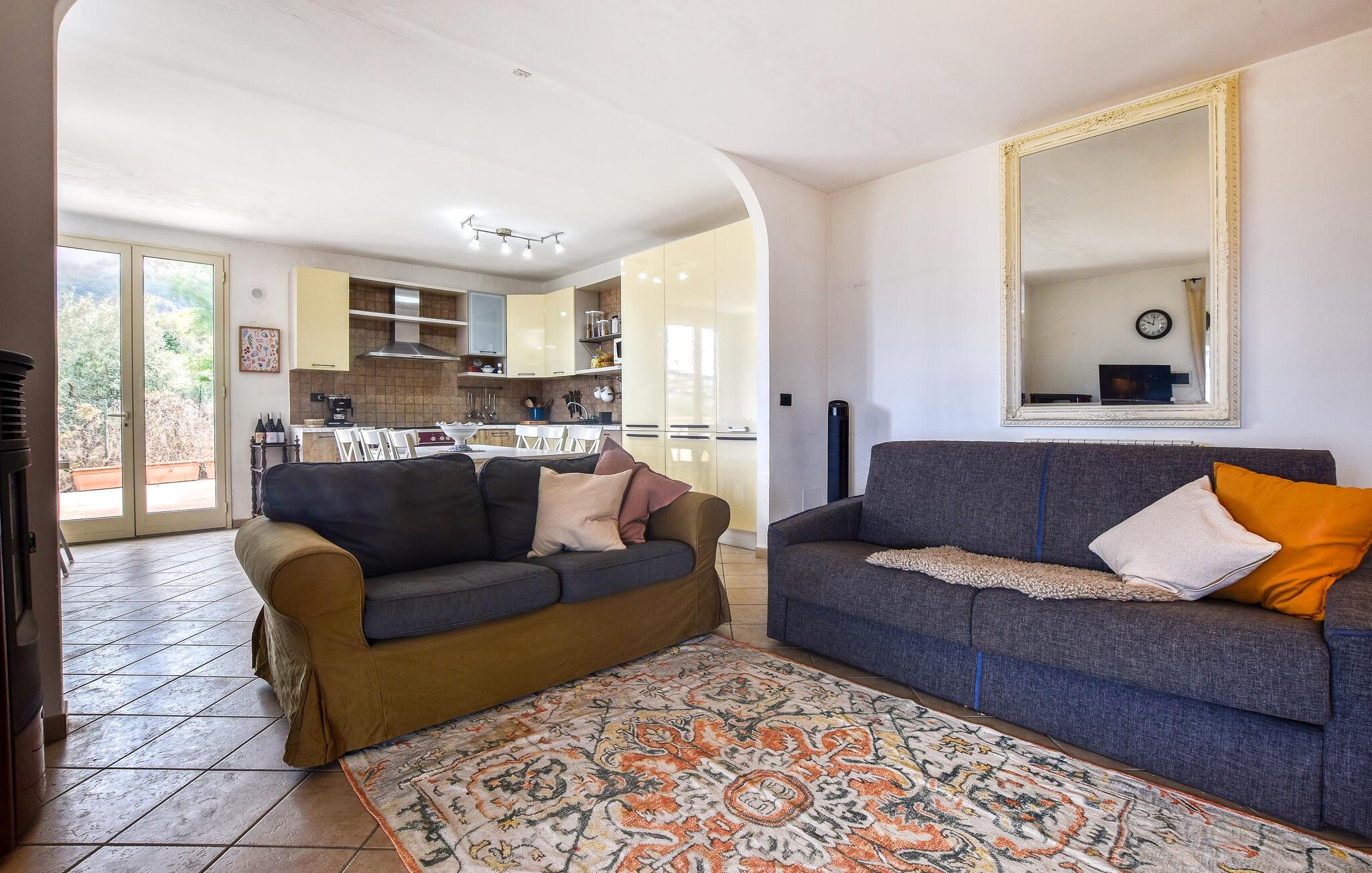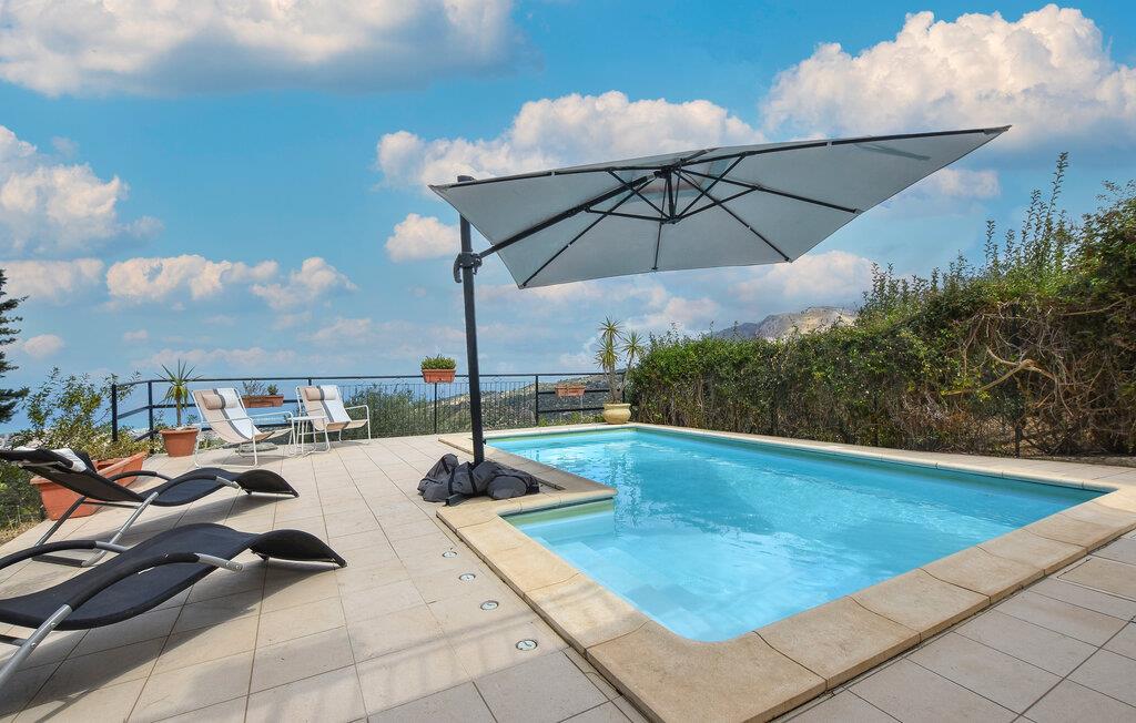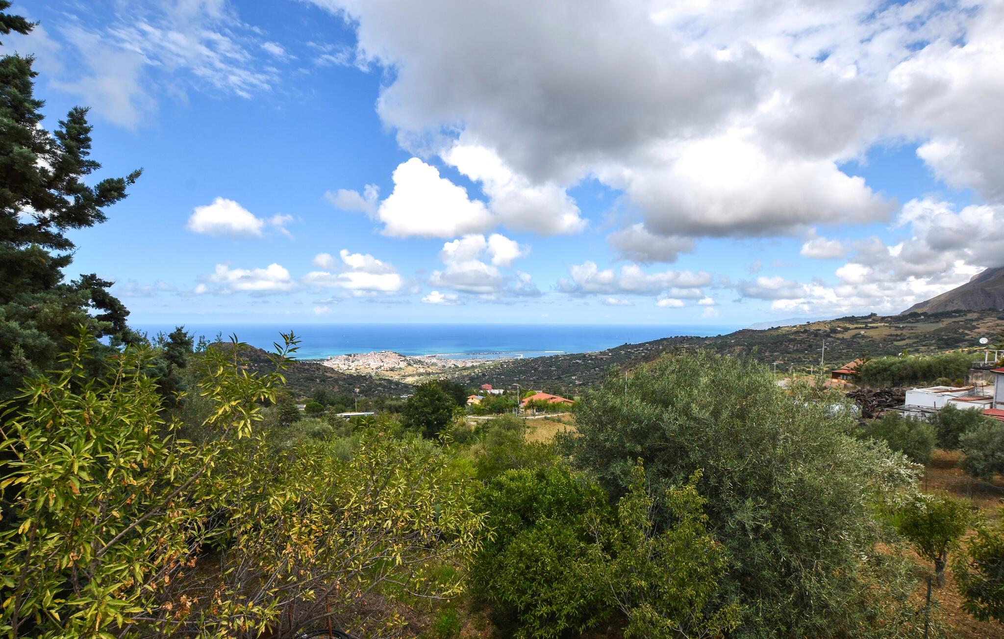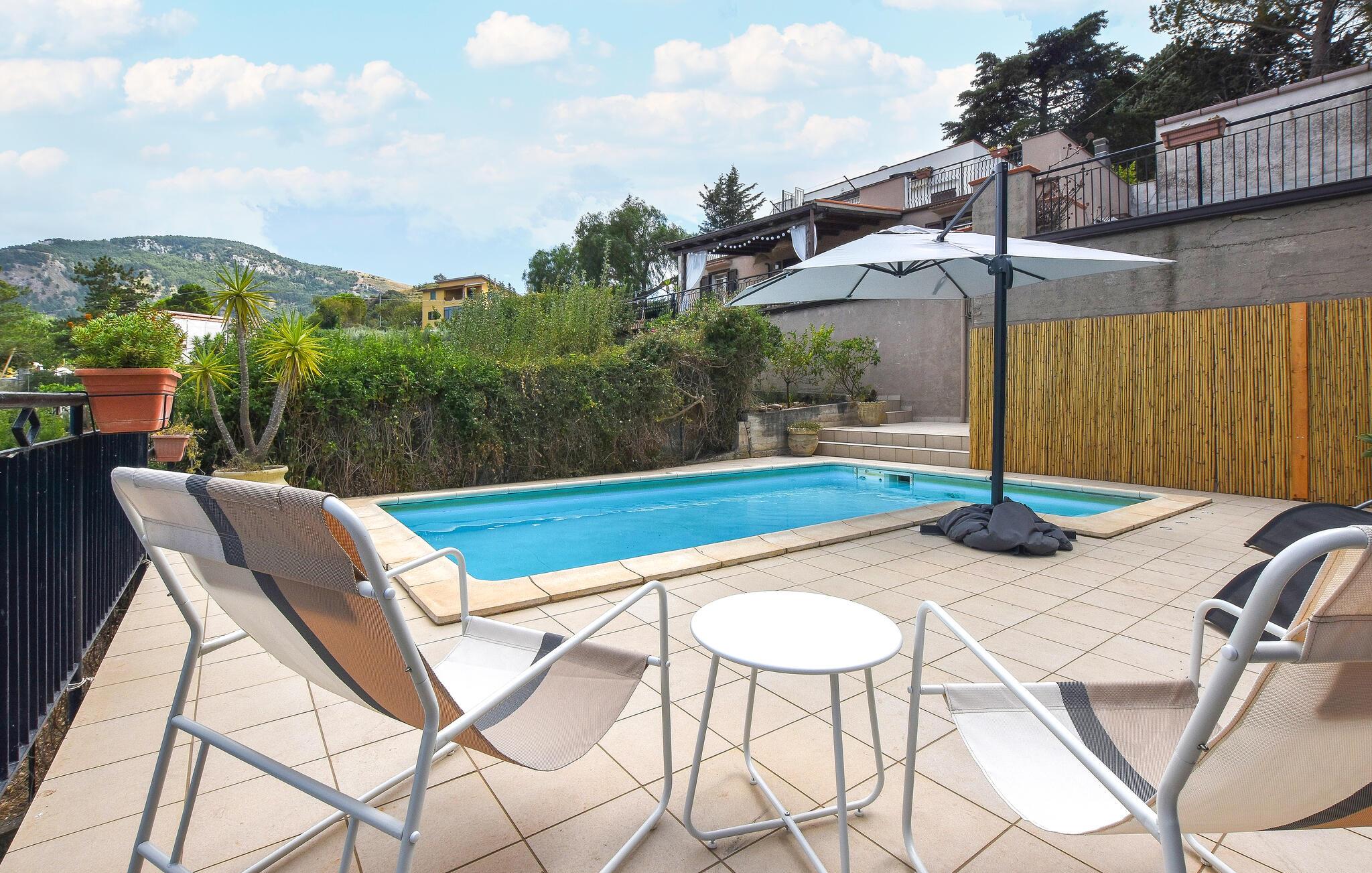 Nyd en smuk panoramaudsigt helt ned til havet i dette komfortable feriehus med pool.