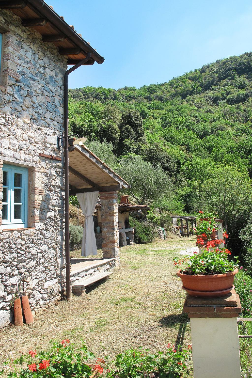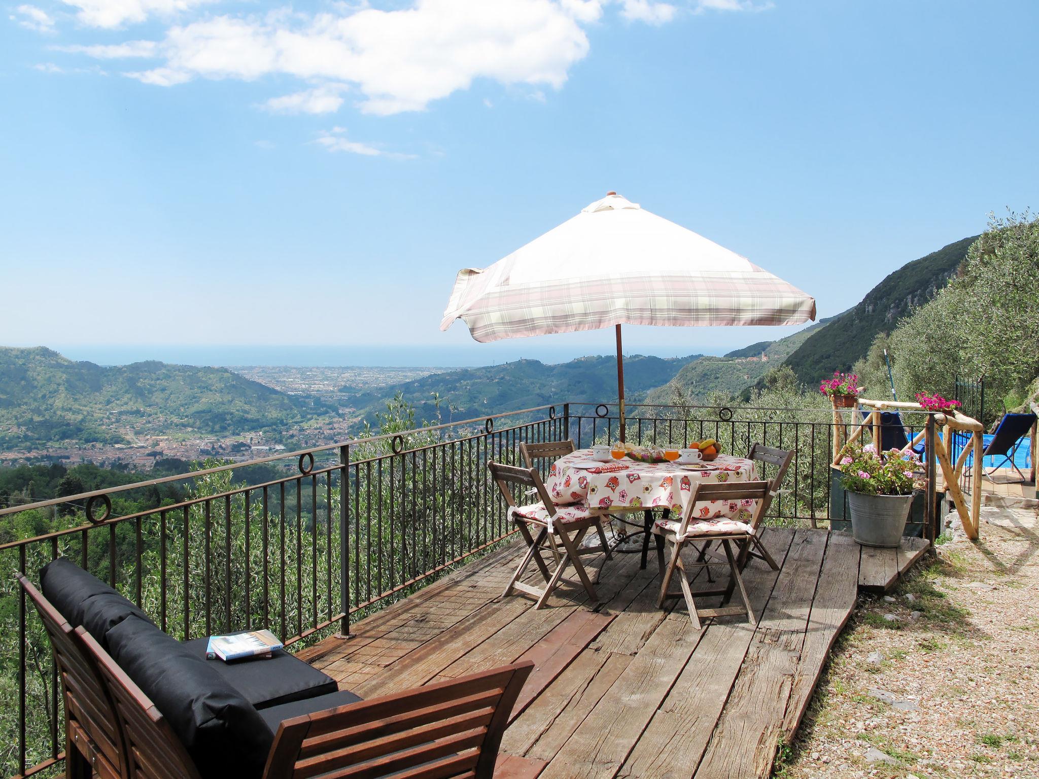 Metato 8 km from Camaiore: Cosy "rustico" cottage "Olivella", 400 m a.s.l., detached, surrounded by trees. 8.5 km from the centre of Camaiore, 1.5 km from the centre of Metato, outside the resort, 41 km from the centre of Pisa, in a secluded, sunny position on a slope, along the wooded area, 14 km from the sea, 14 km from the beach. Private: terraced garden, 5'000 m2 (not fenced) with trees, natural garden, meadow, swimming pool (above ground) (4 x 3 m, depth 100 cm, seasonal availability: 06.May. - 30.Sep.). In the house: central heating system, heating to be paid on the spot (28.Mar. - 30.Oct.), heating available only from 31.Oct. - 27.Mar.. Steep, narrow motor access (600 m via unmade road). Parking (for 2 cars) on the premises. Supermarket 5 km, restaurant 5 km, bus stop 550 m, railway station "Viareggio" 17.5 km, sandy beach "Lido di Camaiore" 14.5 km. Nearby attractions: Forte dei Marmi 27 km, Candalla Waterfalls 5 km, Grotta del Tambugione 1 km, Lucca 41 km, Riomaggiore (5 Terre) 84 km, Firenze 127 km. Well-known lakes can easily be reached: Torre del Lago 27 km. Hiking paths: Grotta all´Onda 13 km. Please note: car recommended. Local sale of farm products.