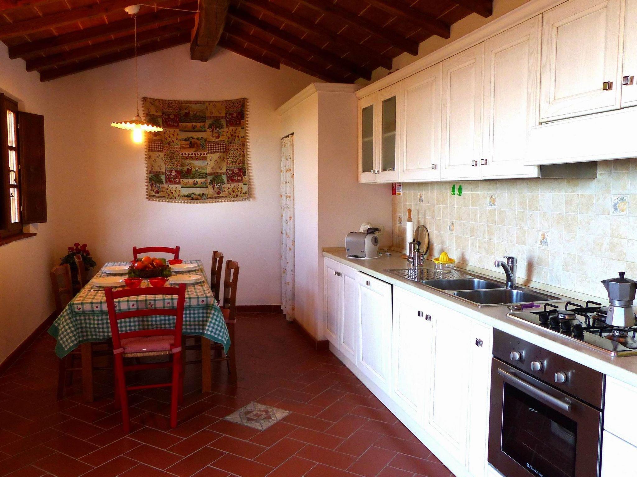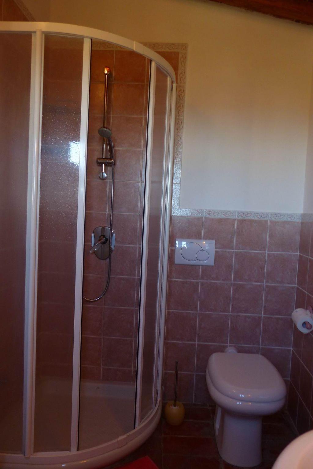 Ground floor with living room with double sofa bed and fireplace, large fully equipped kitchen, bathroom with shower.