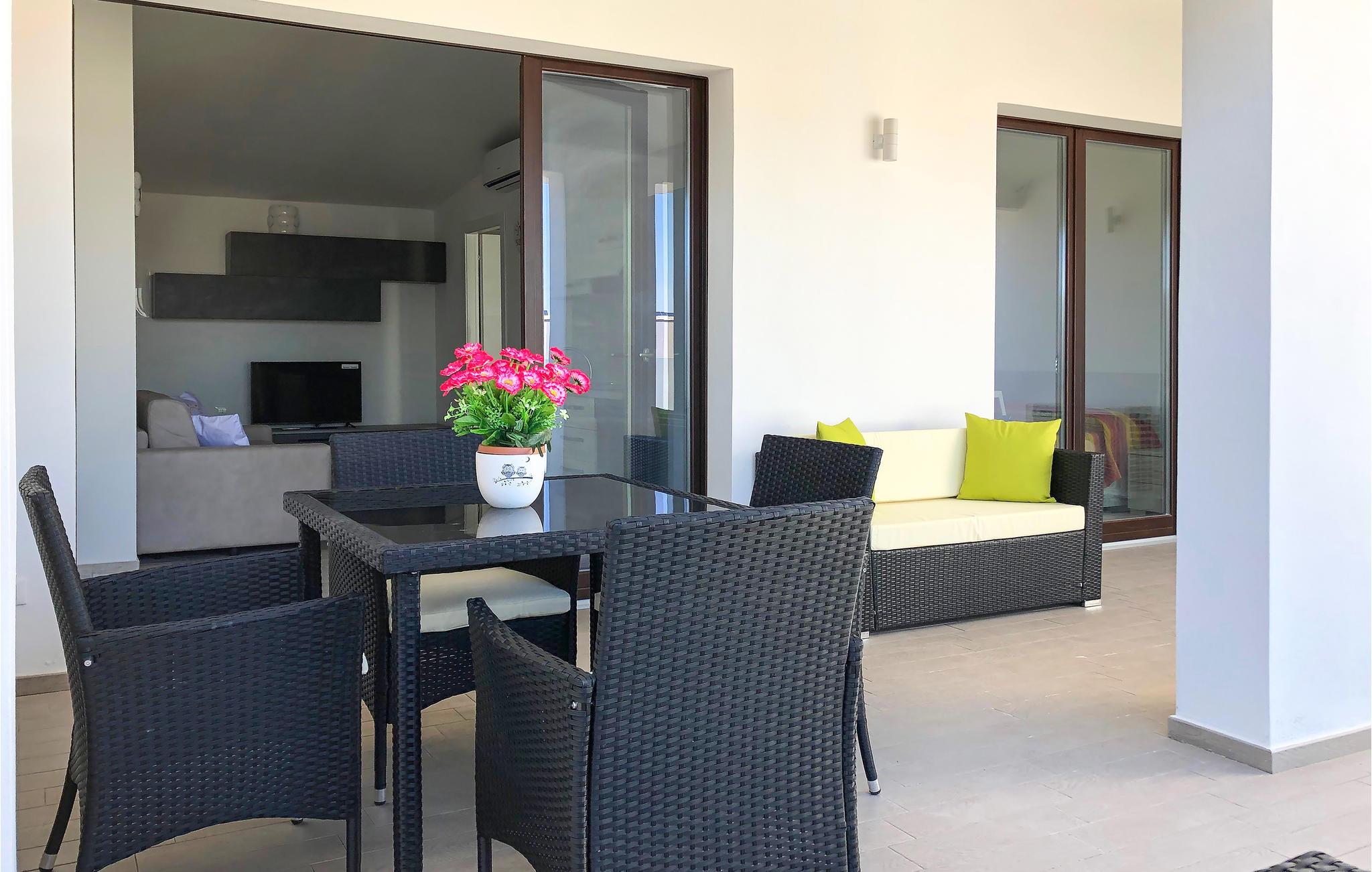 På den smukke terrasse med havemøbler kan I tilbringe fridagene i solen og nyde udsigten til havet og det omkringliggende område. På varme dage giver fællespoolen jer mulighed for at køle ned.