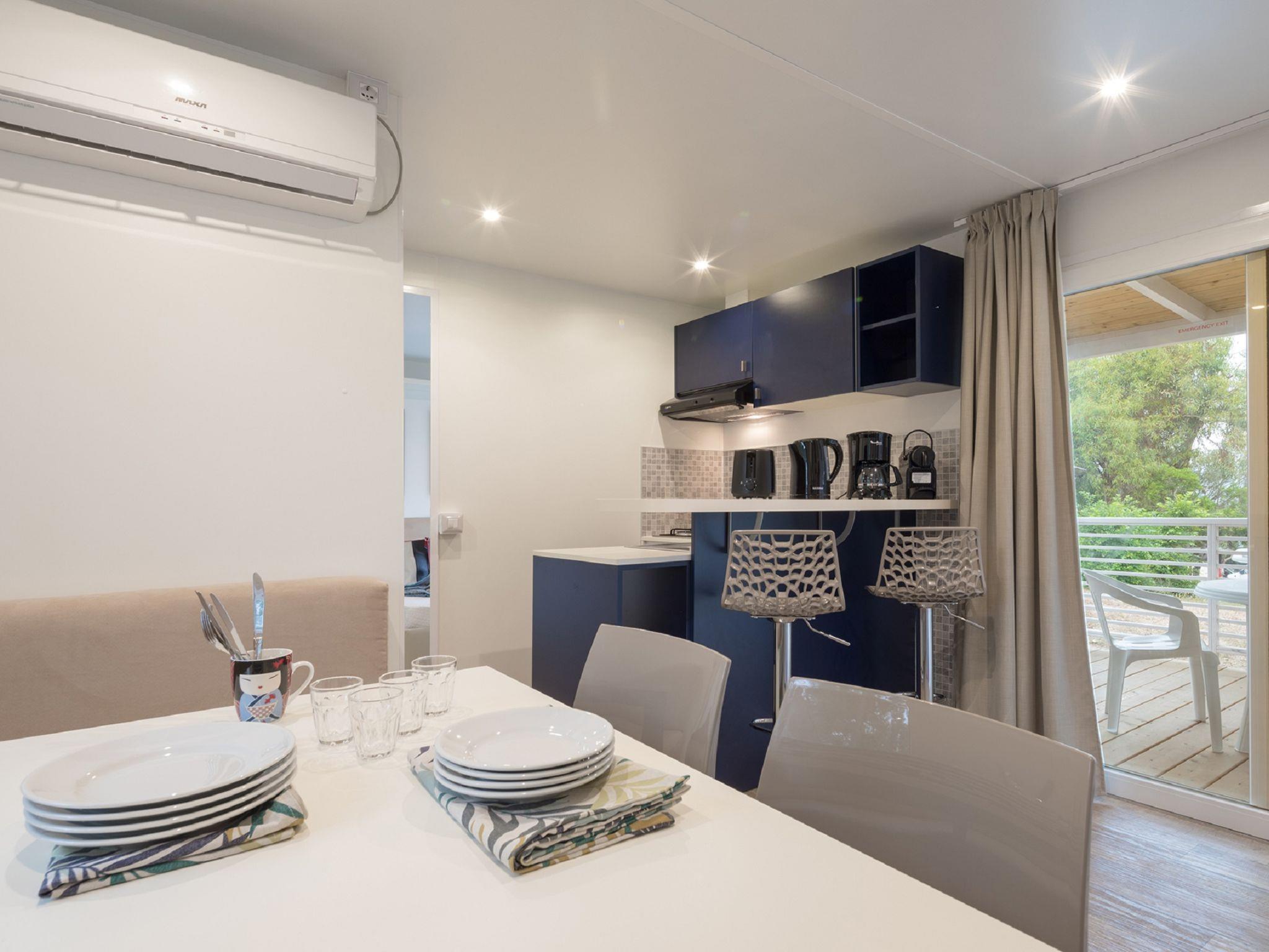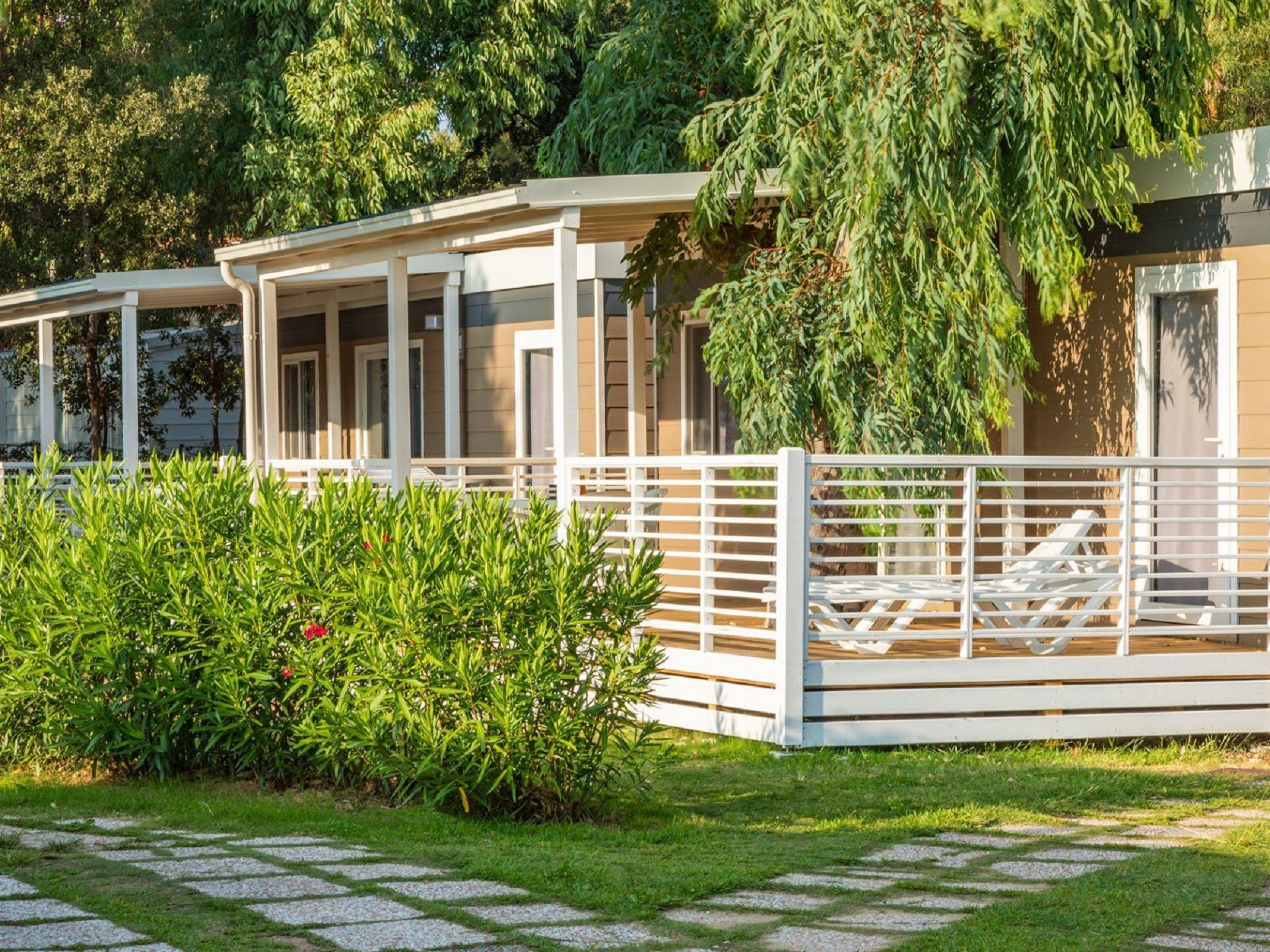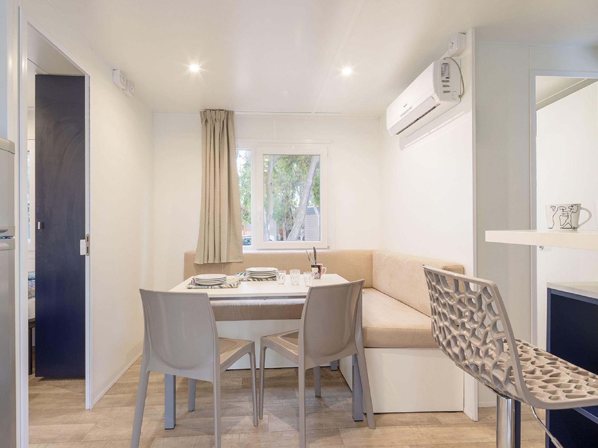 "Baia Elite", 4-room mobile home 33 m2. Modern furnishings: living/dining room with dining table. Exit to the terrace. 1 room with 1 french bed (140 cm), separate WC. 2 rooms, each room with 2 beds (70 cm). Kitchenette (4 gas rings, toaster, kettle, microwave, electric coffee machine). Shower/WC. Air-conditioning, forced-air heating. Terrace roofed. Terrace furniture. Parking (1 car). Please note: non-smokers only. Maximum 2 small pets/ dogs allowed. Beach service included from June 1st until Sept. 14th at the beach "spiaggia anfiteatro". IT090006B1000F1932