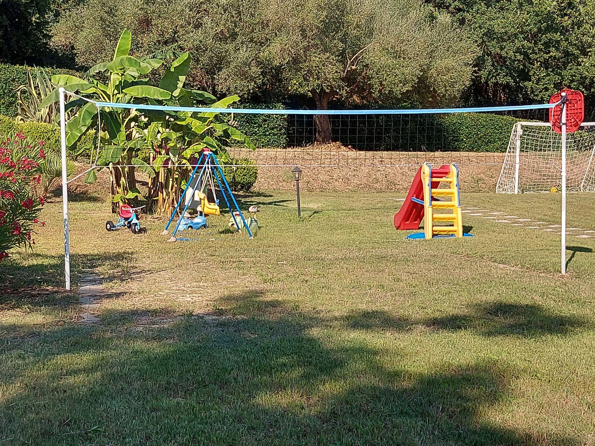 Outside, guests are greeted by a private veranda with table and chairs, perfect for enjoying meals in the open air, surrounded by a large garden with sun loungers. For the little ones, there is a well-equipped play area, as well as a delightful mini farm with animals, making your stay even more enjoyable.