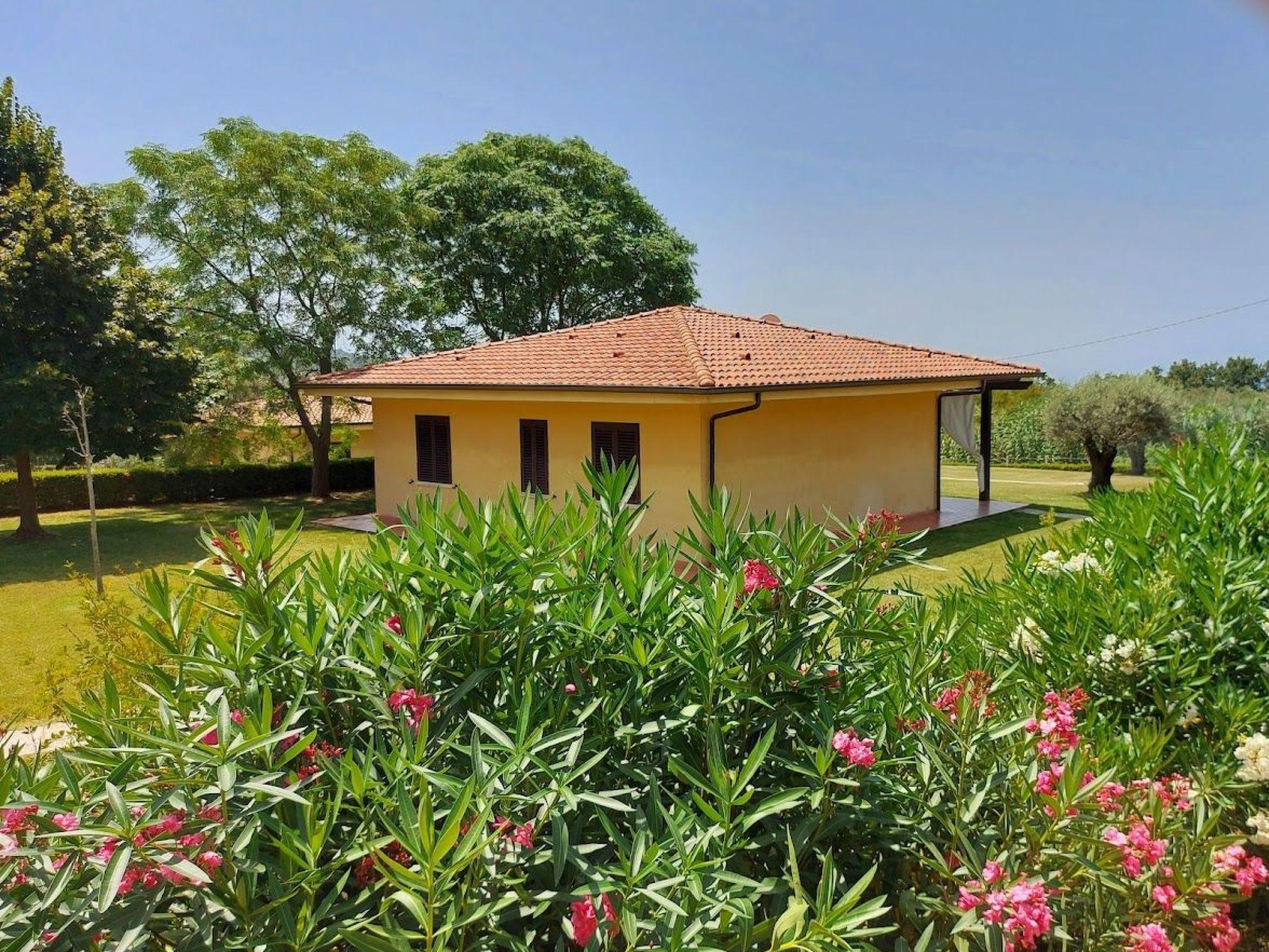 The interior of the villa, measuring 80 square metres, features a bright and spacious living room with a large window that illuminates the room, accompanied by a country-style kitchen fully equipped with everything you need for your meals, including modern appliances such as a dishwasher, fridge with freezer, oven, microwave, and much more.
