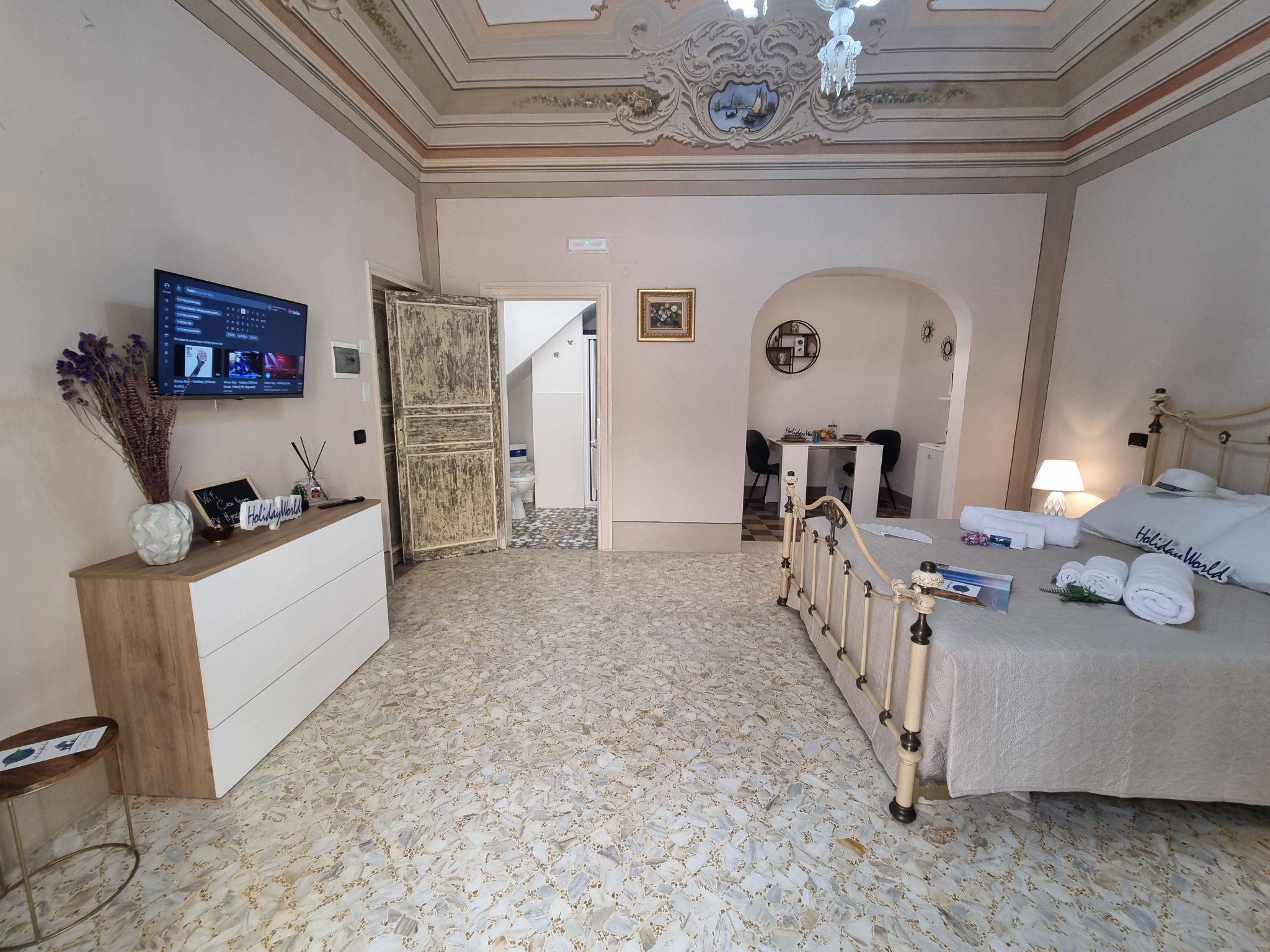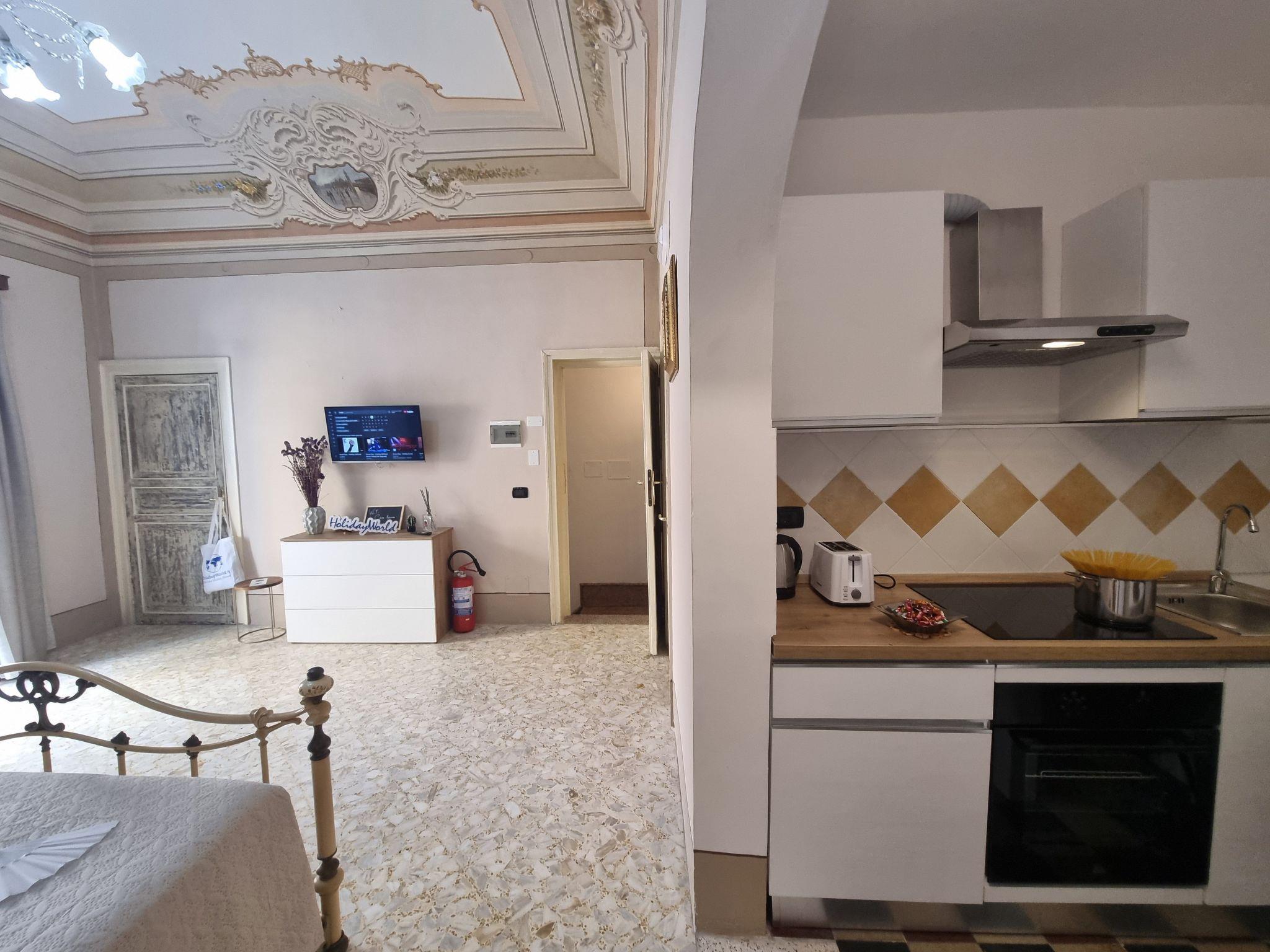 The flat consists of an equipped kitchenette with dining area, while the sleeping area has a double bed. The bathroom is complete with shower and bidet.