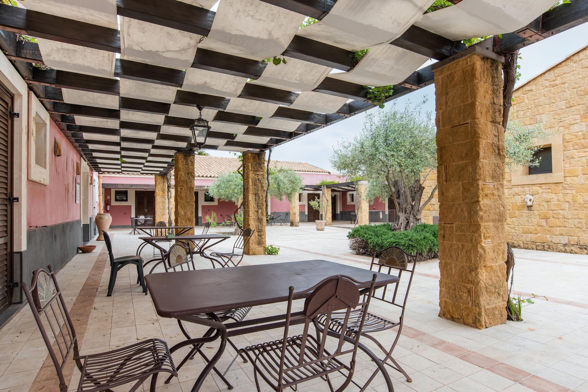 Roligt tilflugtssted med pool, sauna og udsigt til haven Flygt til det solbeskinnede landskab i det østlige Sicilien og slap af i dette charmerende feriehus for to. Gemt væk i Carlentinis frodige landskab, dette tilflugtssted med aircondition blander moderne komfort med naturlig sindsro. Indenfor finder du et stilfuldt møbleret opholdsrum med en dobbelt sovesofa, tv og et kompakt tekøkken - perfekt til lette måltider og aftenafslapning. Træd ind i den lyse vinterhave eller slap af på din private terrasse med et glas siciliansk vin. Nyd delt adgang til en glitrende pool (åben maj-september), en foryngende sauna og en smukt anlagt have, der er perfekt til familier med børn. Udforsk det østlige Siciliens bedst bevarede hemmeligheder Centralt beliggende kun 5 km fra havet og 8 km fra charmerende sicilianske byer, placerer hjemmet dig inden for rækkevidde af gyldne strande, lokale markeder og kulturelle perler. En carport sikrer bekvem parkering, og offentlig transport er tilgængelig kun 8 km væk. Uanset om du planlægger en dagstur til Syracusa, opdage barokke byer eller vandre nær Etna, er denne ejendom det perfekte startpunkt for dine sicilianske eventyr. Den nærmeste lufthavn ligger kun 23 km væk, hvilket gør ankomst og afgang ubesværet. Smag af Sicilien rundt om hvert hjørne Madelskere vil blive forkælet med et autentisk siciliansk køkken i nærheden. Nyd frisk fisk og skaldyr, hjemmelavet pasta og cannoli på lokale trattoriaer i Carlentini eller nærliggende Lentini. For en lokal favorit, tag til en landlig agriturismo, der tilbyder spisning fra gård til bord. Foretrækker at blive i? Nyd en hyggelig aften på terrassen med lokal vin og ost efter et spil tennis eller bordfodbold. Uanset om du er her for romantik eller afslapning, tilbyder dette hjem en uforglemmelig siciliansk flugt.