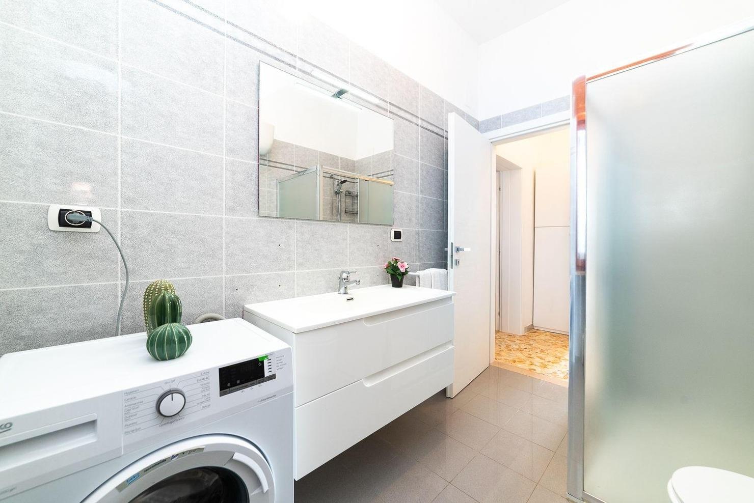 Das Badezimmer mit Fenster bietet eine Duschkabine, komplette Sanitäranlagen, eine Waschmaschine und ein komplettes Willkommensset mit Shampoo, Spülung und Duschgel.