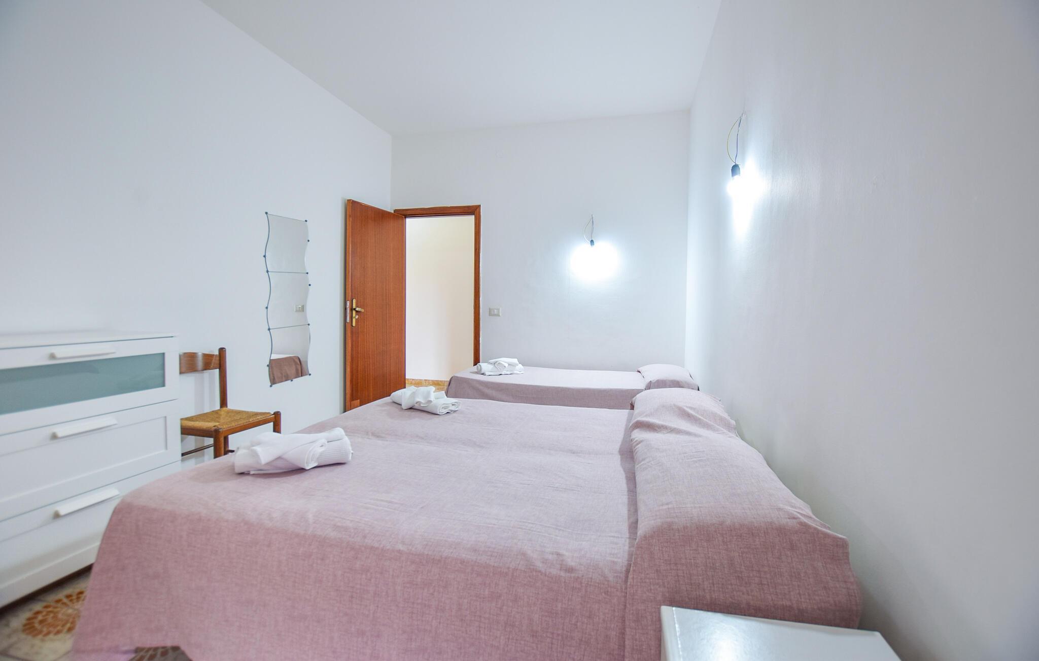 Denne lyse og praktisk indrettede lejlighed ligger kun få skridt fra sandstranden og tilbyder den ideelle base for en afslappende og varieret ferie med familien. Tilbered lækre pastaretter, planlæg jeres aktiviteter over hyggelige måltider og afslut en begivenhedsrig dag med en spilleaften.