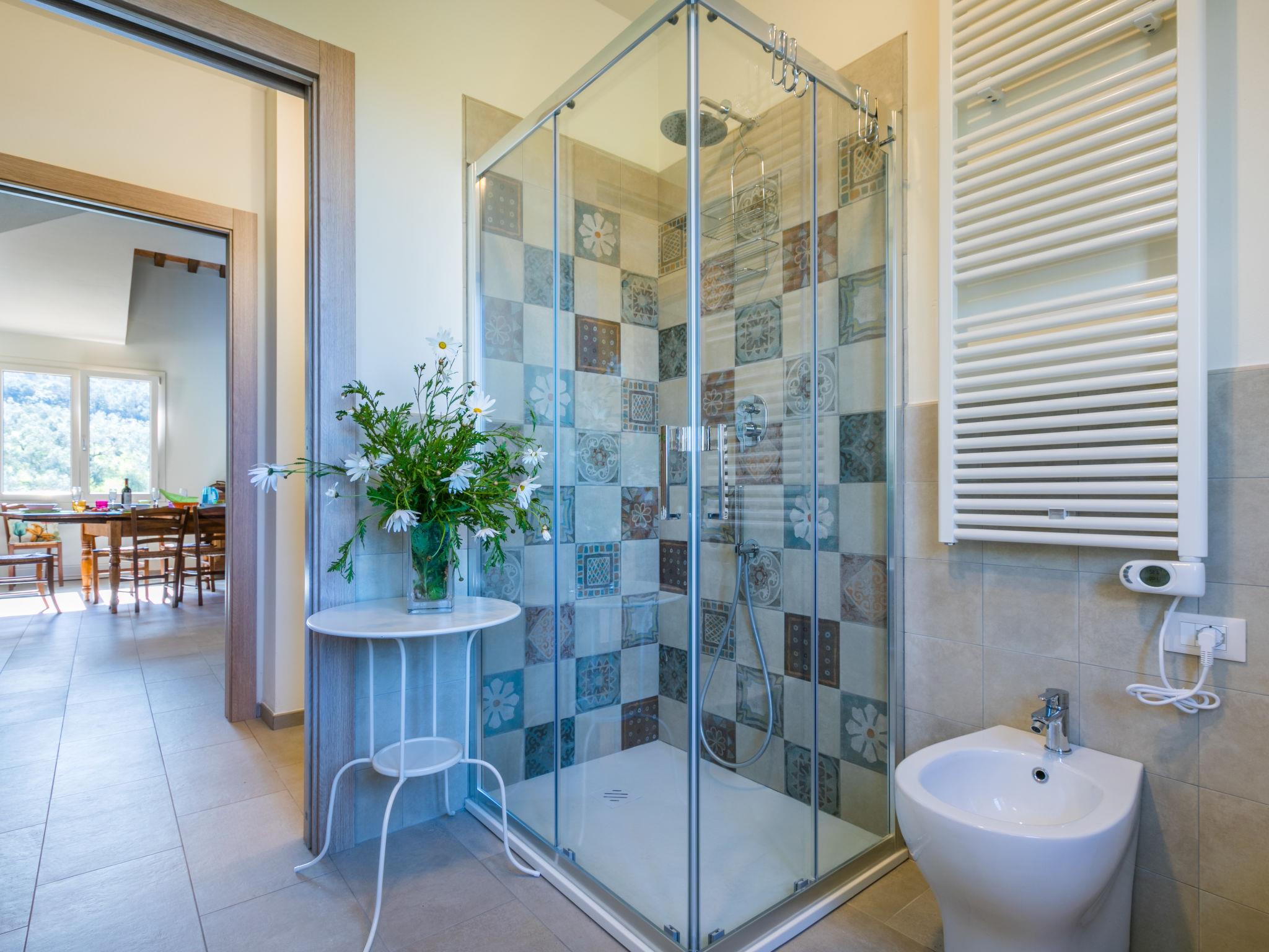 3-room house 100 m2. Beautiful and modern furnishings: open large living/dining room with dining table and TV. Exit to the garden, to the terrace. 2 double bedrooms. Open kitchen (oven, dishwasher, 4 induction hot plates, toaster, kettle, electric coffee machine). Bath/bidet/WC. Electric heating, air-conditioning. Solar power. Upper floor: gallery with 2 beds. Large garden. Terrace furniture, barbecue (portable), deck chairs. Beautiful panoramic view of the countryside and the town. Facilities: washing machine. Internet (WiFi, free). Parking at the house. Maximum 1 pet/ dog allowed. Instead of an enclosed bedroom, some sleeping areas are located in an open-plan area (gallery, alcove, etc.). Bedlinen, towels, final cleaning and all energy costs are included. IT050006C28UZQVXPS