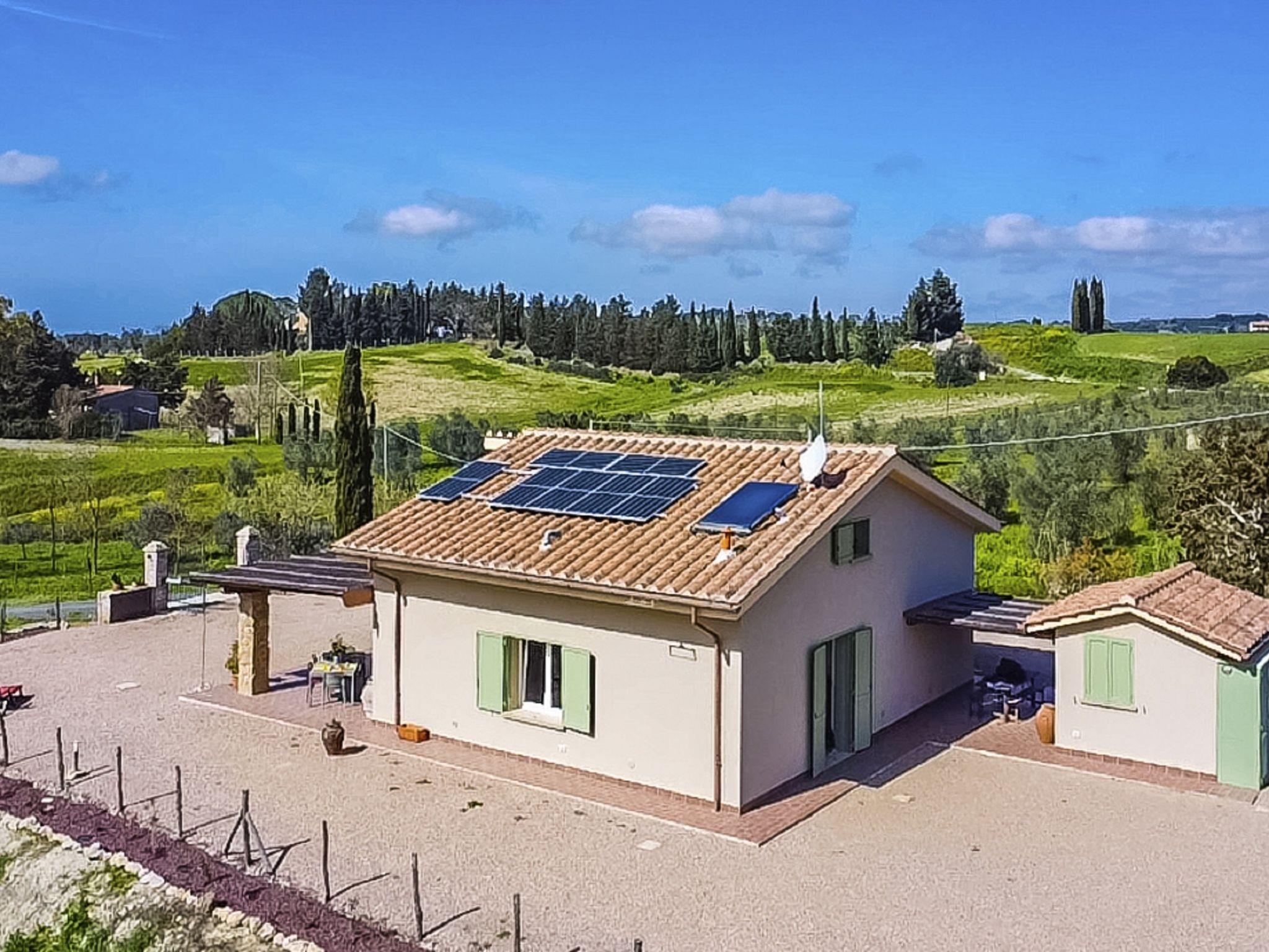 Modern, beautiful house "Nena", surrounded by fields and vineyards. 3 km from the centre of Casale Marittimo, 5.5 km from the centre of Bibbona, 13 km from the sea, 13 km from the beach. Private: property 4 ha, garden (fenced). Motor access (1 km via unmade road). Parking at the house. Grocery 3 km, supermarket 12 km, bar 3 km, bakery 3 km, bus stop "Bivio 3 Comuni" 2 km, sandy beach "Marina di Bibbona" 13 km, rocky beach "Castiglioncello" 33 km, thermal baths "Calidario" 36 km. Surf school 18 km. Nearby attractions: Bolgheri 11 km, Pisa 68 km, Lucca 94 km, Firenze 140 km.