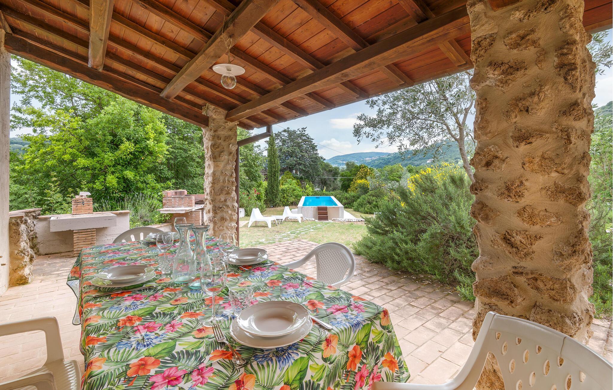 Nyd lange aftener på den overdækkede terrasse eller ved stengrillen og slap af i den private, lavvandede pool, mens du nyder den betagende udsigt over de omkringliggende bakker og landsbyer.