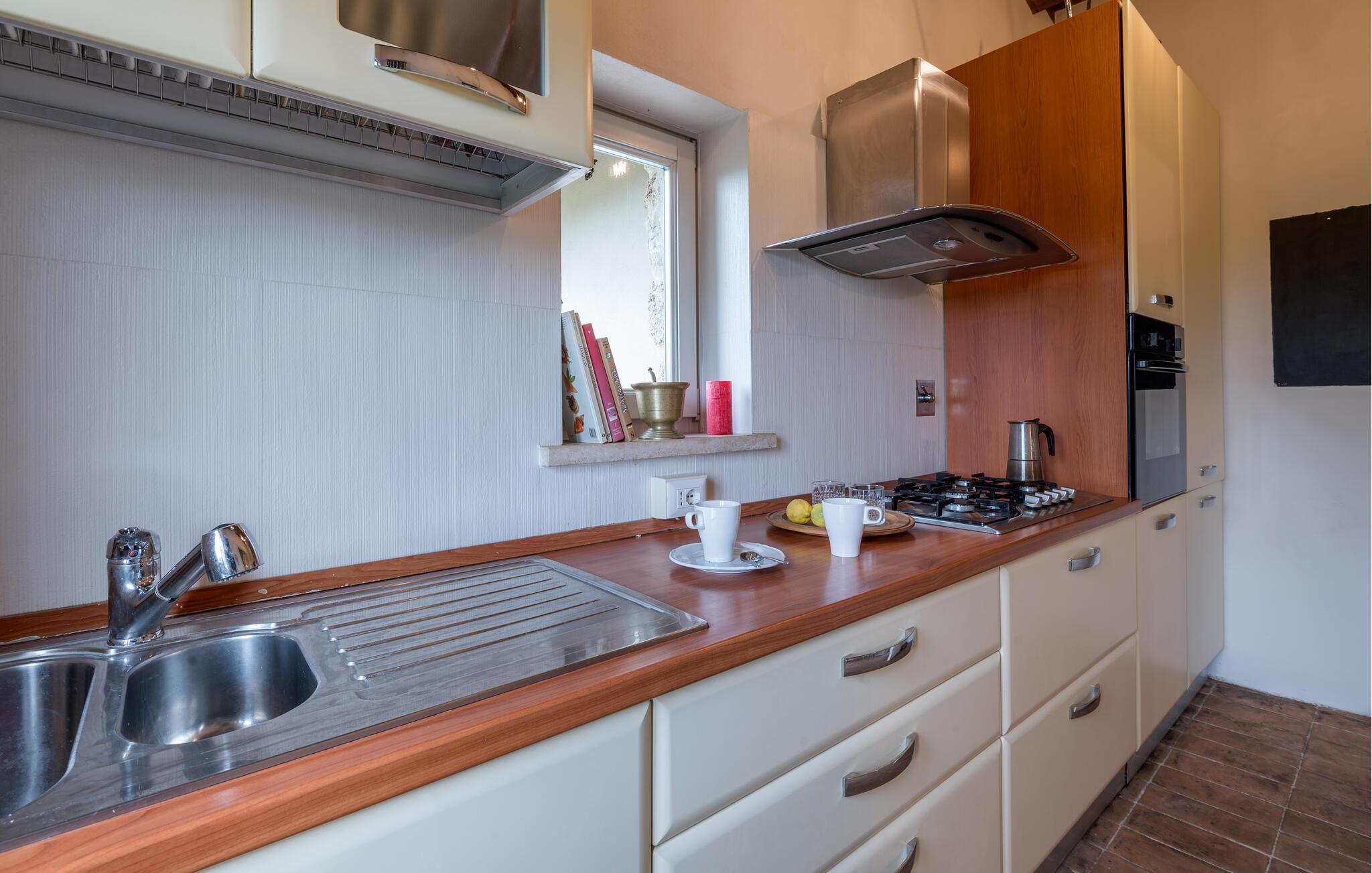 Dette charmerende stenhus i Casaprota inviterer dig til en ferie i absolut fred, ro og natur. Det nænsomt restaurerede hus kombinerer rustik charme med shabby chic-stil, hvilket skaber en varm og hyggelig atmosfære. Det åbne opholdsområde udstråler autentisk komfort med sine høje trælofter og naturlige materialer. Nyd din feriehverdag her, gør dig godt tilpas og lad dine kære lave mad til dig.