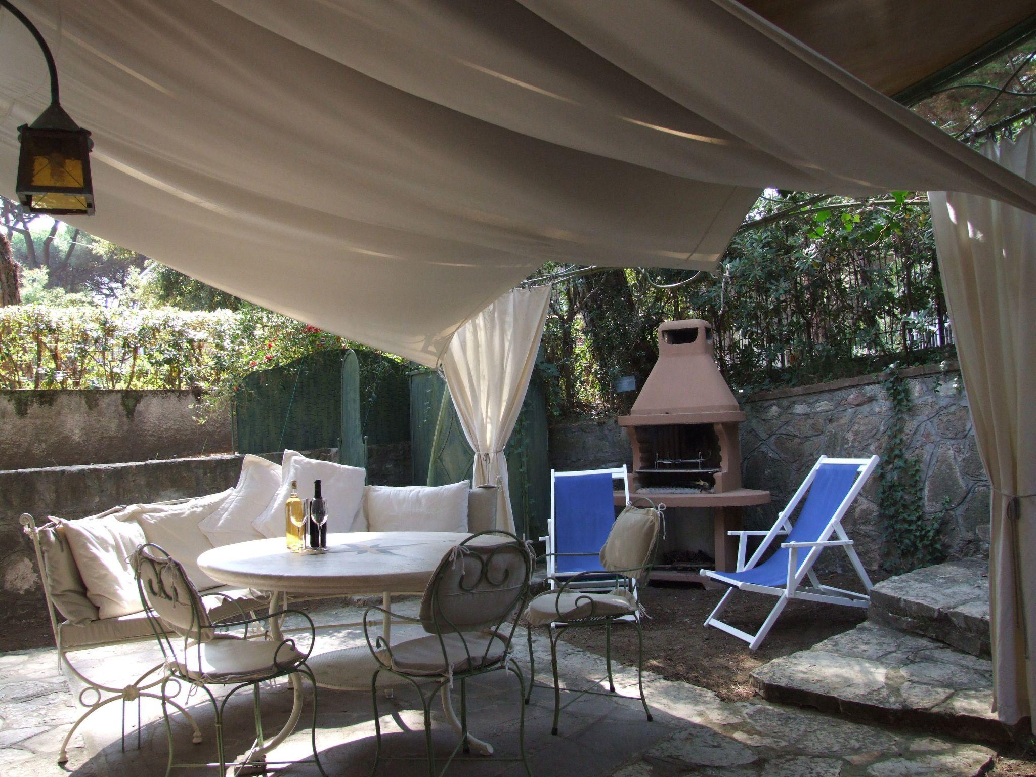 The flat has a private area in the garden under a pergola, where you will find a marble table, chairs and a wrought-iron sofa with comfortable cushions.