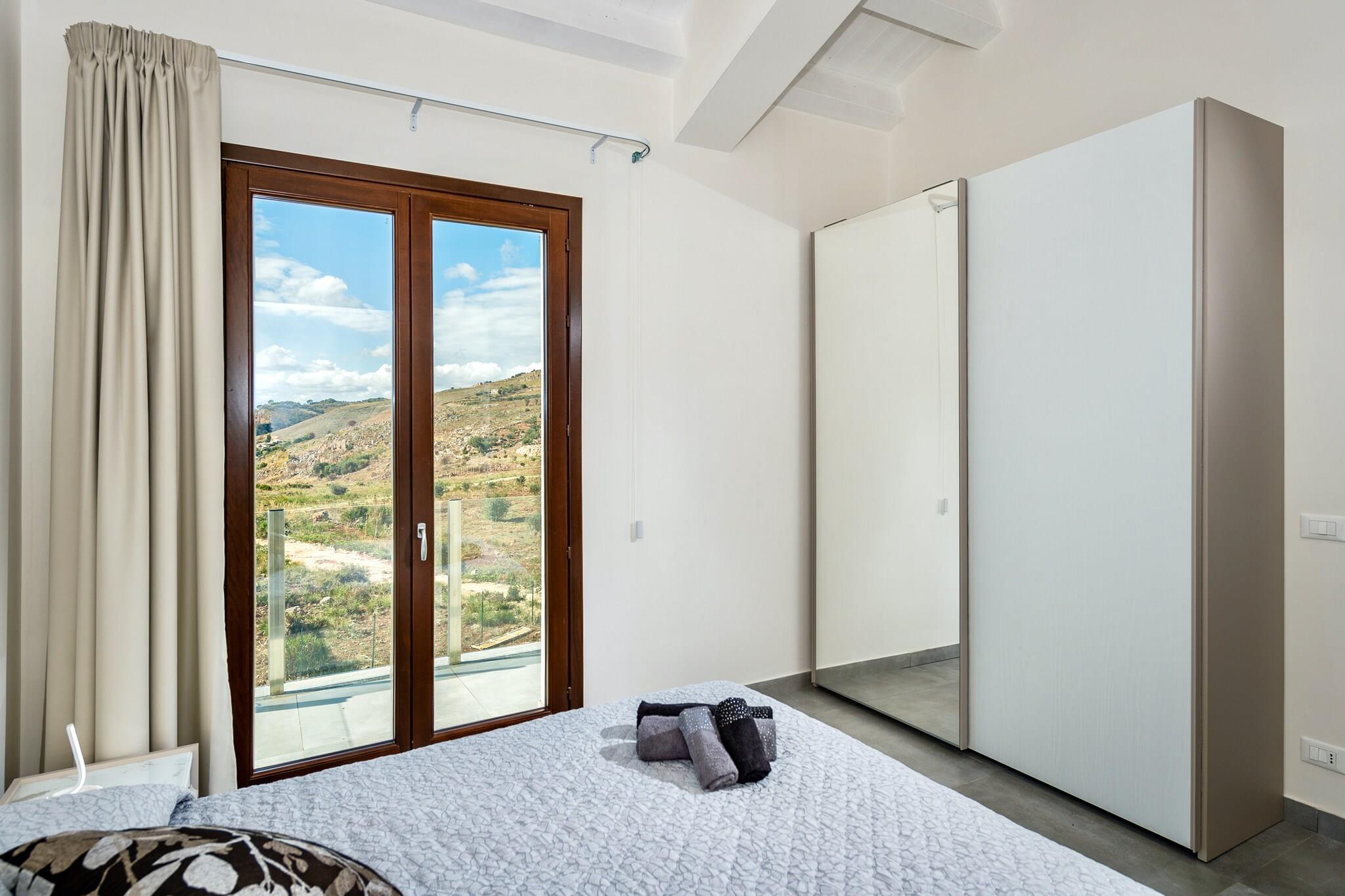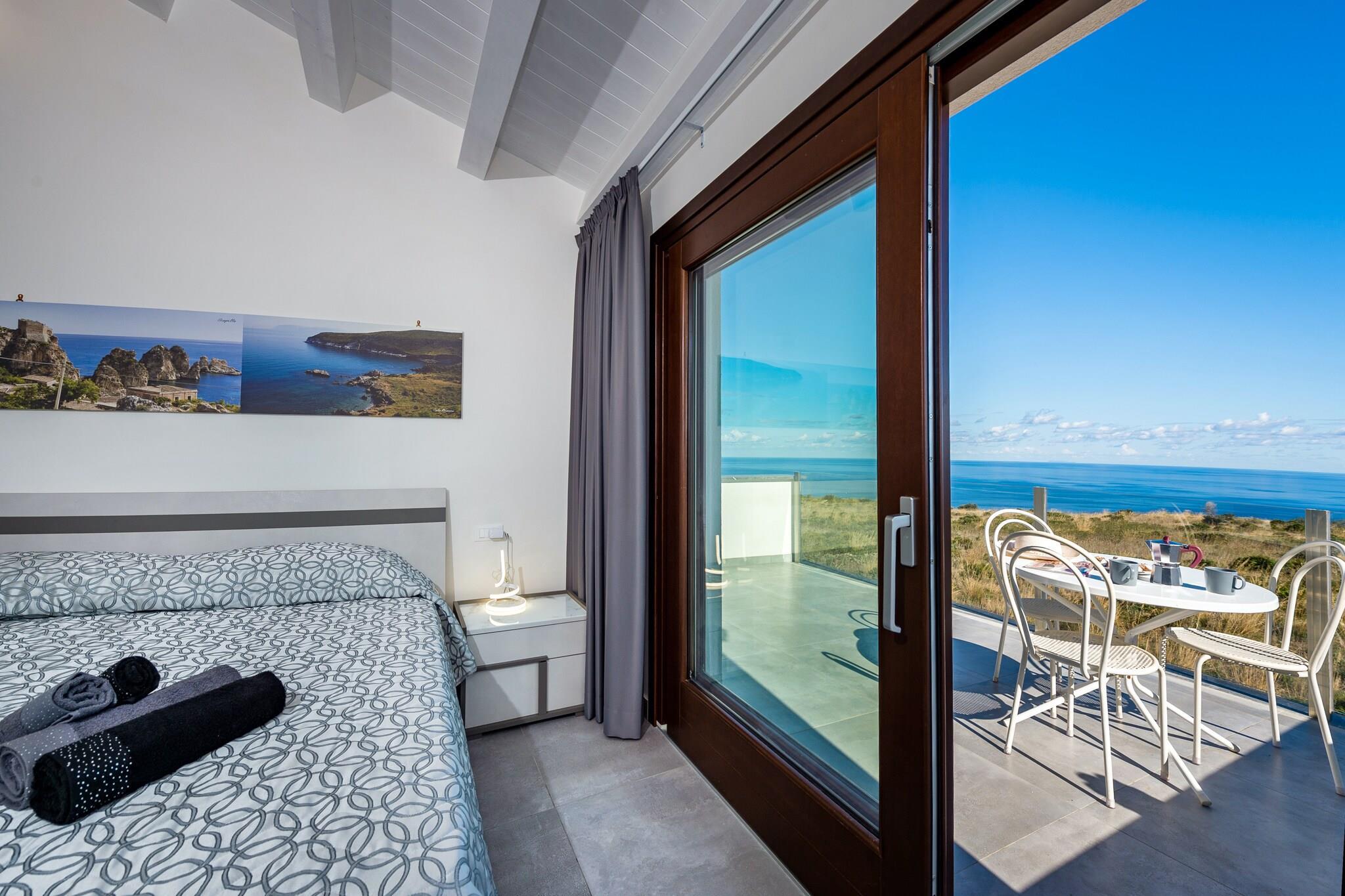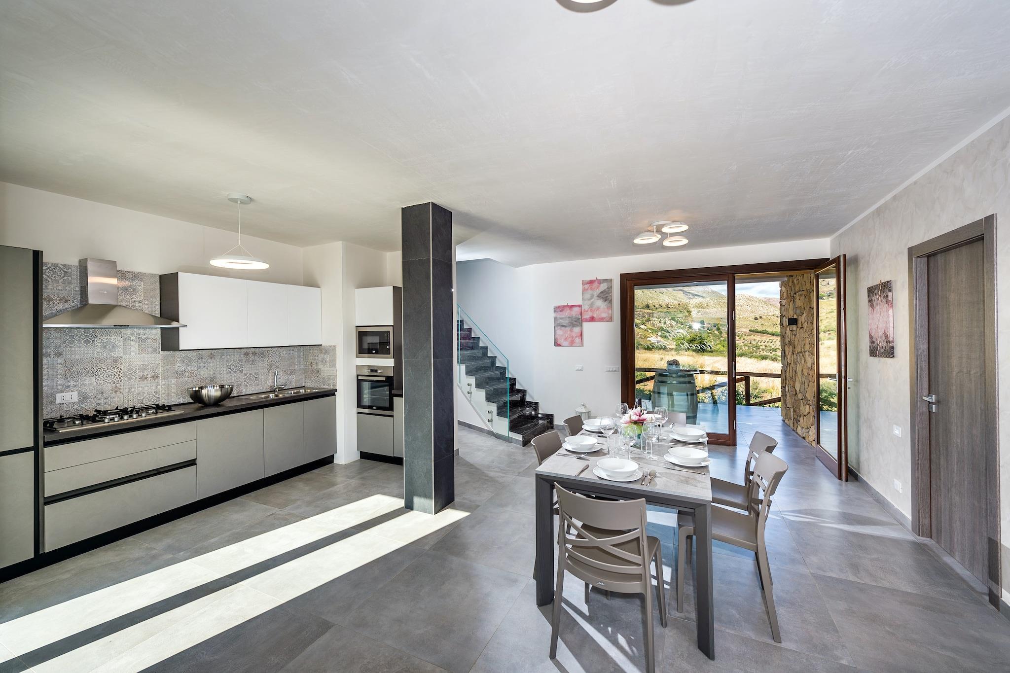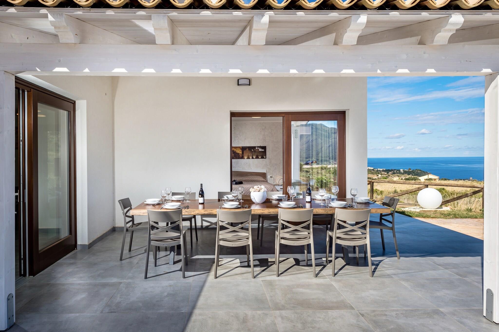 The Villa is placed in a dominant area next to Scopello, in western Sicily. The area around the property “Rocchi Livreri” has a very high landscape value with its bays and crystal waters, classified by the European Community as Site of Community Importance (SCI) and Special Protection Area (SPA). Villa Rocchi Livreri is an elegant property with private pool, designed in a modern architectural style. The furniture is sober and sophisticated at the same time and all is very accurate in every detail. Its location offers a beautiful view over the entire coast of Castellammare del Golfo, thanks also to the suggestive panoramic terrace. The villa extends over two levels: the ground floor overlooks two comfortable verandas, where the guests can enjoy a relaxing stay, the view over the sea and the nature surrounding the villa. The house is accessed from a bright and spacious living room including a fully equipped kitchen. On the same floor there are a double bedroom with an en-suite bathroom and a shared bathroom with shower. A comfortable staircase leads to the first floor with three double bedrooms, one of these has a big balcony with sea view and an en-suite bathroom. There is the possibility to add a single bed into two of three bedrooms, which result in two triple bedrooms. Next to the bedrooms there another bathroom with shower. The property has an independent access, a very big natural garden scattered with milky-white rocks, where the guest can enjoy the gorgeous private pool and beautiful panoramas. The stunning panoramic view over the Gulf of Castellammare and the Bay of Scopello is framed by large windows embellishing the villa. The landscape becomes the leitmotif which gives guests a feeling of peacefulness. Villa Rocchi Livreri is the ideal accommodation for tourists and it’s the perfect spot for visiting the beautiful landscape of Western Sicily: in just few km you will reach Castellammare del Golfo, the medieval village of Erice, the city centers of Trapani and Marsala in which you can visit saltworks with their ancient mills, the greek sites of Segesta and Selinunte and the Egadi Islands. Villa Rocchi Livreri is halfway between Trapani and Palermo airports (50 km ca. from both of them).