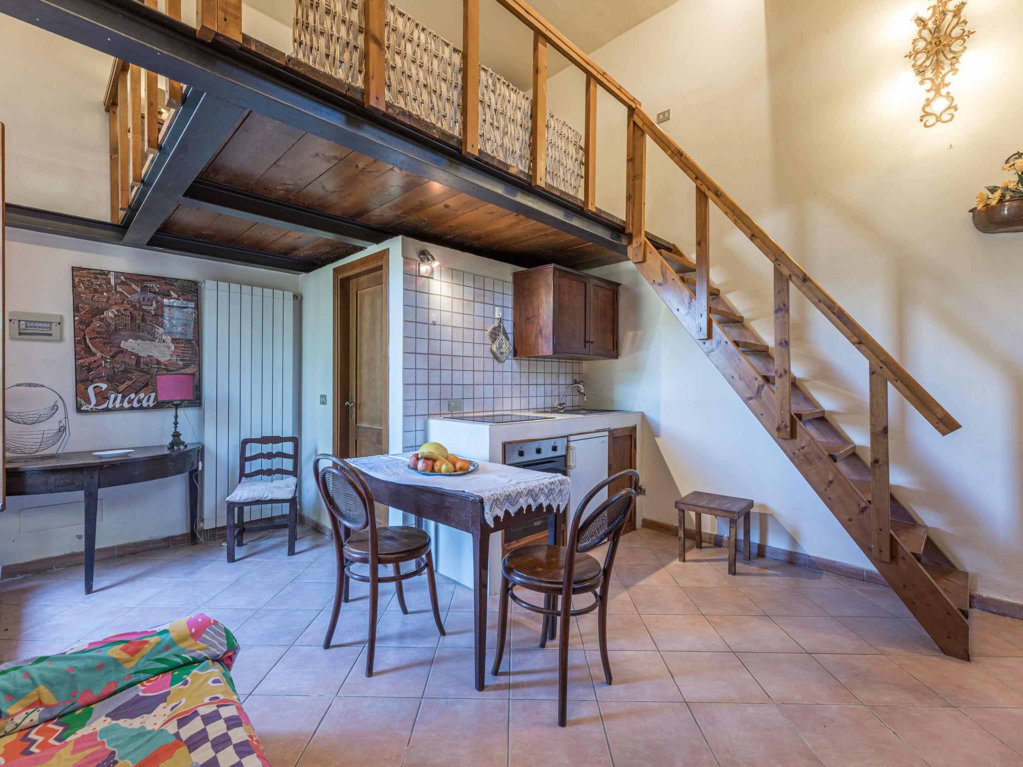 "Le Macine", 2-room apartment 30 m2 on 2 levels. Practical and rustic furnishings: small living/sleeping room with dining table, kitchen corner and TV (flat screen). Open kitchen (oven, 4 induction hot plates, kettle, electric coffee machine). Shower/WC. Upper floor: (steep stair) open gallery with 1 double bed. Gas heating (extra). Patio. Terrace furniture, barbecue. Very beautiful panoramic view. Facilities: children's high chair, baby cot for up to 2 year olds. Internet (WiFi, free). Parking (roofed) at the house. Please note: non-smokers only. Maximum 1 pet/ dog allowed. Private entrance, fire extinguisher. IT052005B57VSC3FJ8