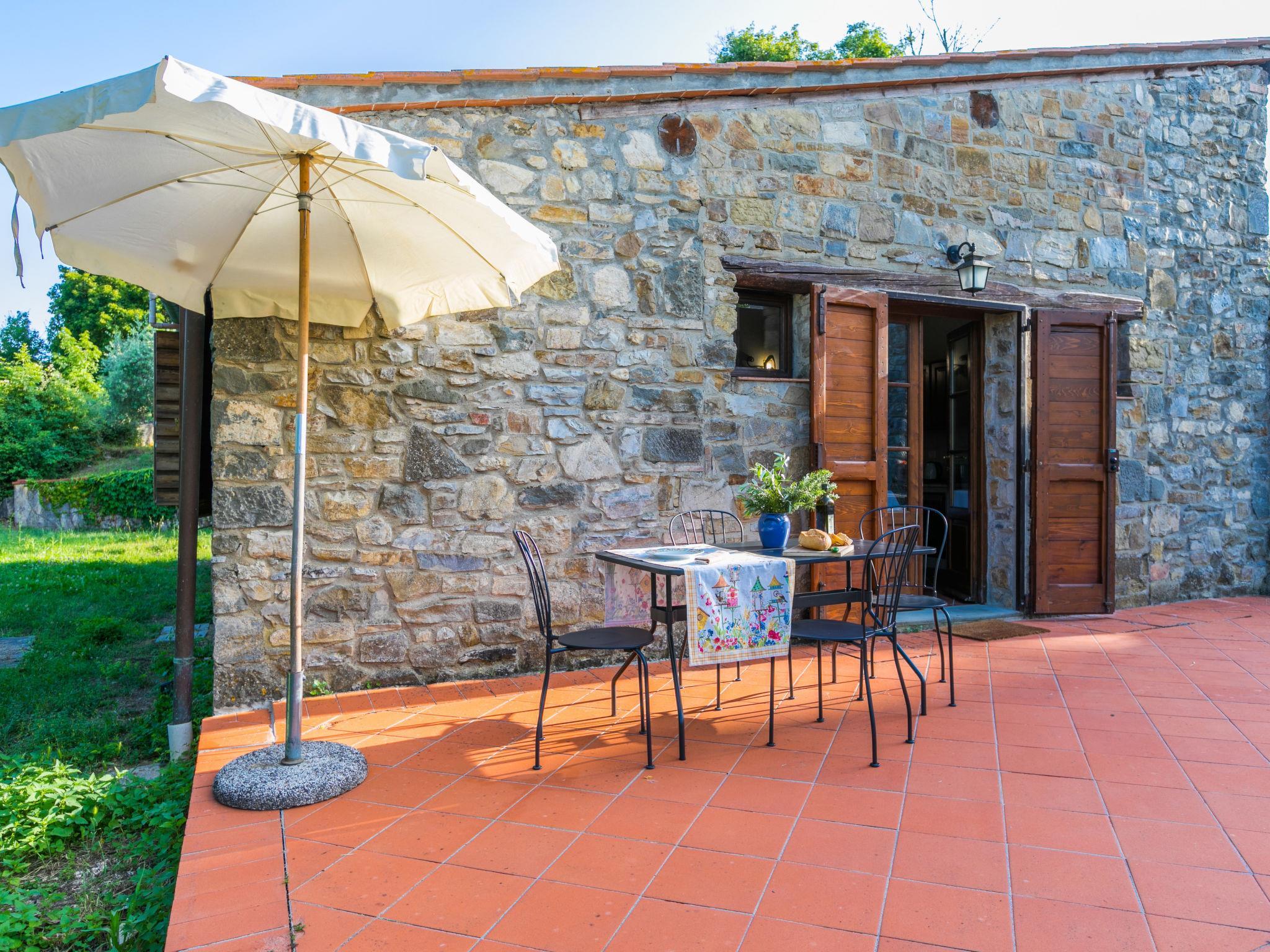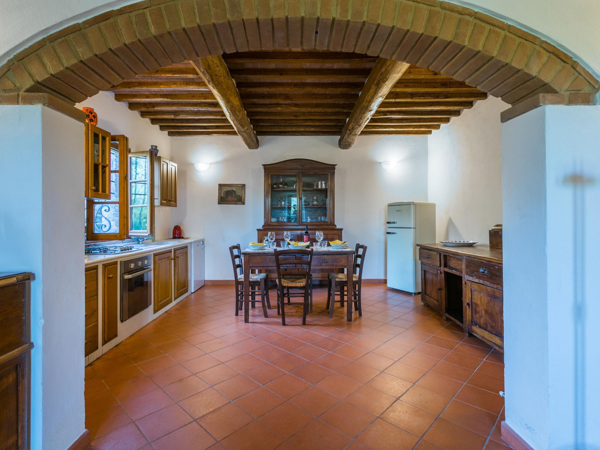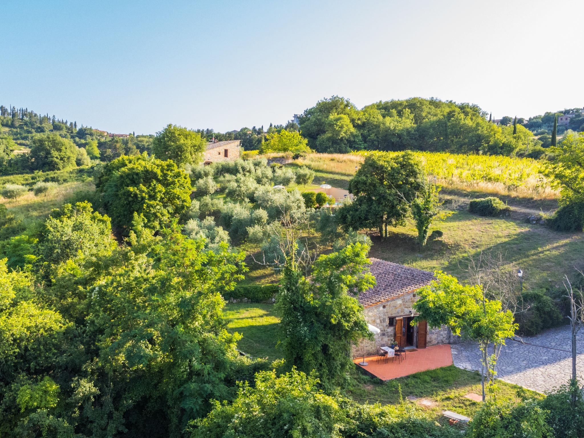 Castellina in Chisnti: Cosy, historical country house "Cerretino group house 14 sleeps", 2 storeys, surrounded by meadows, fields and vineyards. Property composed of main house and outbuilding 1 km from the centre of Castellina in Chisnti, in a sunny position, 200 m from the edge of the forest, in the countryside. Private: natural state property, swimming pool (6 x 12 m, depth 100 - 180 cm, seasonal availability: 15.May. - 15.Oct.). Outdoor shower, terrace, garden furniture, barbecue, pool maintenance by the owner/gardener. In the house: central heating system, air conditioning, washing machine, tumble dryer. 300 m long very bumpy, narrow motor access to the house. Parking at the house. Shop 1 km, grocery 1 km, supermarket 1 km, restaurant 1 km, bar 500 m, bakery 1 km, pedestrian zone 1 km, bus stop 300 m, sandy beach "Cecina Mare" 88 km, thermal baths "Rapolano Terme" 50 km. Walking paths from the house 200 m. Nearby attractions: Panzano in Chianti 13 km, Greve in Chianti 20 km, Gaiole in Chianti 20 km, Siena 26 km, San Gimignno 42 km, Firenze 50 km. Please note: baby equipment (included). Groups of teenagers on request only.