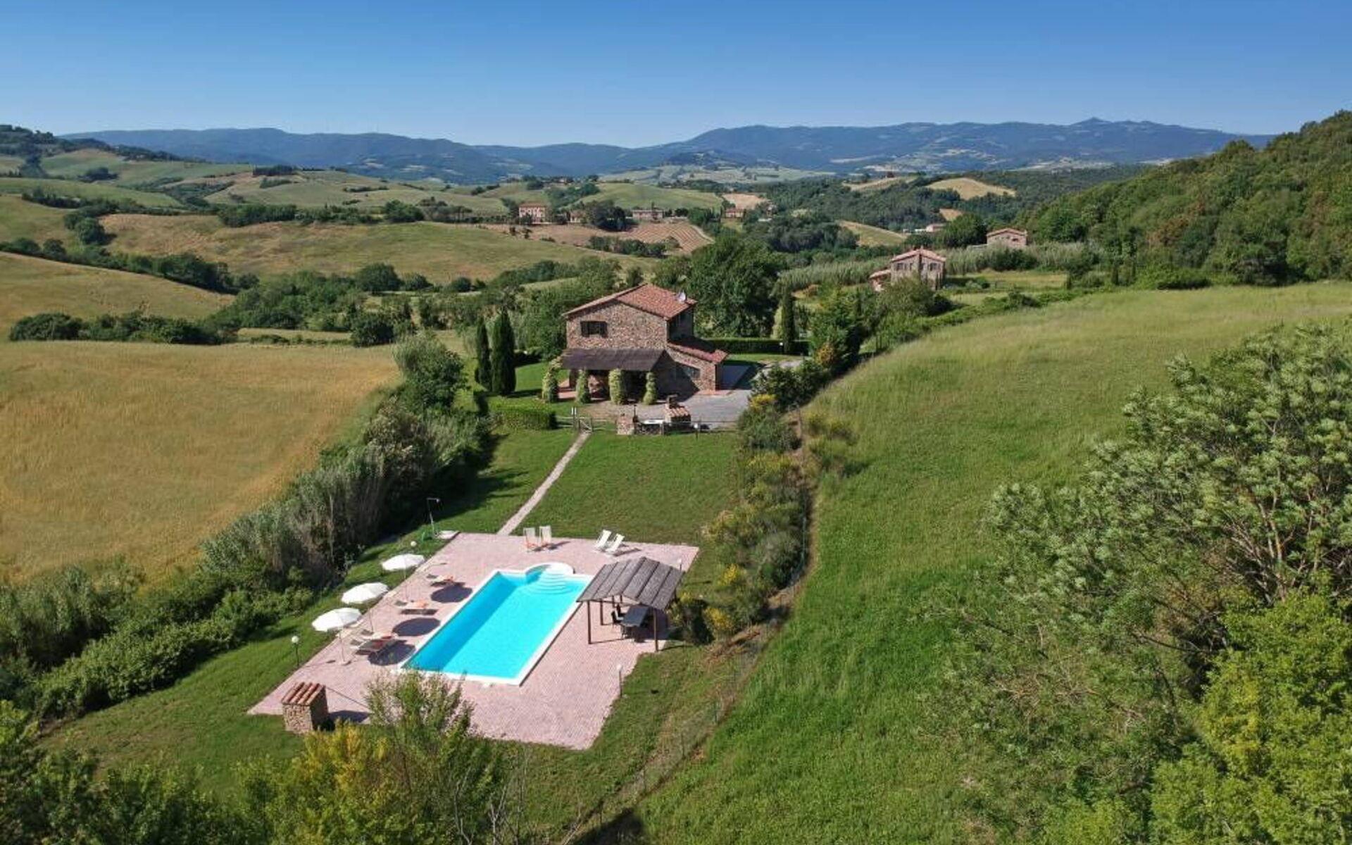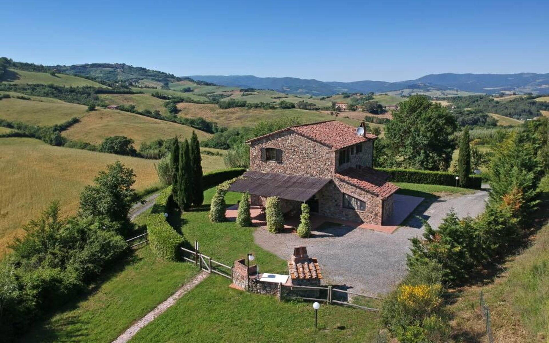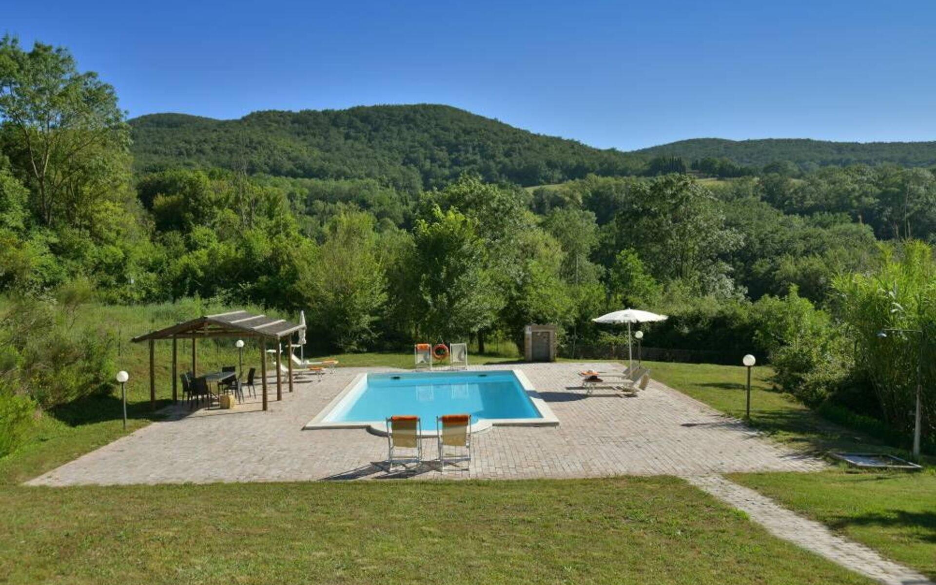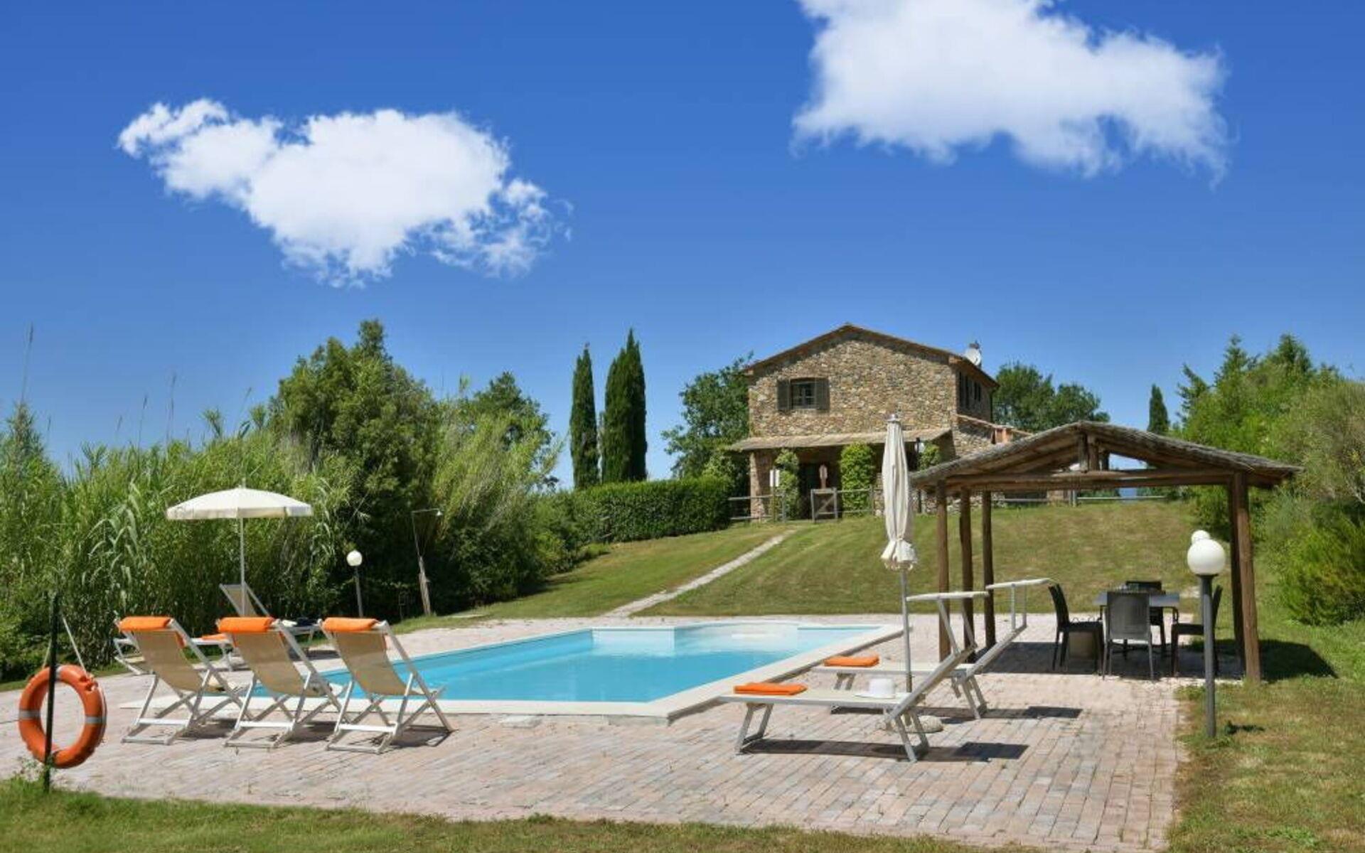 Villa Margherita ist der ideale Ort, um einen Urlaub inmitten der Schönheit der Toskana zu verbringen und sich zu entspannen, indem man die Düfte und Farben dieser herrlichen Landschaft genießt. Die Villa kann bis zu 8 Personen beherbergen und verfügt über einen großen Garten, der die Villa vollständig umgibt, und eine Veranda mit Esstisch und Grill, die den perfekten Ort für Ihre Urlaubstage darstellt. Vor der Villa befindet sich ein wunderschöner Panoramapool (10x5 m, 1,50 m tief) mit Außendusche, Liegestühlen und Sonnenschirmen, ideal für entspannende Momente inmitten der toskanischen Hügel. Auf der Seite des Pools befindet sich ein Pavillon mit einem Esstisch, ideal, um Ihren Abend unter dem Mondlicht am Pool zu verbringen, oder um sich an den wärmsten Tagen im Schatten zu erfrischen.