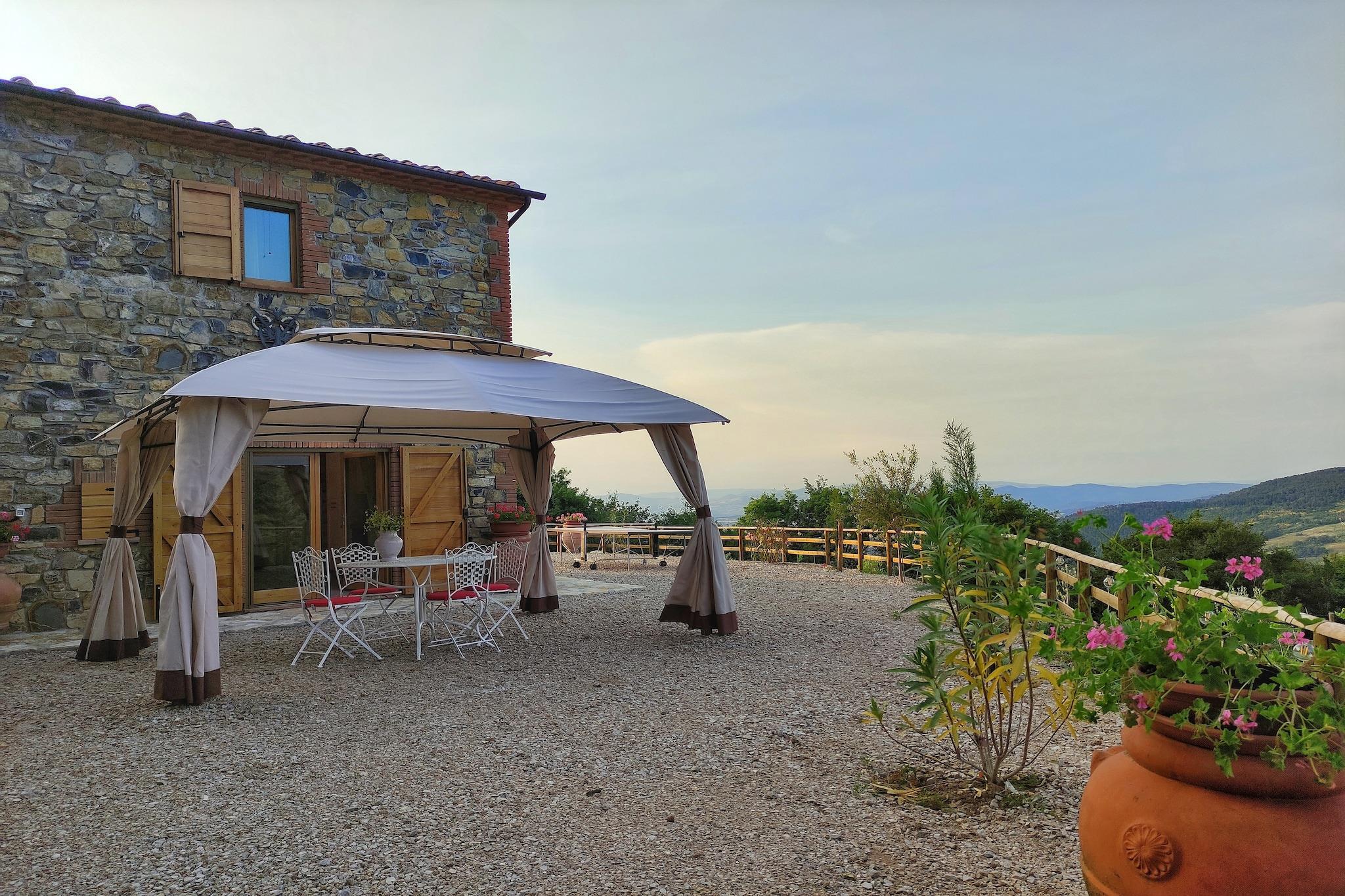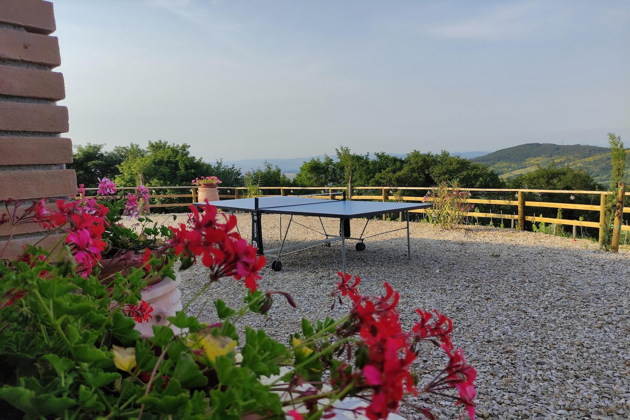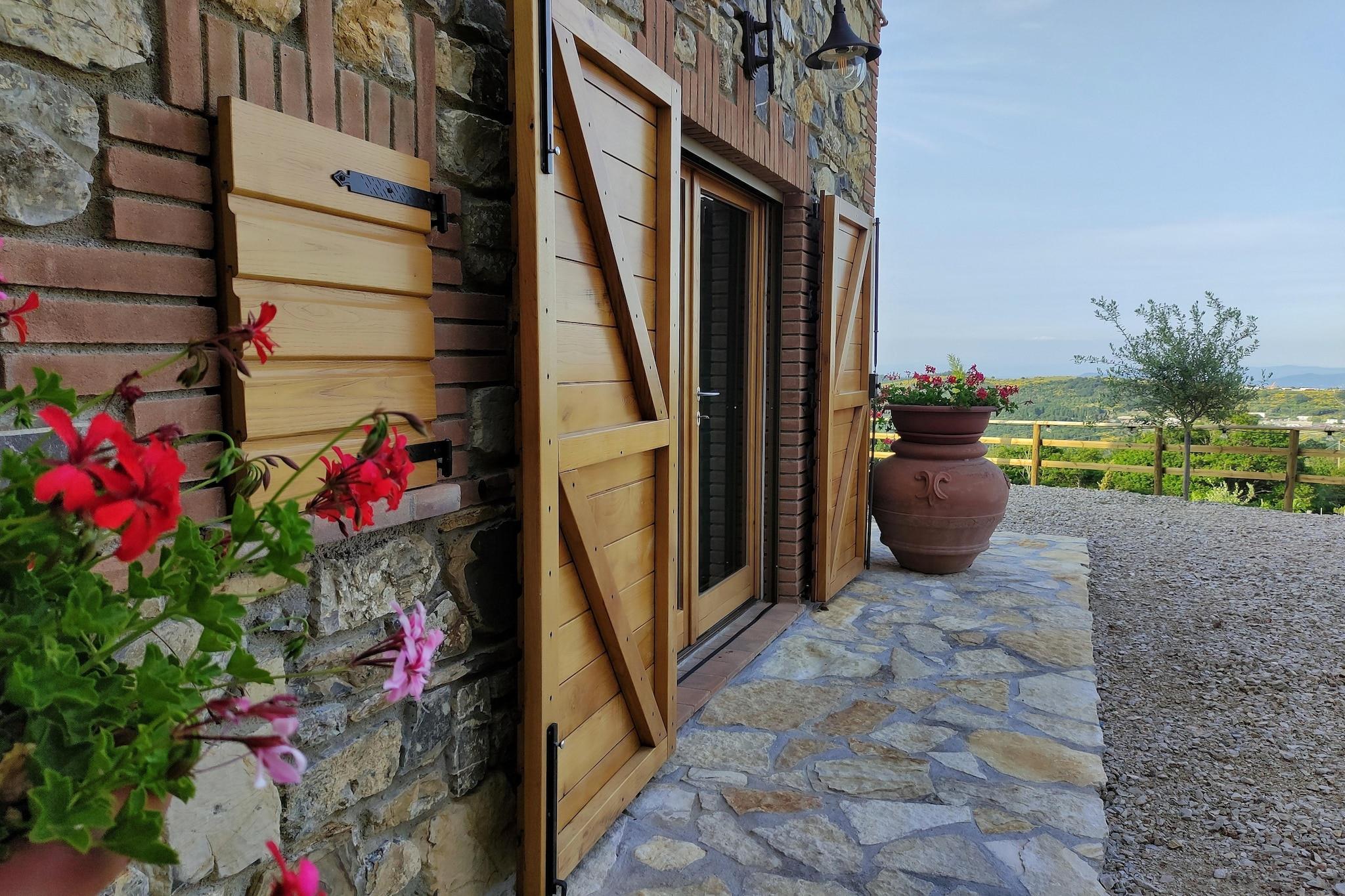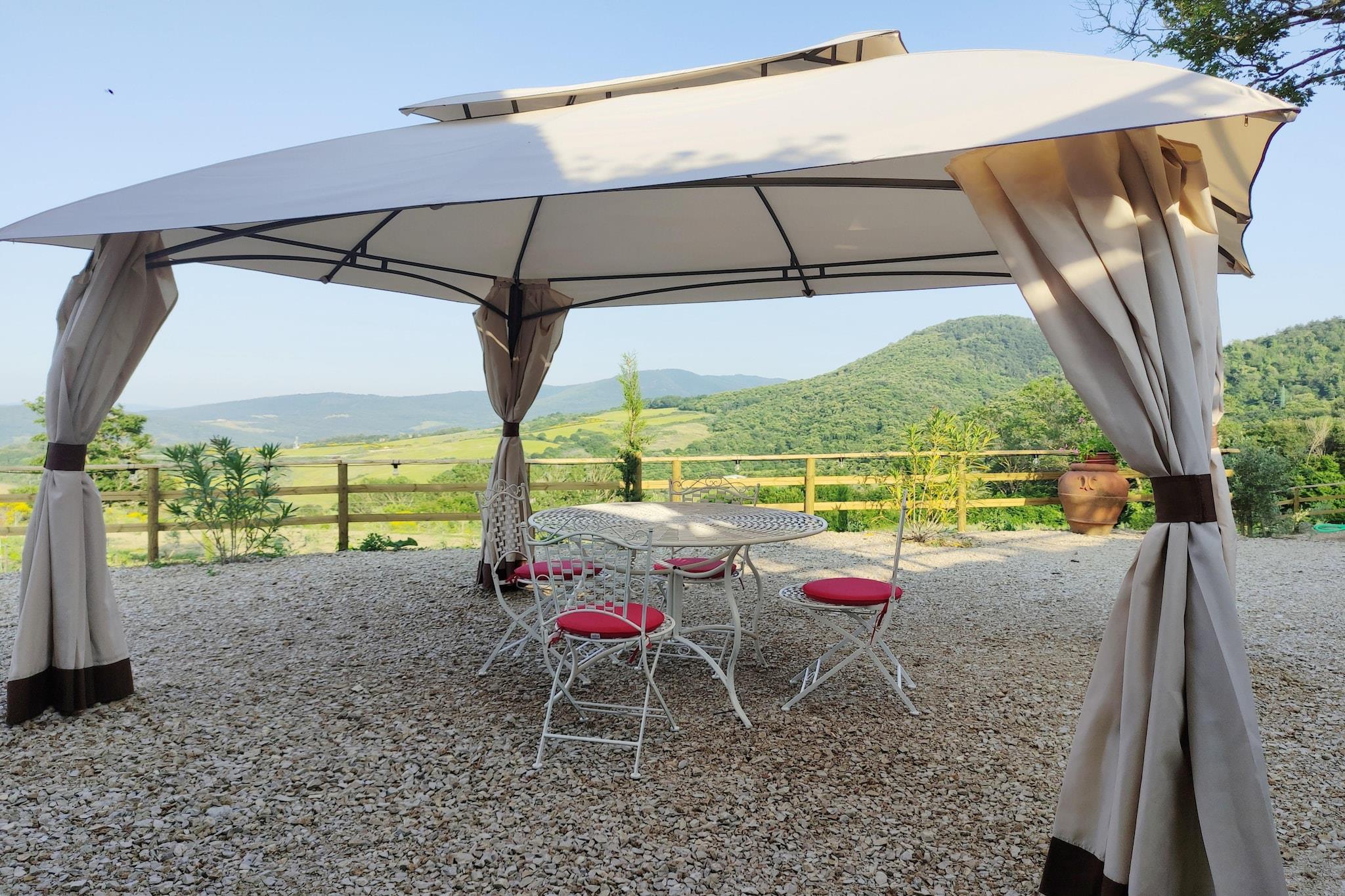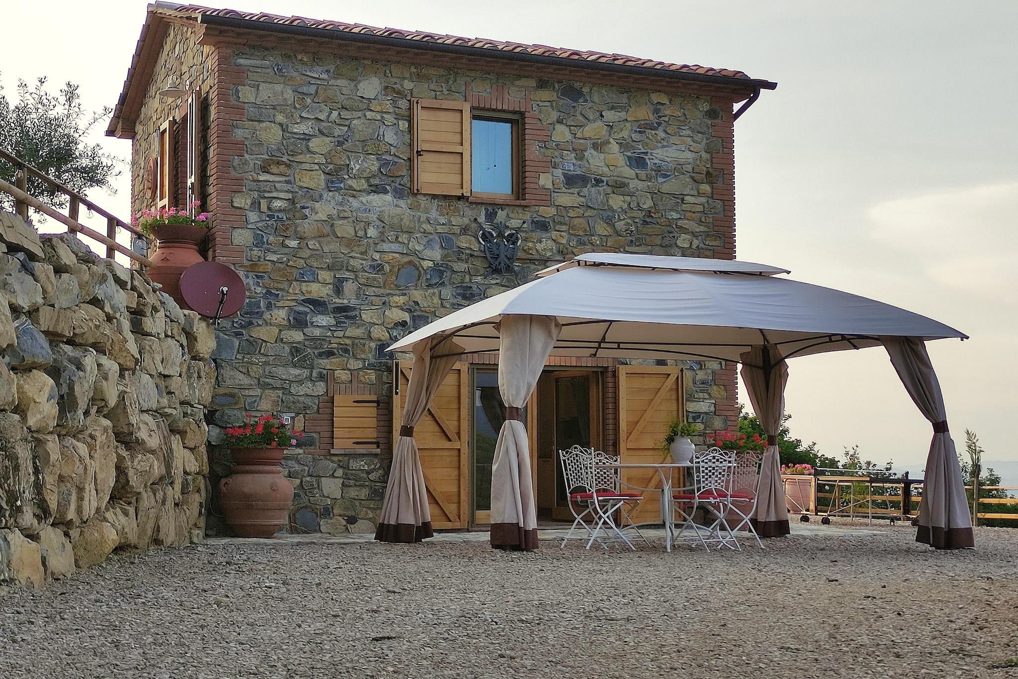 Bo i denne nye generations villa, som samtidig afspejler den rustikke toscanske stil med din familie. Den består af et soveværelse med dobbeltseng, stue med sovesofa til halvanden, tekøkken, badeværelse og stor privat have med swimmingpool. Den private swimmingpool måler 6x5x1,50 meter dyb, komplet med solarium med liggestole, parasoller, to lysthuse, grill. Ejendommen er tilgængelig via en privat vej omgivet af cypresser, oleandere og en privat port. Det har en dobbelt indgang og en indvendig vindeltrappe. Villaen ligger mellem Pisa, Siena og Grosseto og giver hurtig adgang til Toscanas smukke kunstbyer. Beliggende inden for 6 hektar parklandskab og en privat have, byder den på stier til behagelige gåture og trekking. Casa Vacanze Porrine ligger 40-60 km. fra Volterra og Siena, og kun 35 km fra de fantastiske strande i Follonica og Punta Ala. I nærheden fører et sving mod Leccia til udgravningerne af "Aque Populoniae", det største etruskiske og romerske termiske kompleks Sasso Pisano, Biolago tilbyder afslappende termiske vand, herunder et caldarium ved 36°C, et tepidarium og en fotorenset sø. Bygget i juni 2023, med særlig opmærksomhed på finish og materialer (tagbeklædning i gamle tagsten og lokale kastanjebjælker). Når det er muligt, vil gæsterne blive tilbudt en kurv med økologisk frugt og grønt med mulighed for at købe lokal BIO ekstra jomfru olivenolie. Villaen har også en skyggefuld boks til en parkeringsplads.